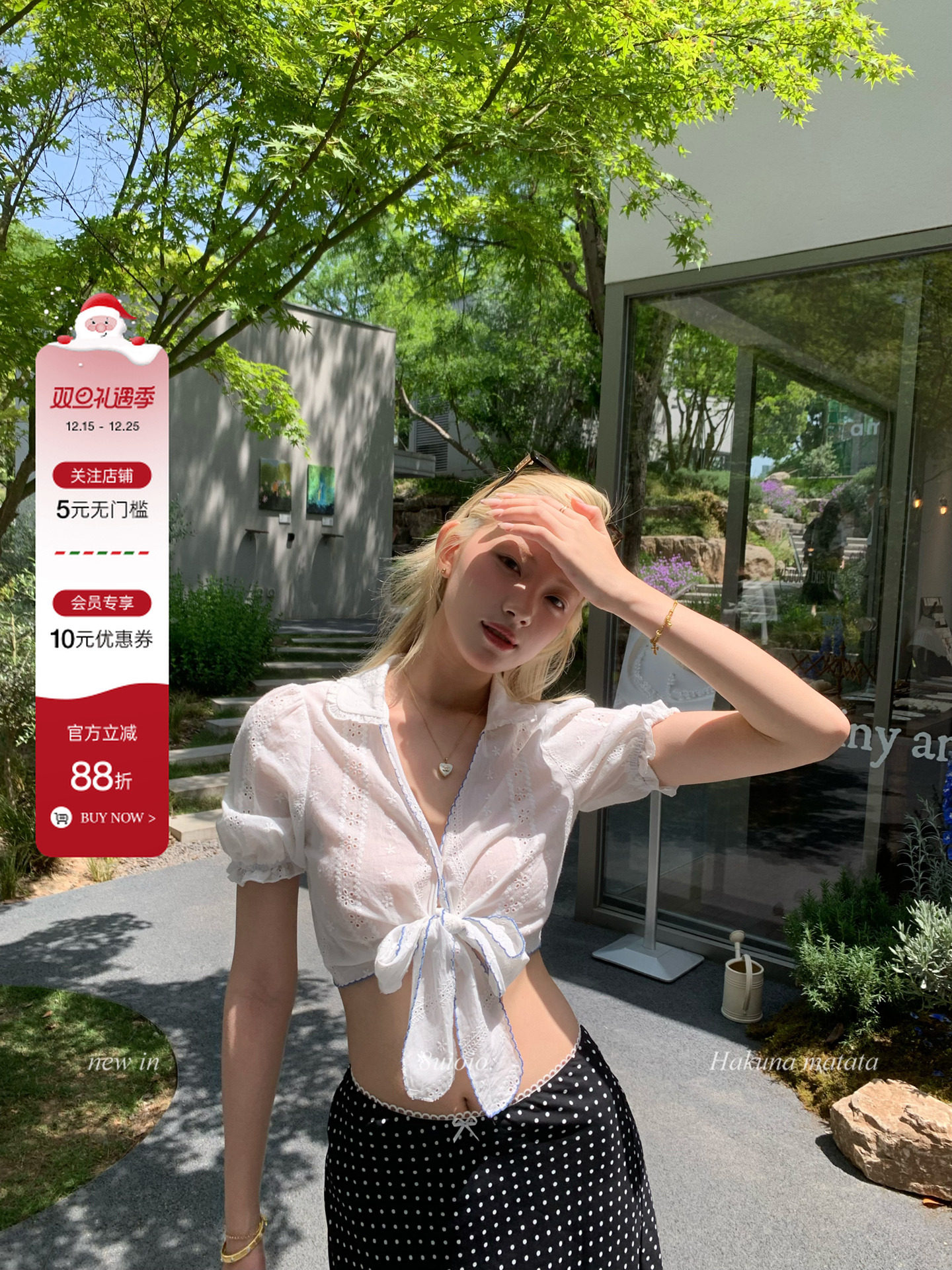 8Uioio Kanon Poetry French Jacquard Tie-Up Blouse Women's Summer 2025 New White Short-Sleeve Shirt Top
