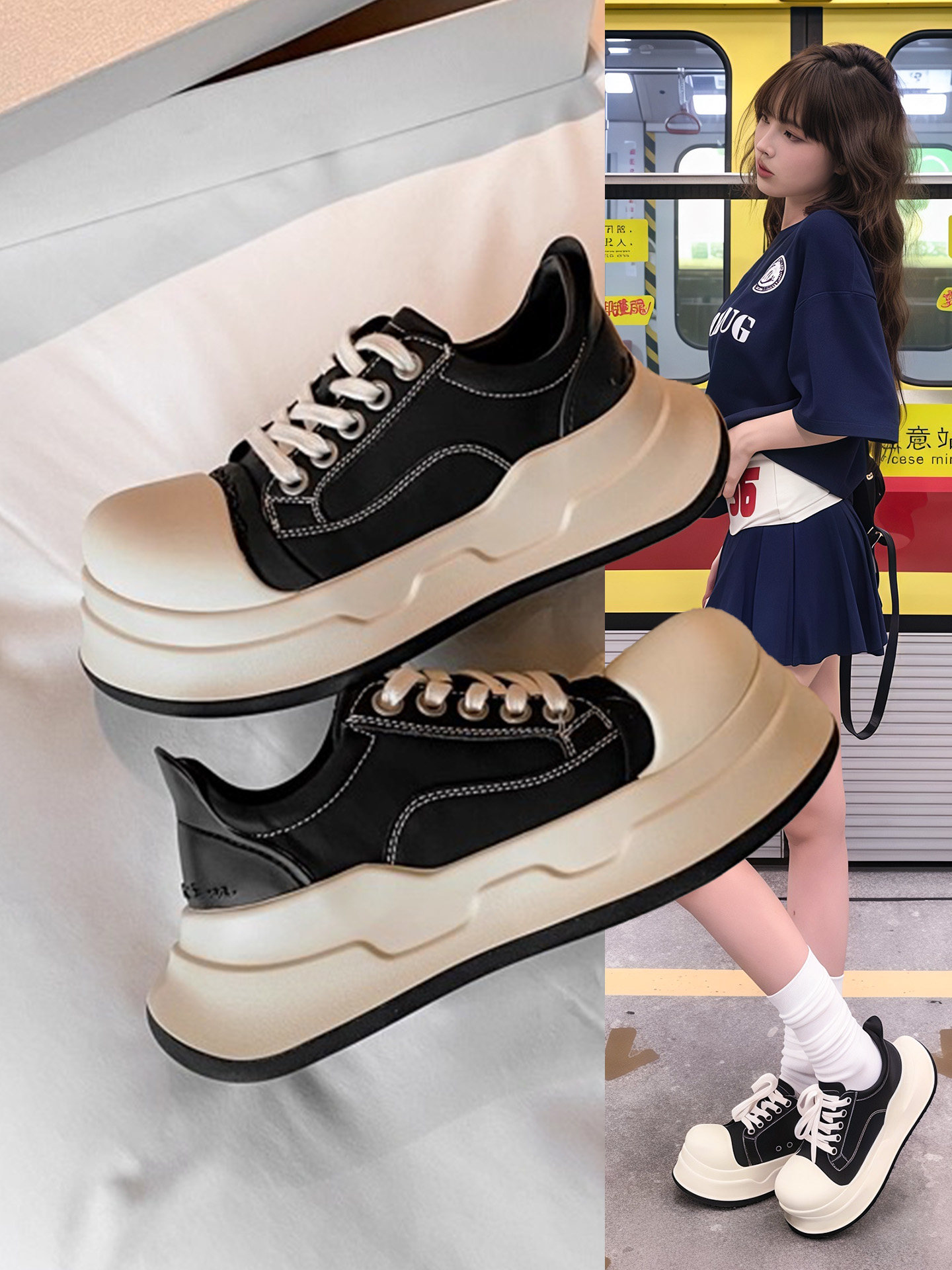 No Logo Low-Top Leather Height-Increasing Sneakers High Street Low-Top Black and White Genuine Leather Shoes