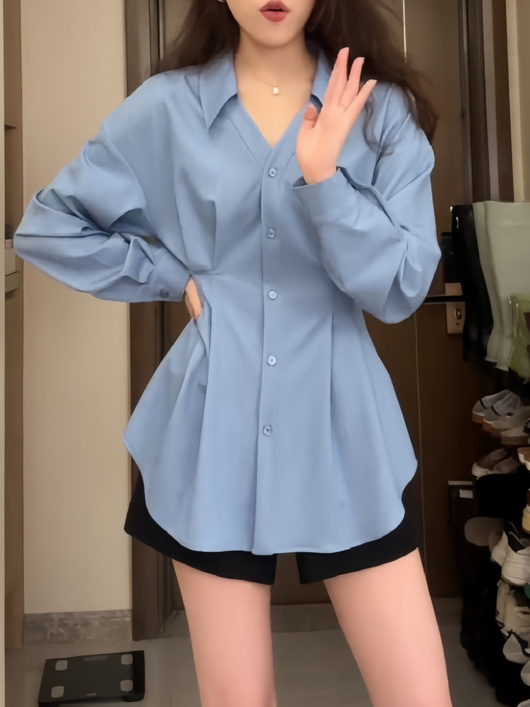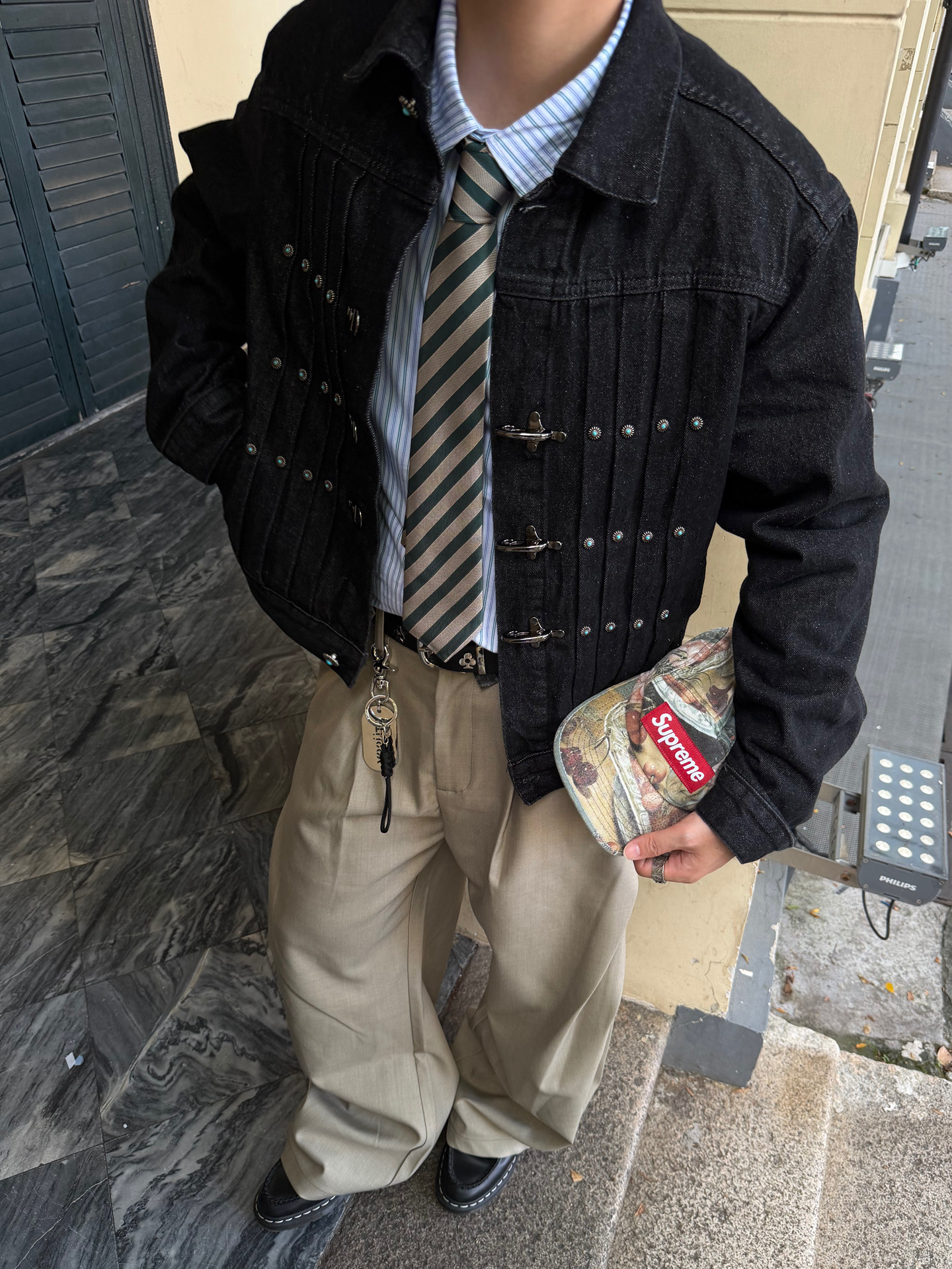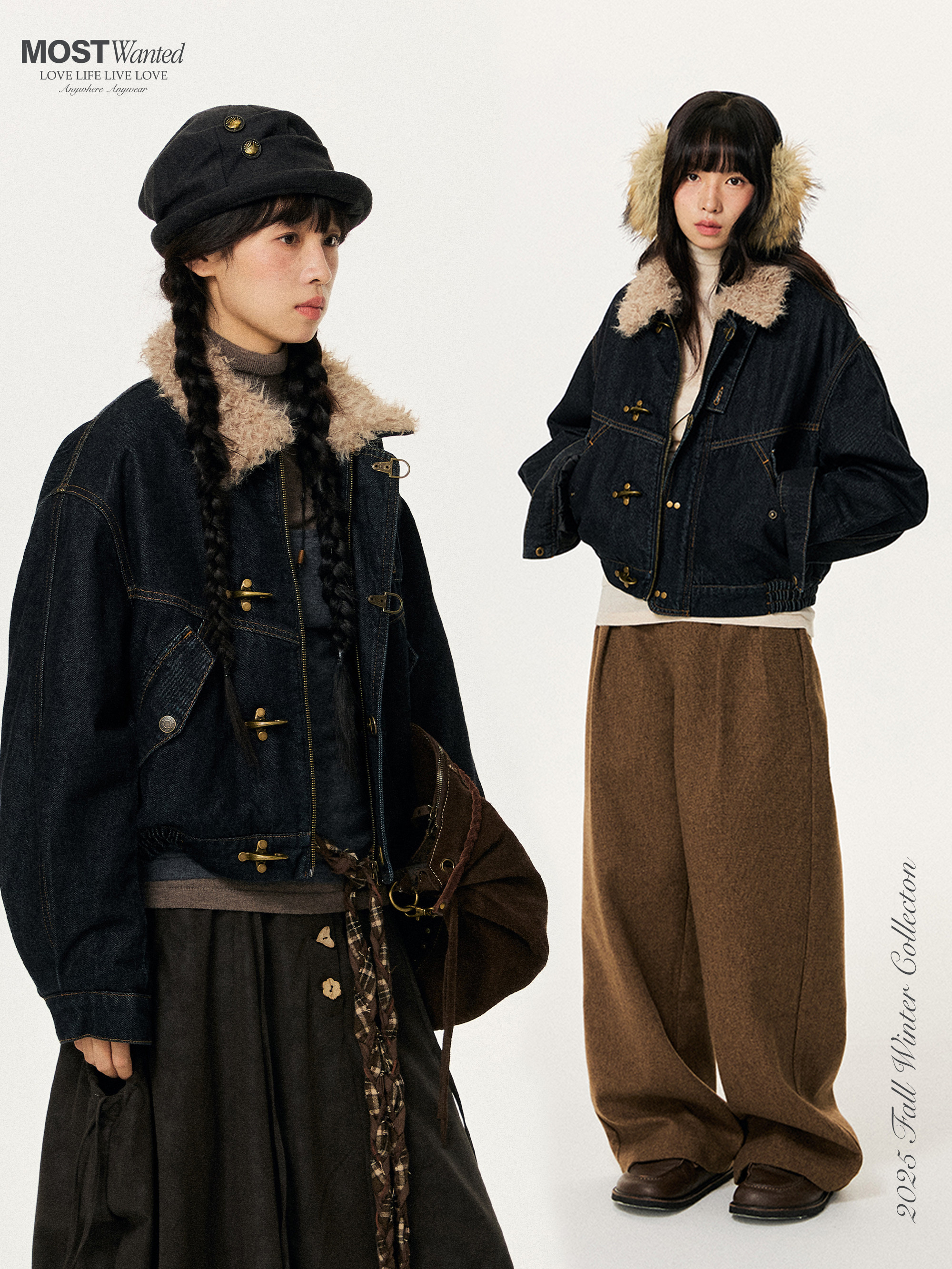 Fateegg American Retro Short Original Denim Jacket Boxy Casual Pleated Design with Airplane Buckle Coat