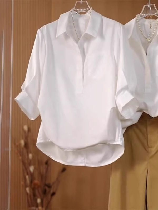 Plus-Size Designer Pure Cotton White Short-Sleeve Shirt for Women, Early Spring New Style, Slimming Casual Versatile Turn-Down Collar Top for Curvy Women
