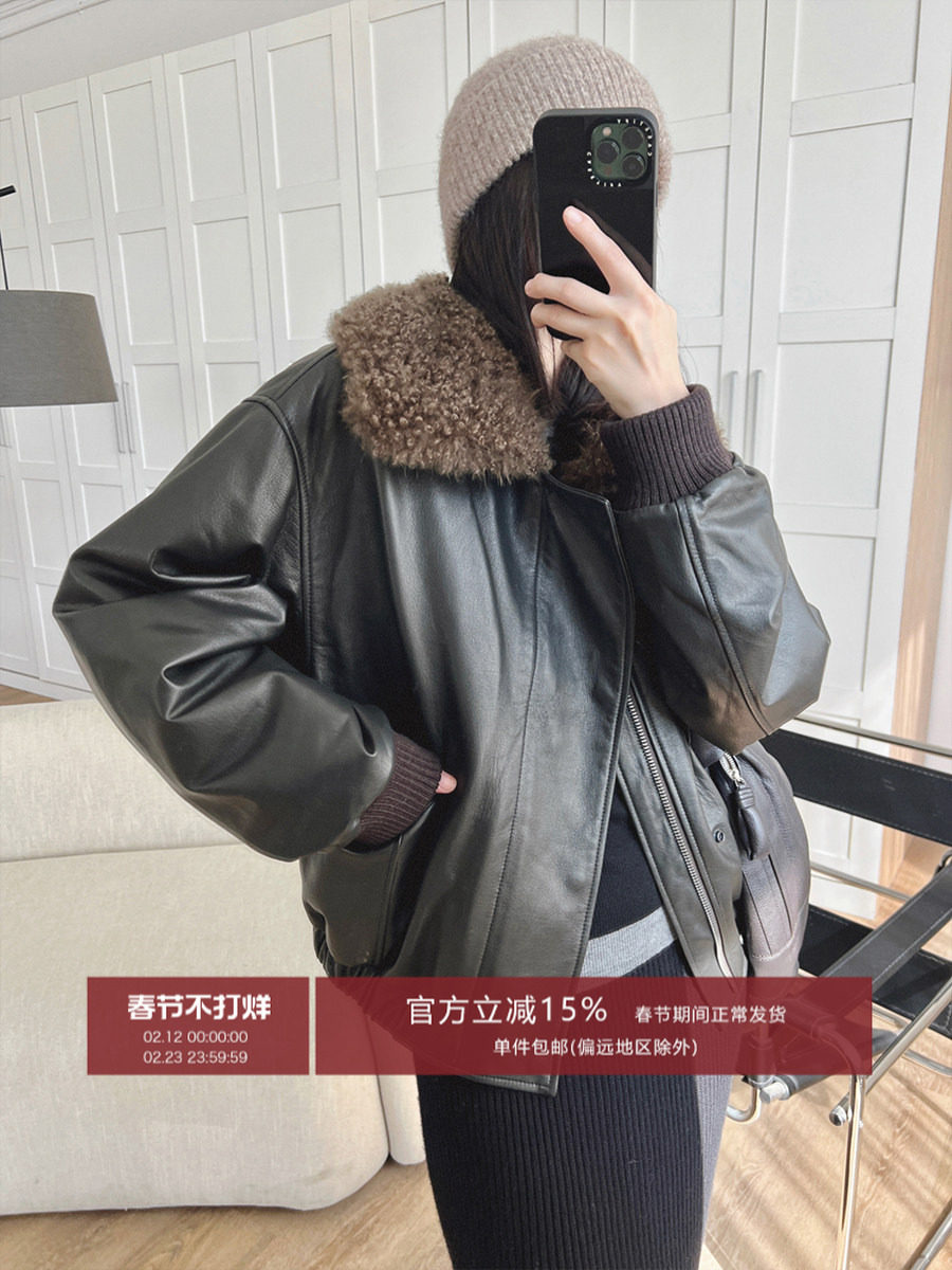 Amyy Studios Jin Brand Calfskin Quilted Cashmere Fur Integrated Lapel Bomber Leather Jacket