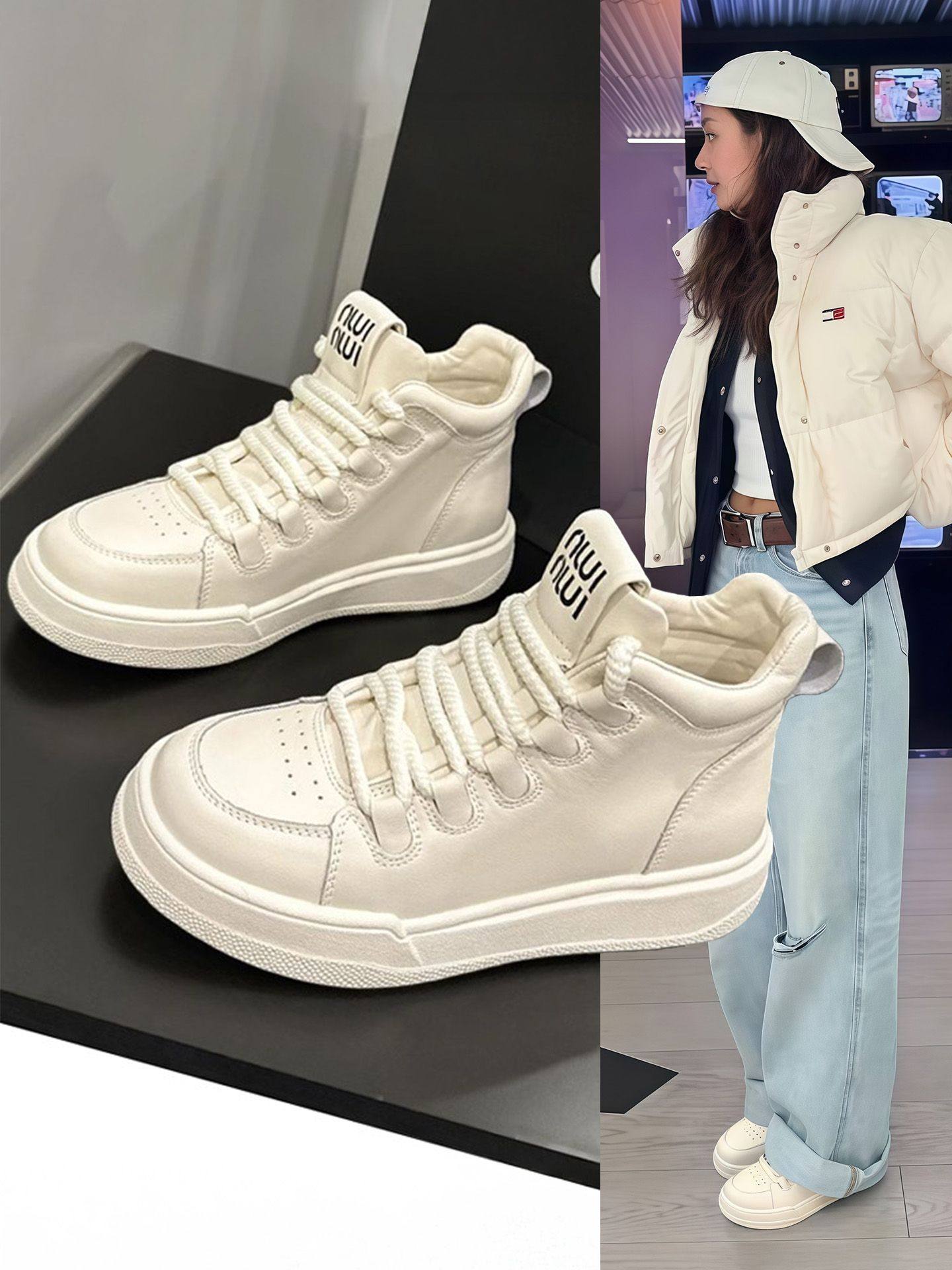 Hong Kong Korean Style White High-Top Shoes for Women 2025 Spring and Autumn New Genuine Leather Casual Yunda Platform Shoes Thick-Soled Sneakers
