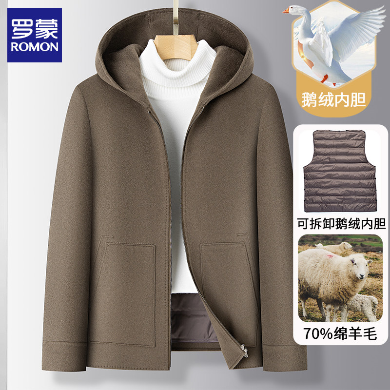 Romon Hooded Woolen Outwear Men's Winter Short Wool Outwear with Removable down Liner Double-Sided Woolen Jacket