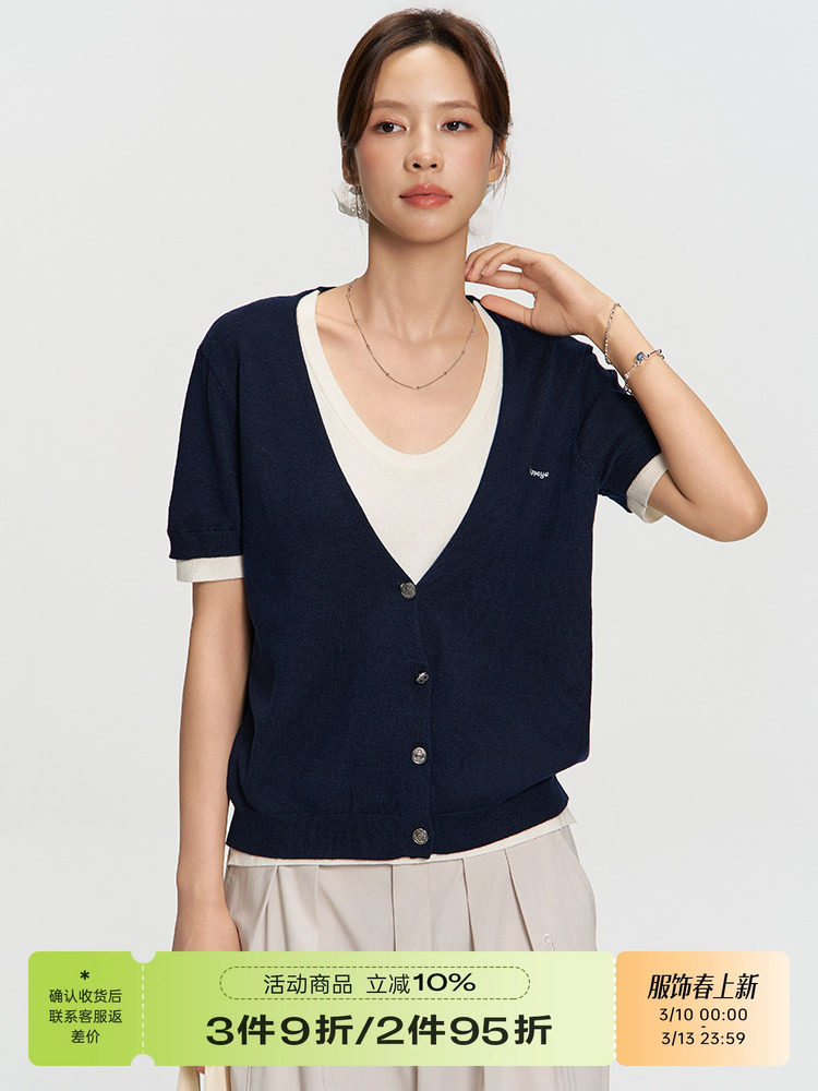 Rappeye Design Sense Color-Blocked Round Neck Slimming Cardigan Versatile Top Fake Two-Piece Knitted Short-Sleeve T-Shirt for Women