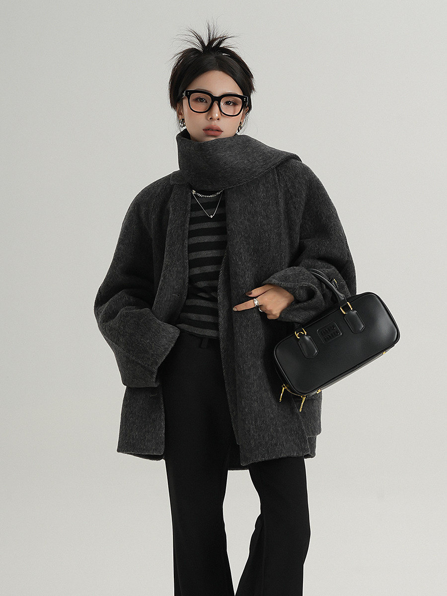 Srys Ame High-End Short Woolen Coat with Scarf, Gray Woolen Coat, Winter Cashmere Coat