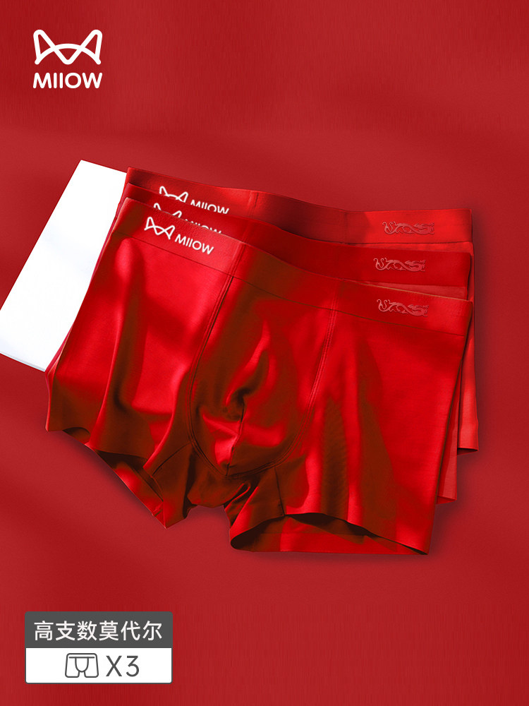 Cat-Themed Red Underwear for Men, Red Ice Silk Feel Boxer Briefs, 2025 Men's Wedding Year of the Horse Shorts