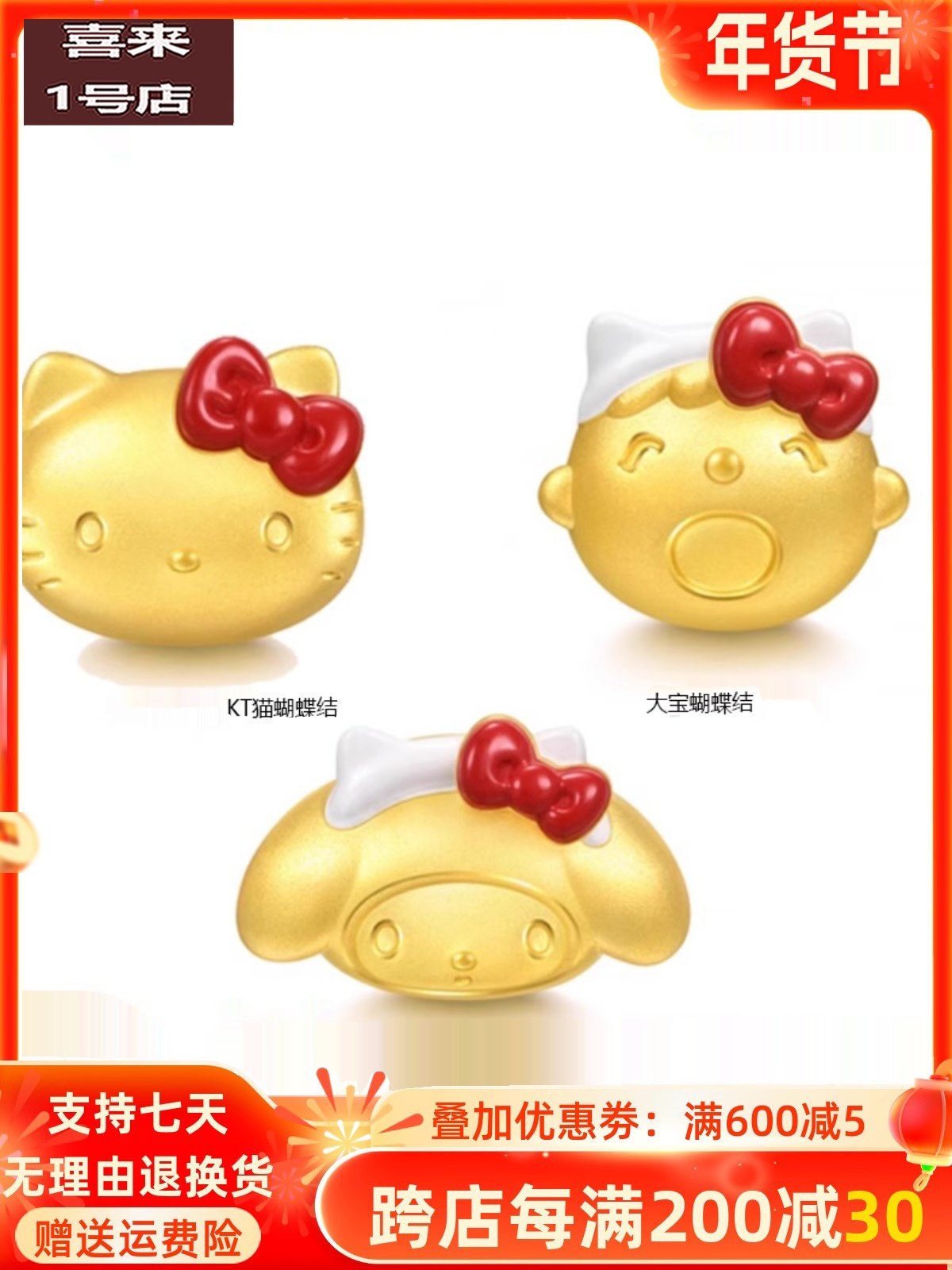 999 Gold Bow Kt Cat Pure Gold My Melody Anniversary Bead Transfer Bead Large Treasure Gold Jewelry Bracelet Gift for Girlfriend
