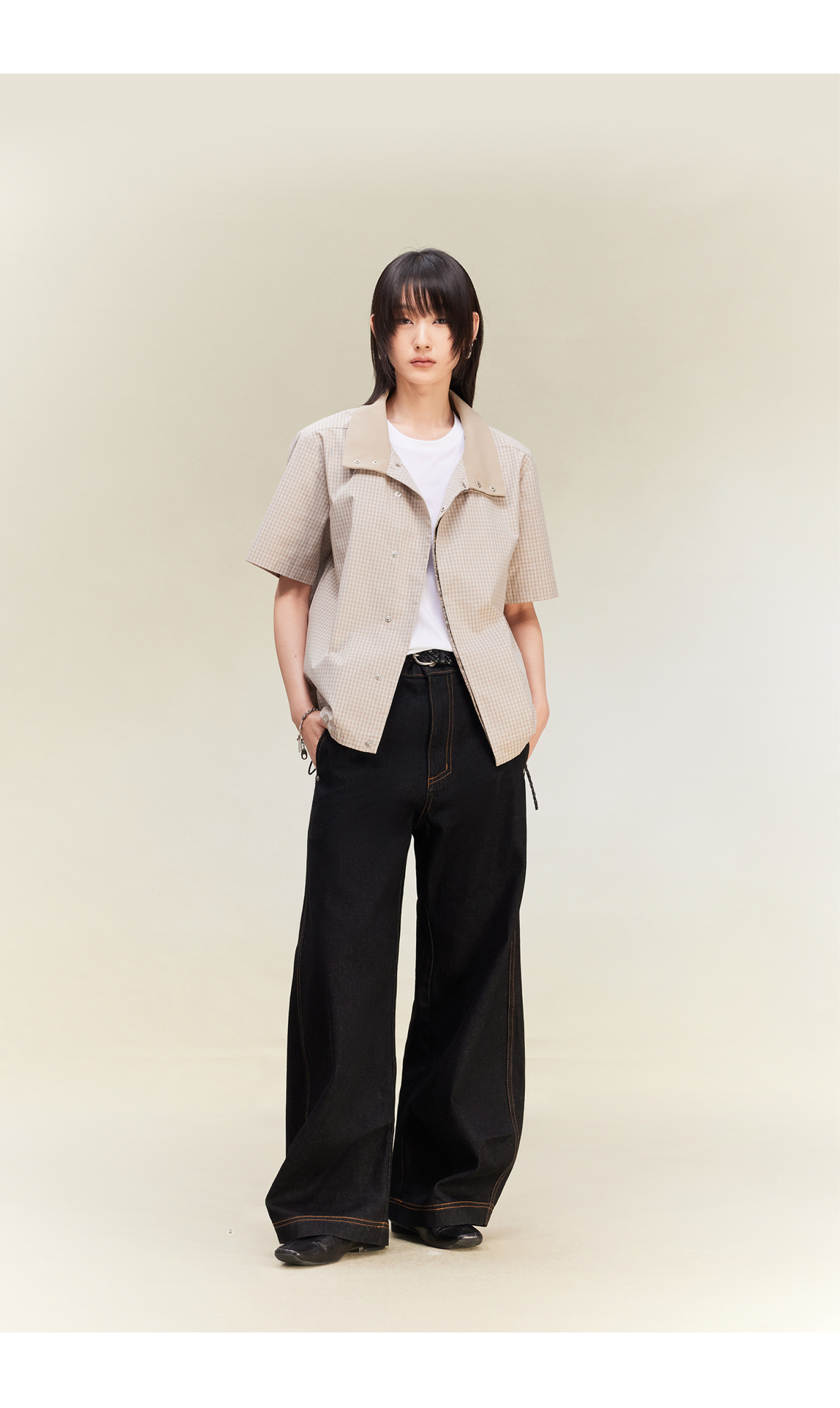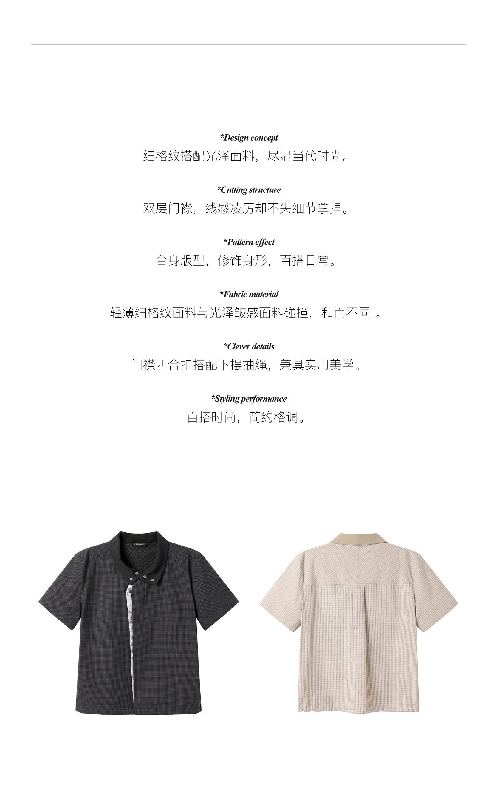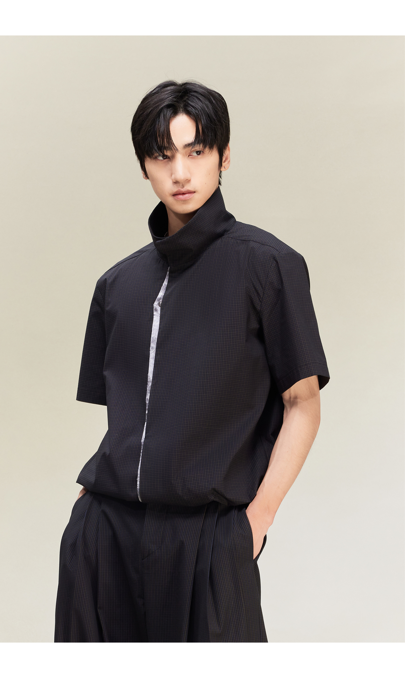 Yunyi [Akira Kurosawa] Stand-Up Collar, Contrasting Material, Diagonal Placket, Color-Blocking, Plaid Drawstring Short-Sleeve Shirt