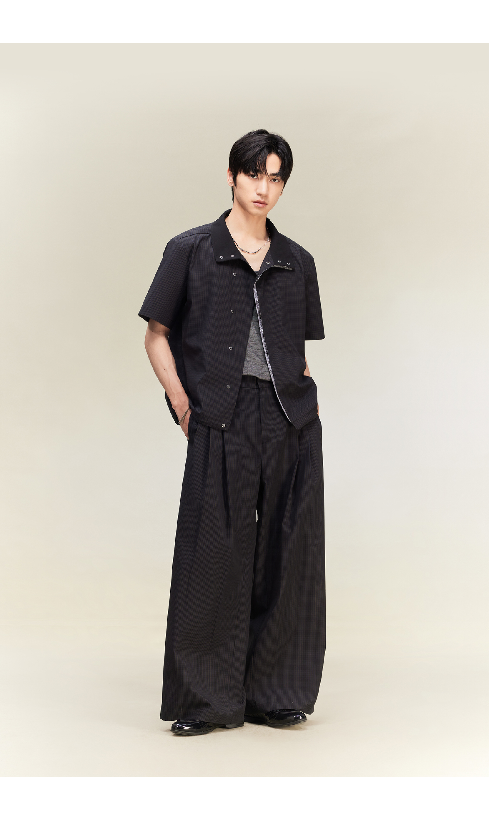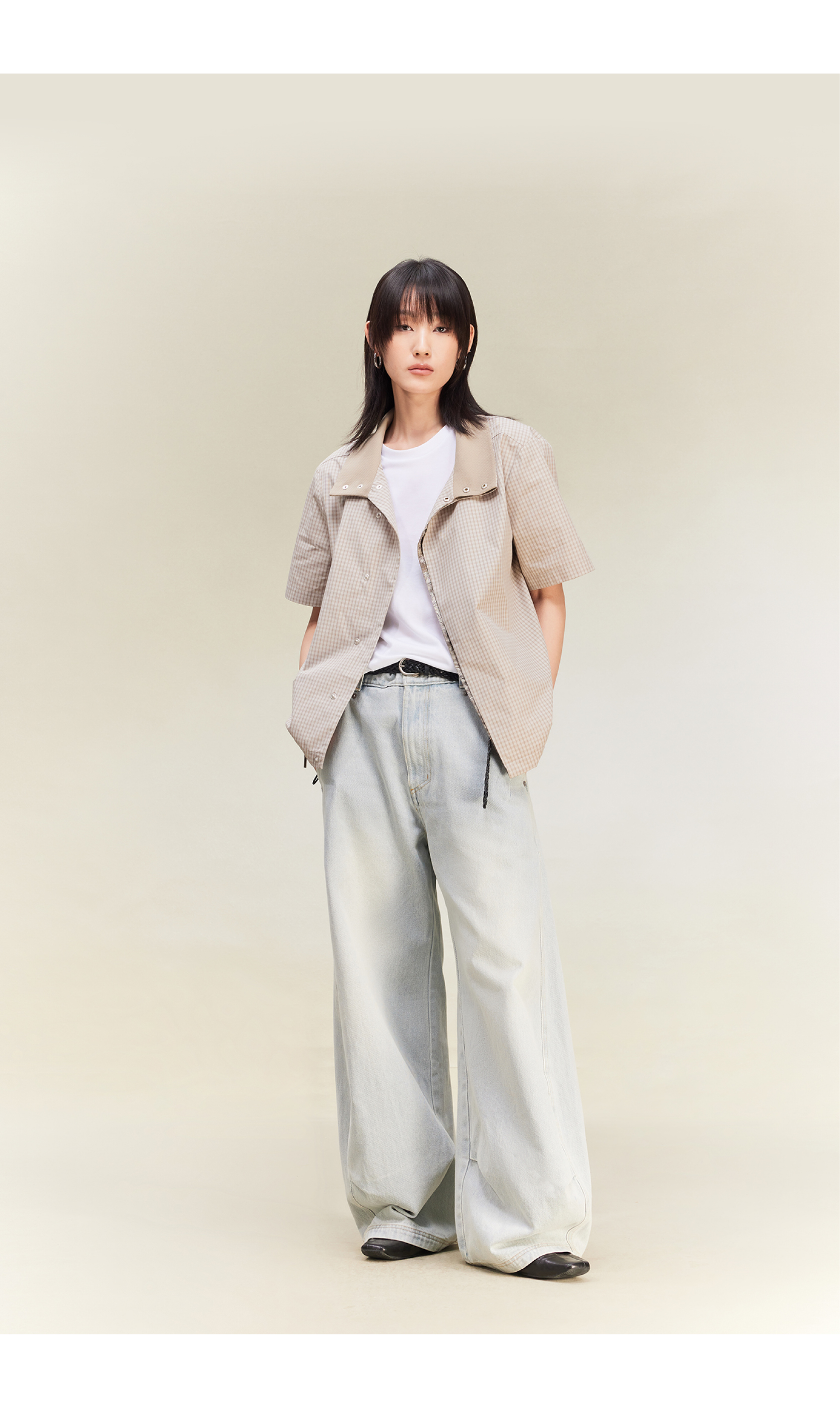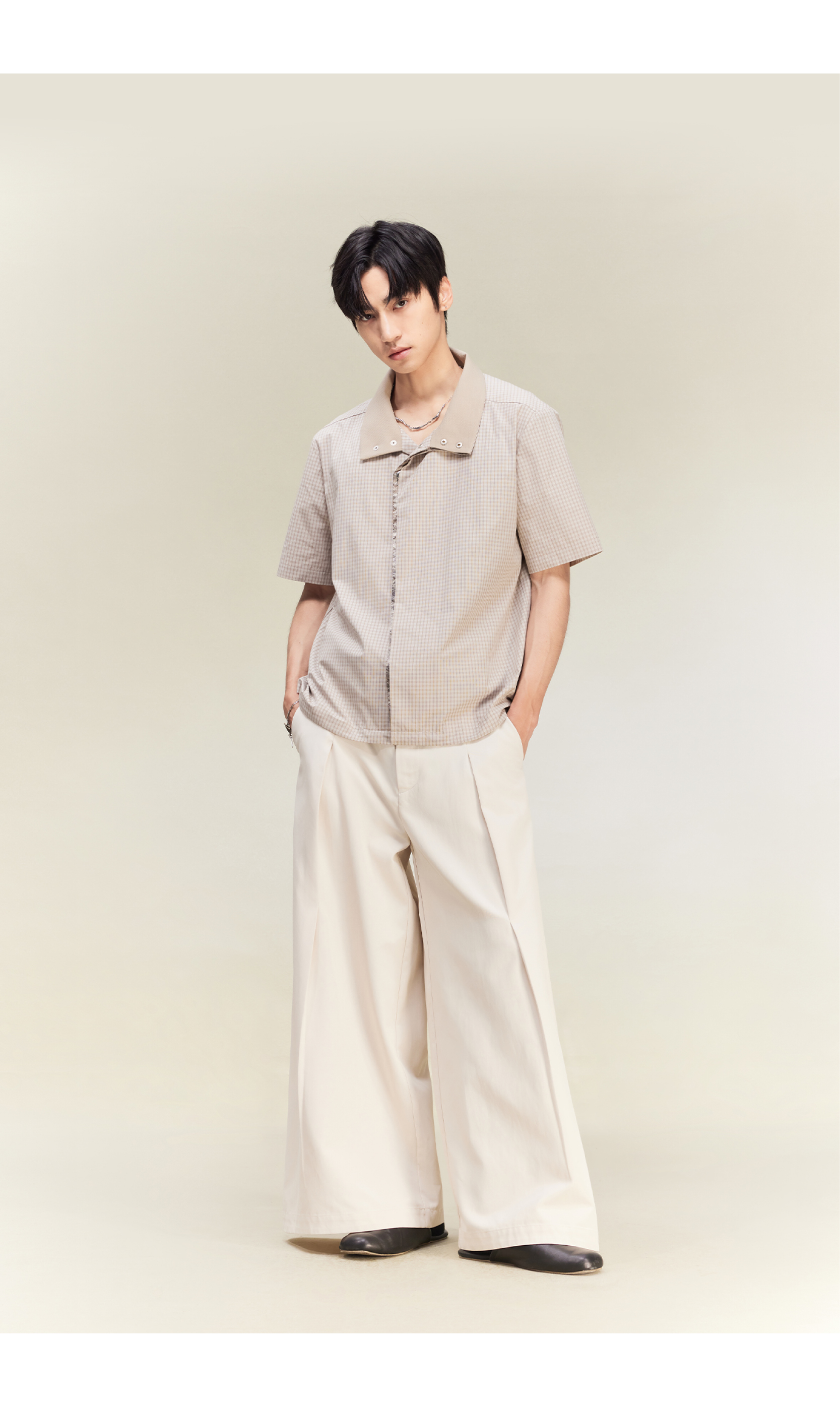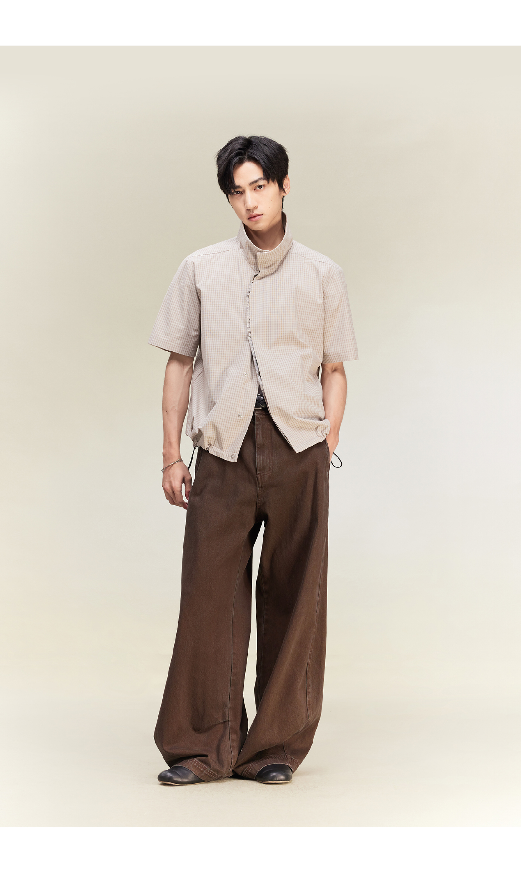 Yunyi [Akira Kurosawa] Stand-Up Collar, Contrasting Material, Diagonal Placket, Color-Blocking, Plaid Drawstring Short-Sleeve Shirt