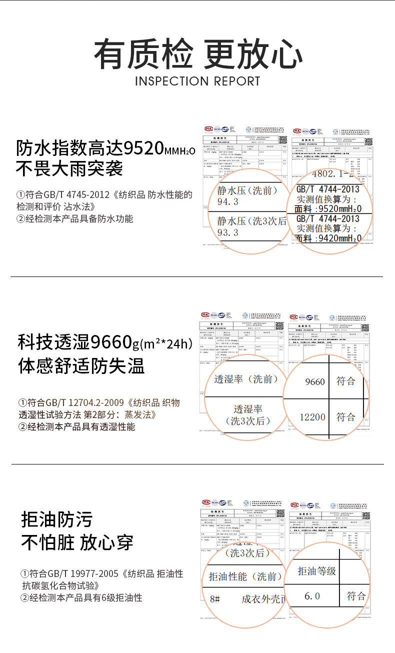 页面上所有款式防水,耐磨,透湿等数据经由第三方检测机构测试所得,仅代表面料单次测试结果。