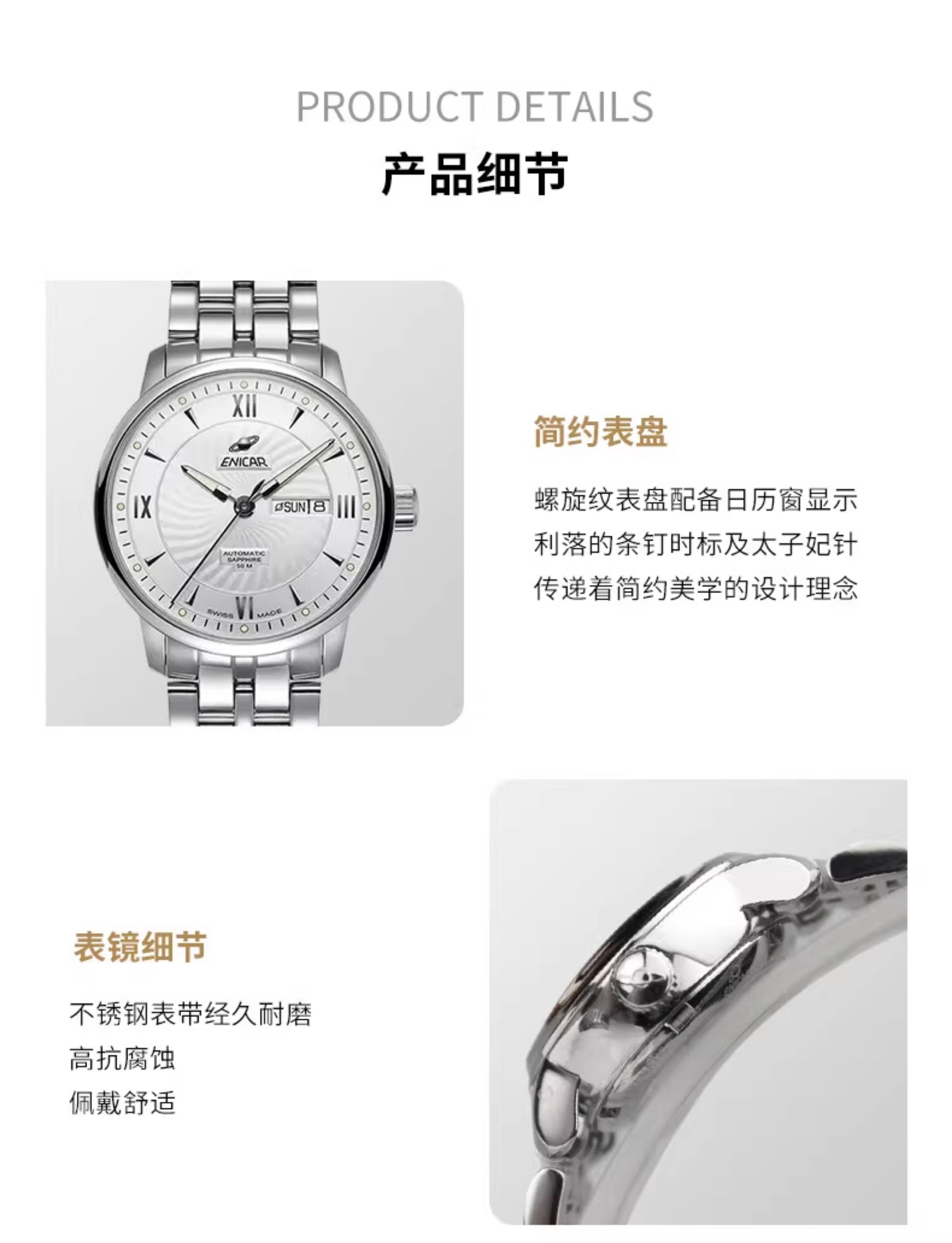 [Official Genuine] Enicar Men's Watch Women's Light Luxury Watch Swiss Couple's Mechanical Watch