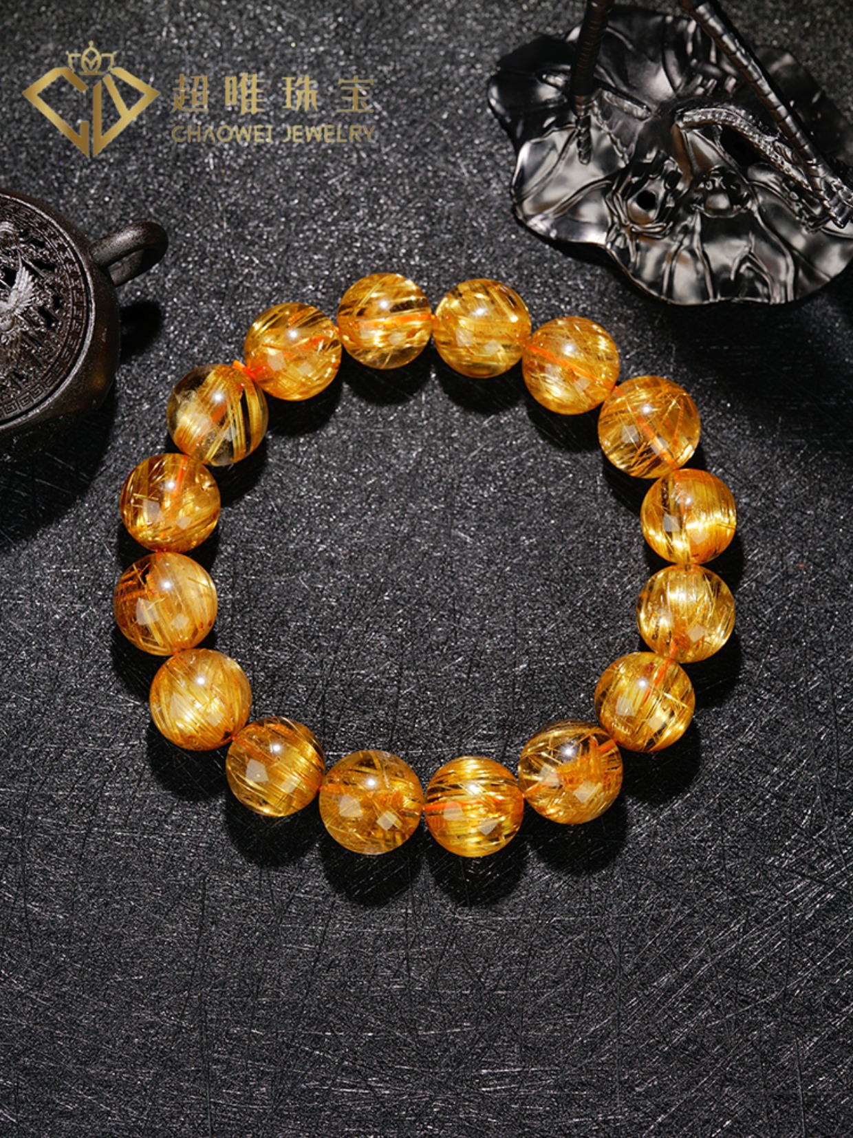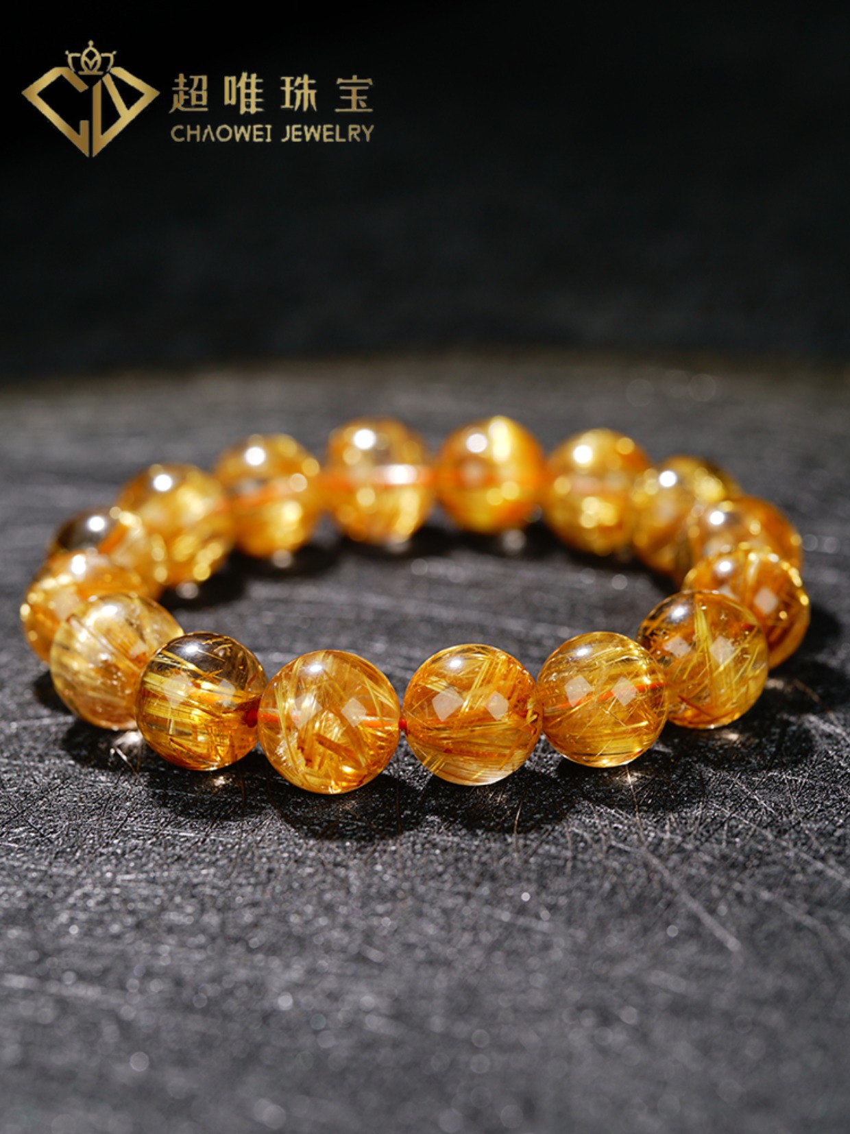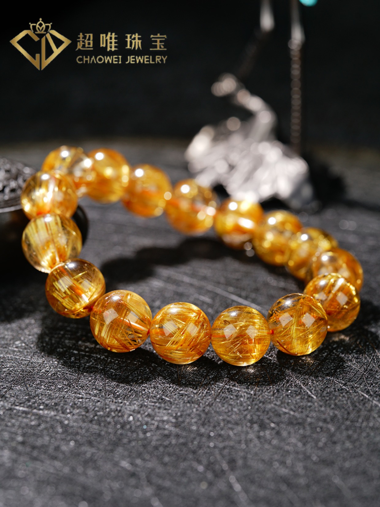 Super Unique Jewelry Smooth Hair Cat's Eye Golden Rutilated Quartz Titanium Crystal Bracelet for Men and Women, Collectible Grade, Good Luck and Wealth Natural Crystal Bracelet