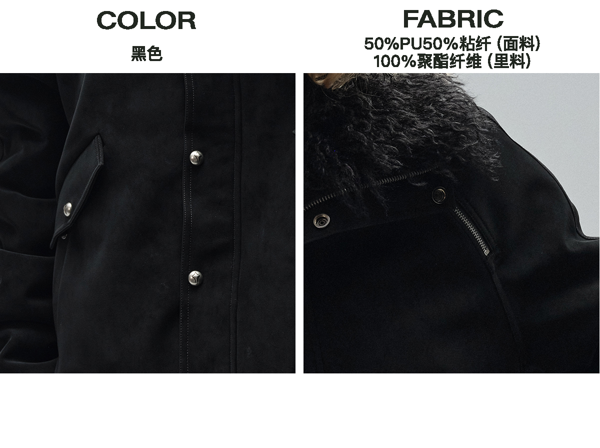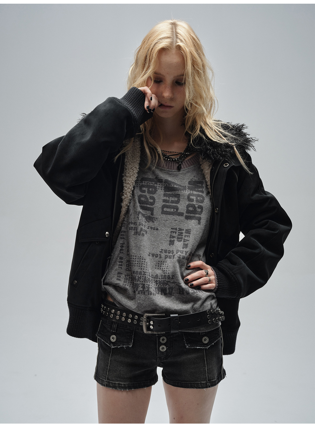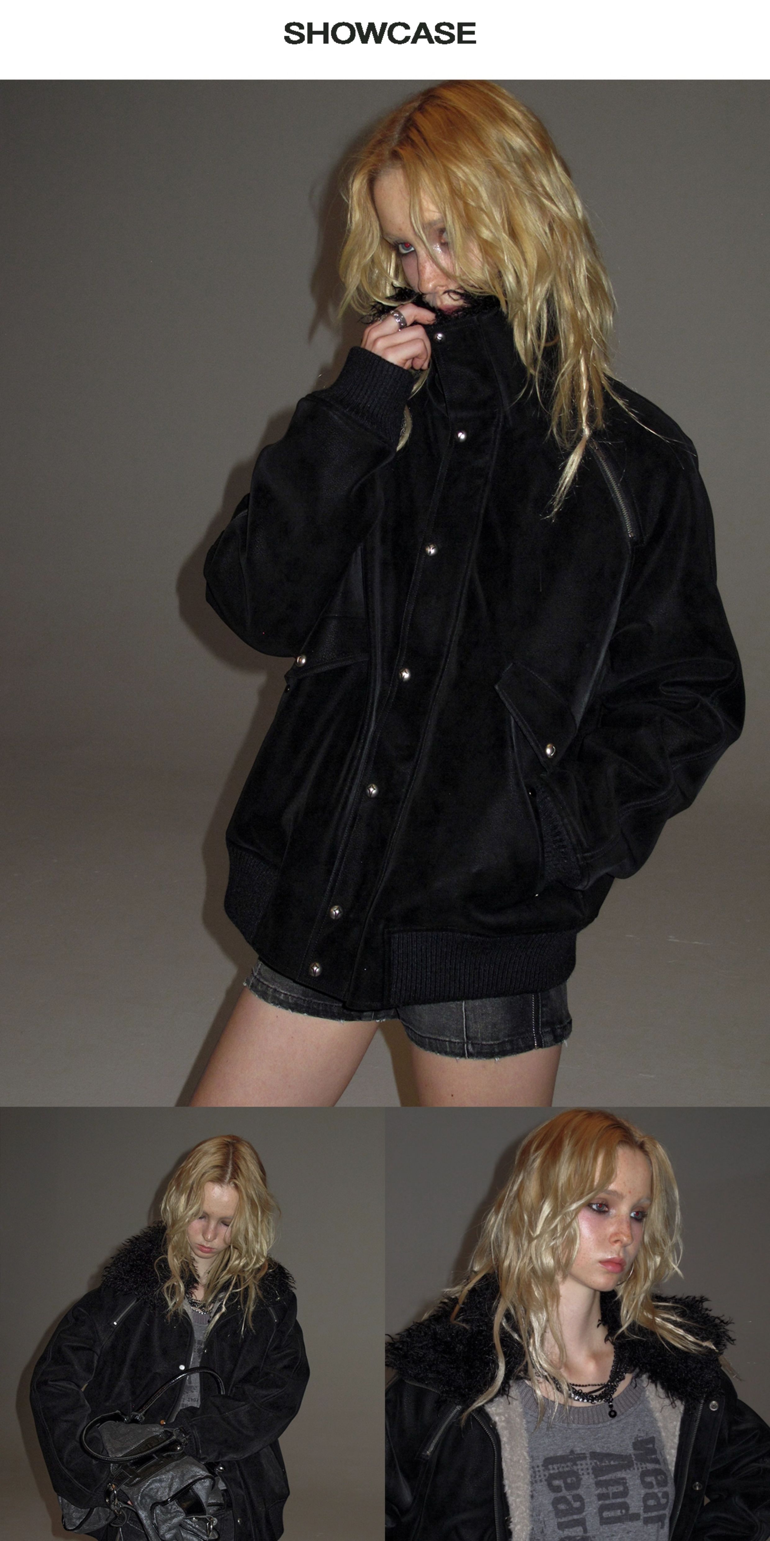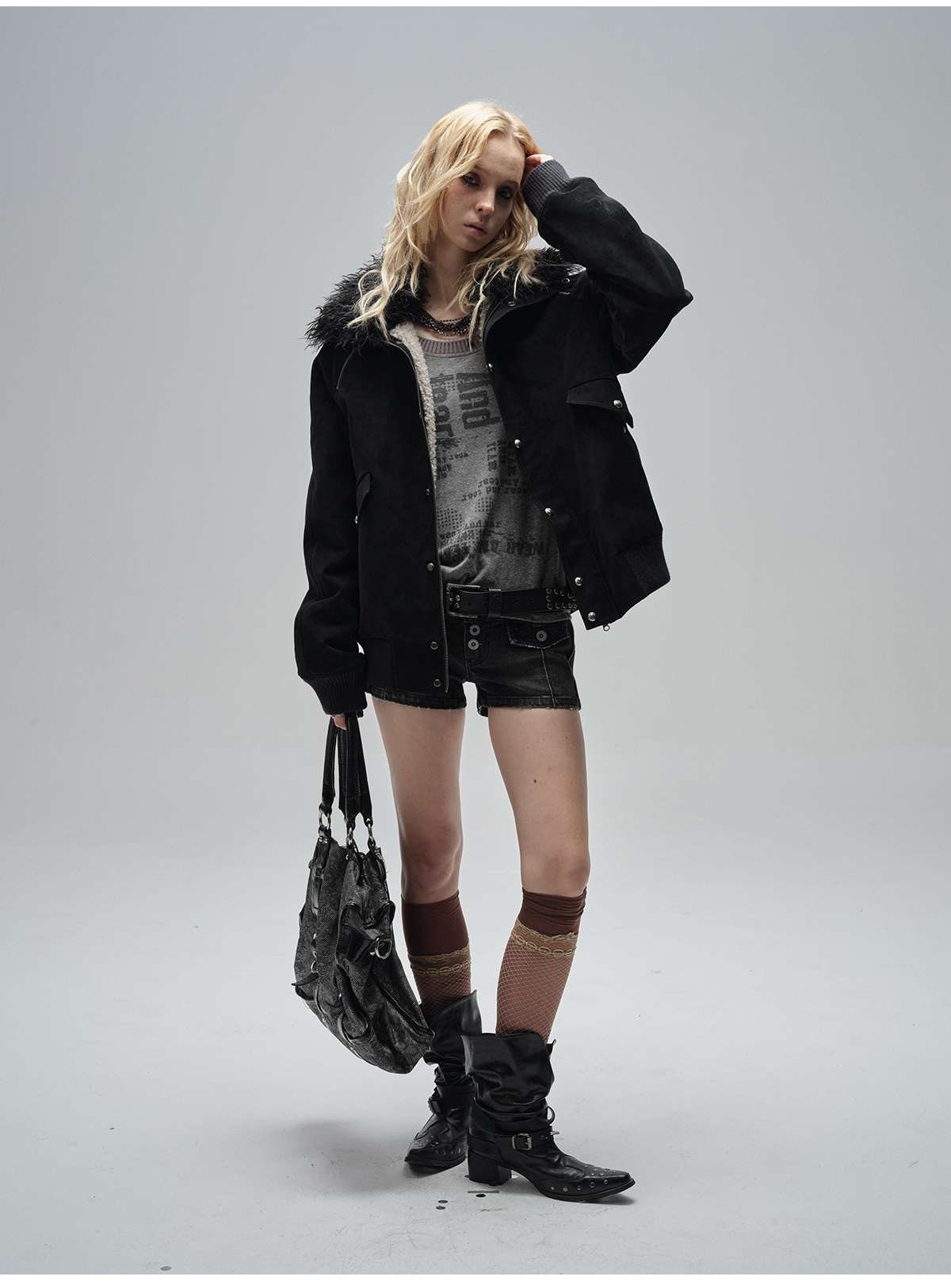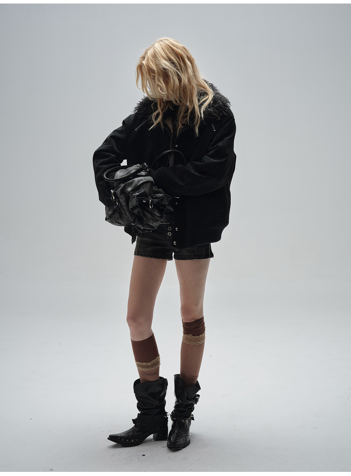 Wearandtear Large Fur Collar Beach Wool Stand-Up Collar Zipper Metal Buckle Decoration Loose Fleece-Lined Lamb Fur Coat