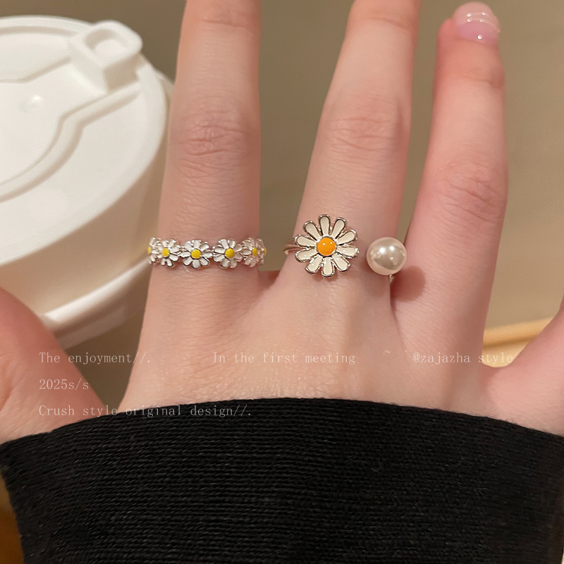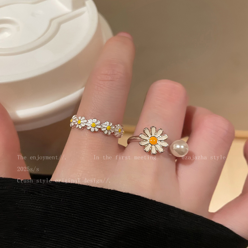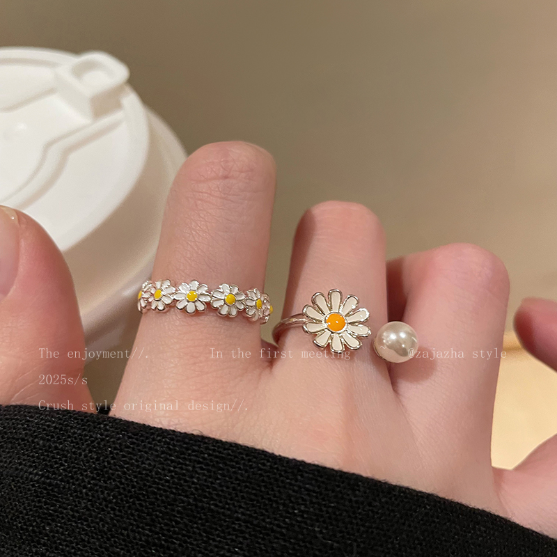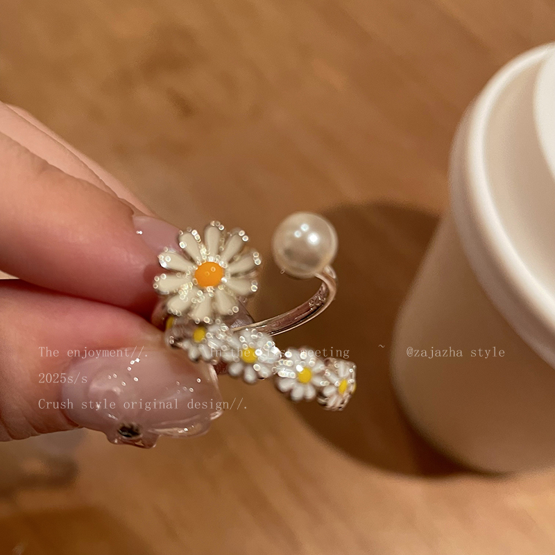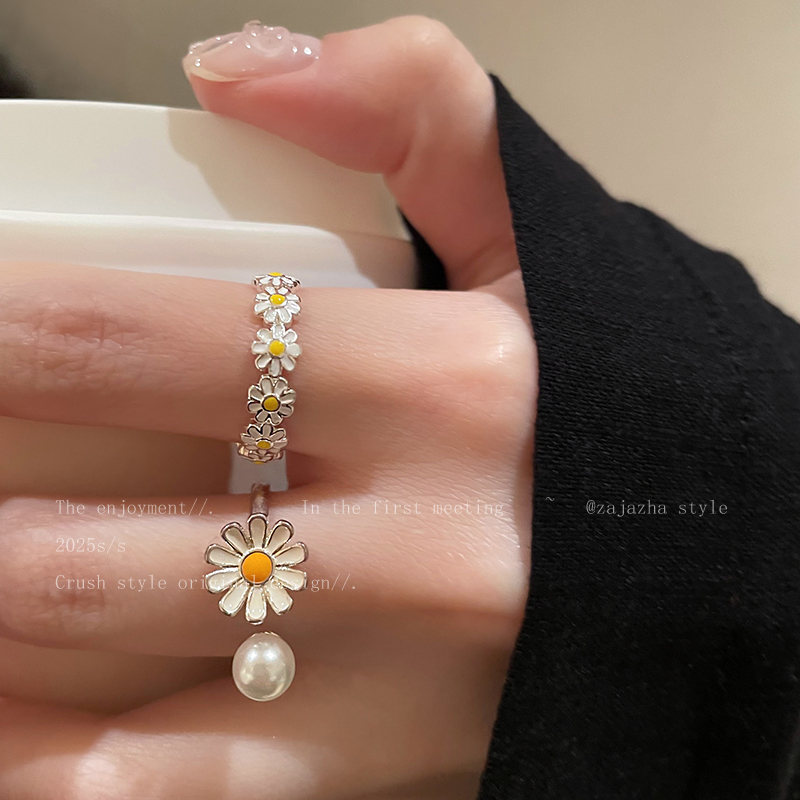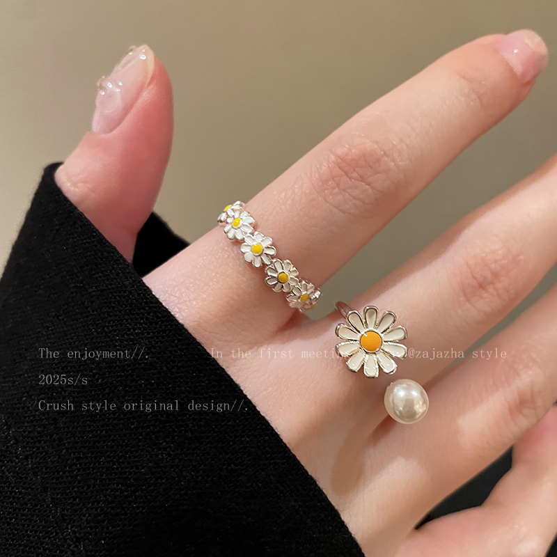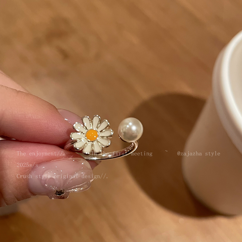 Daisy Flower Pearl Open Ring for Women, Light Luxury, High-End, Niche, Exquisite Index Finger Ring, Cute Stacking Ring