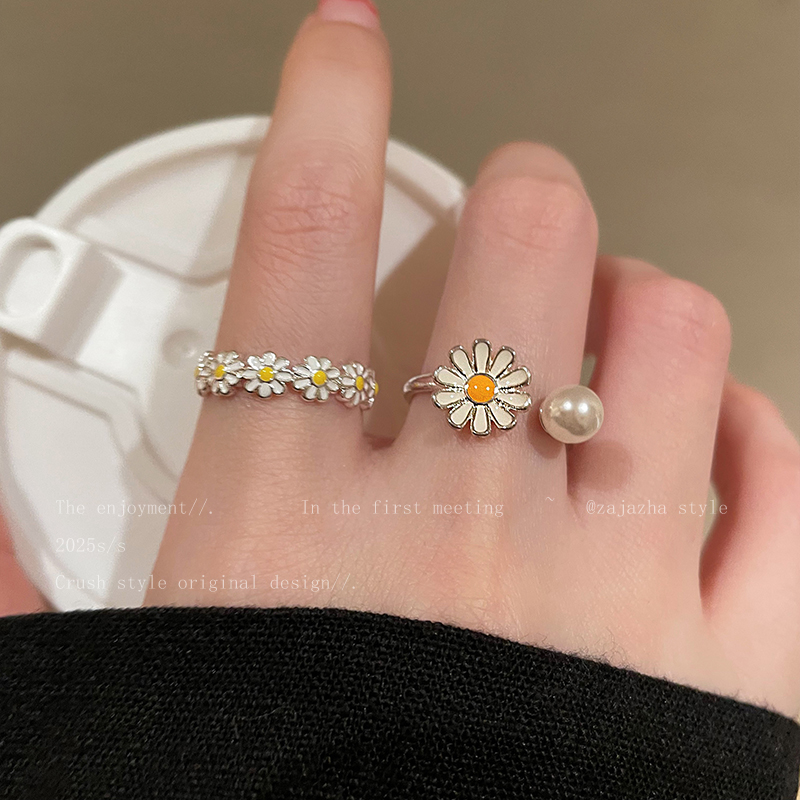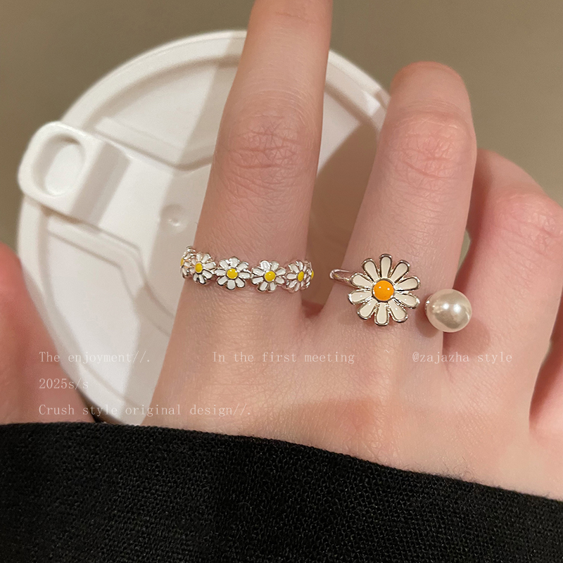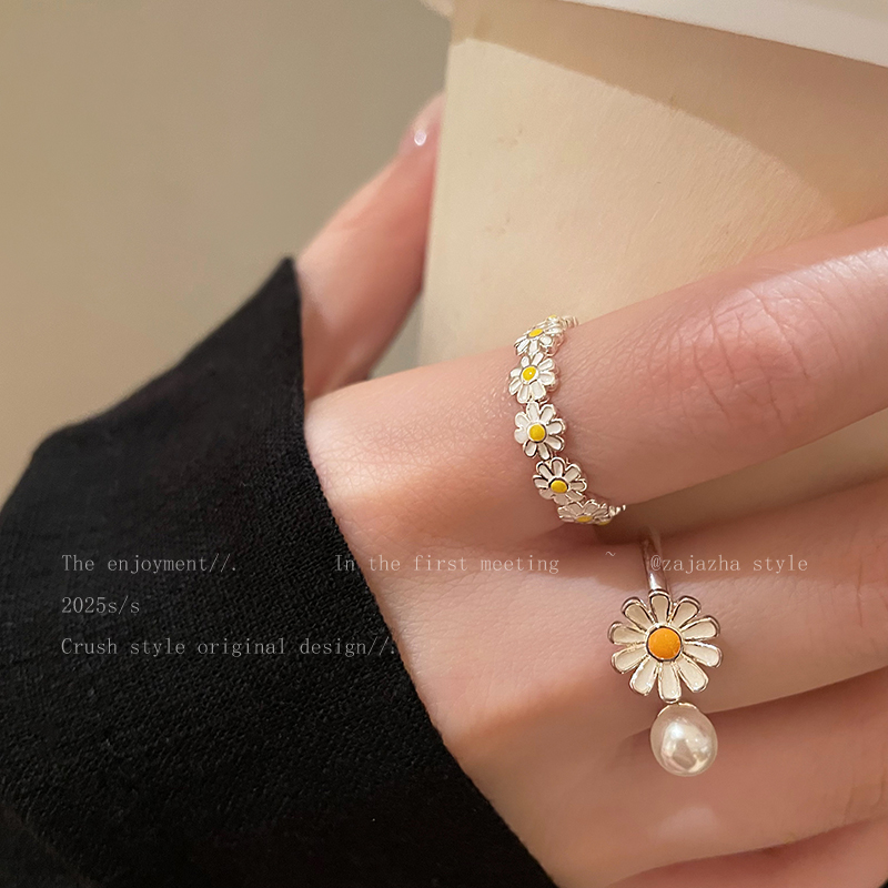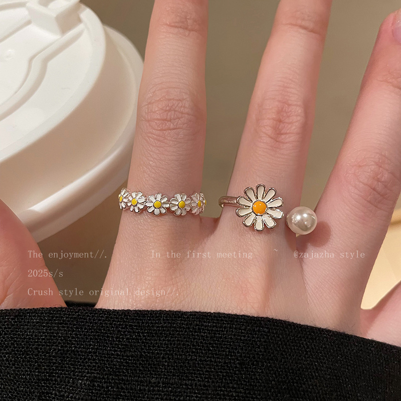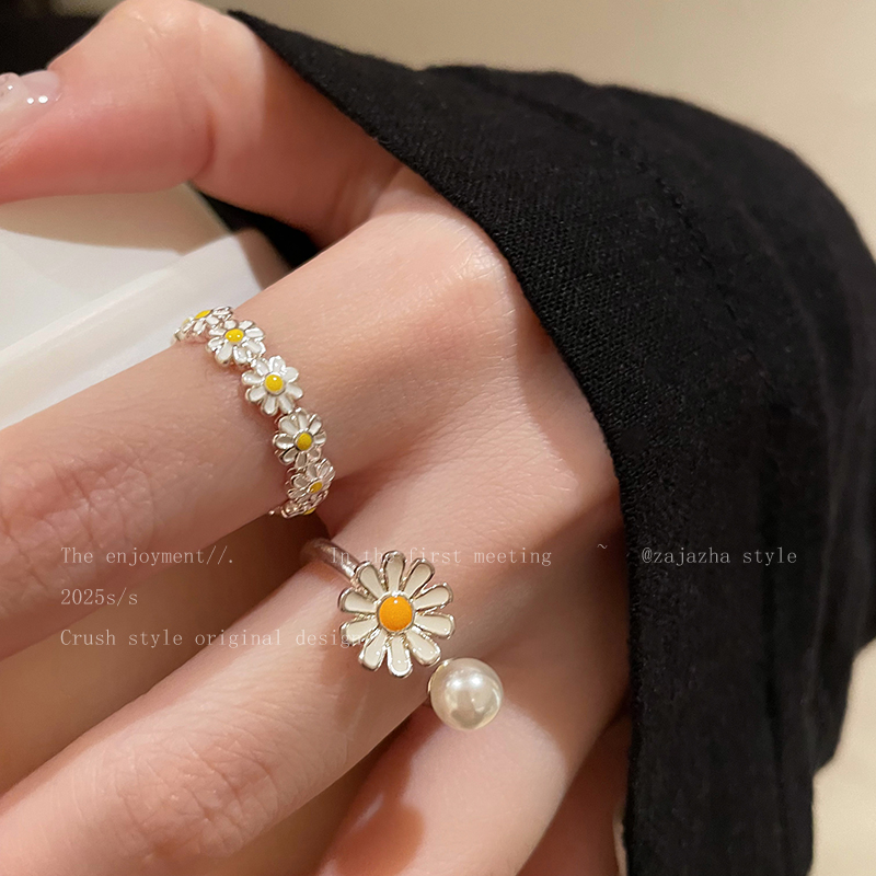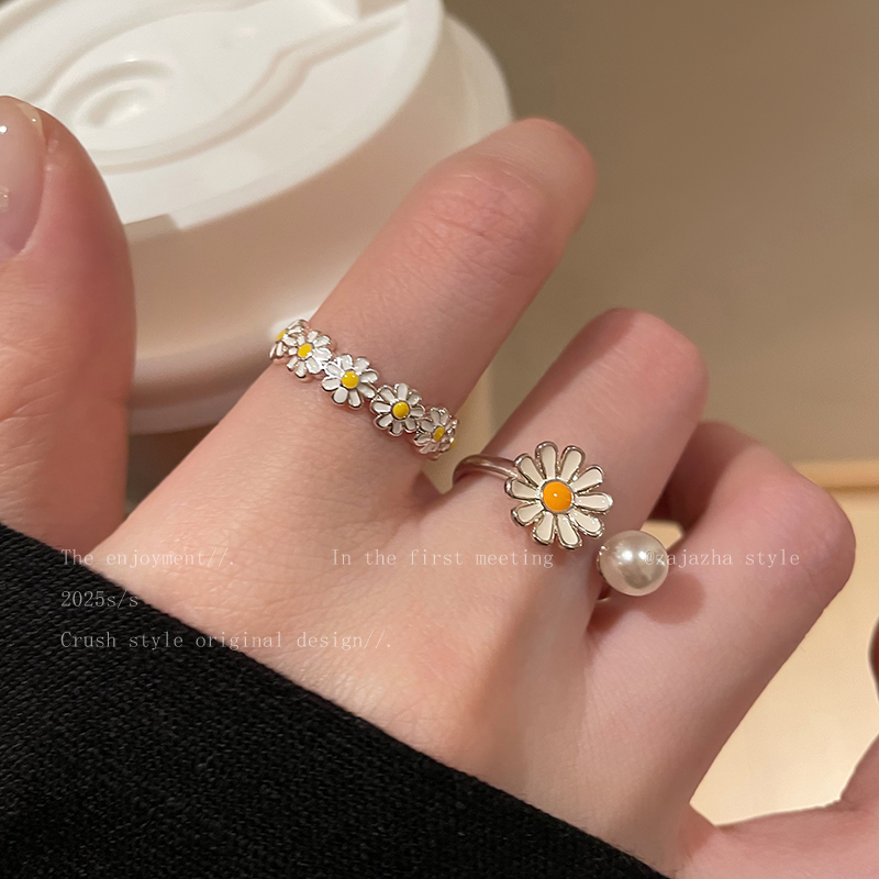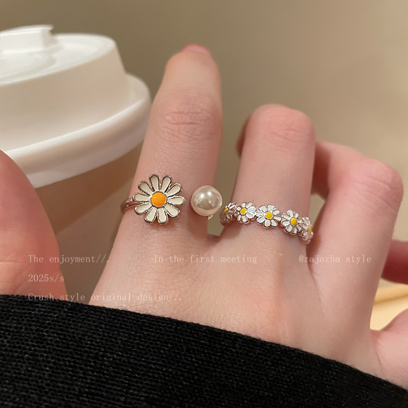 Daisy Flower Pearl Open Ring for Women, Light Luxury, High-End, Niche, Exquisite Index Finger Ring, Cute Stacking Ring