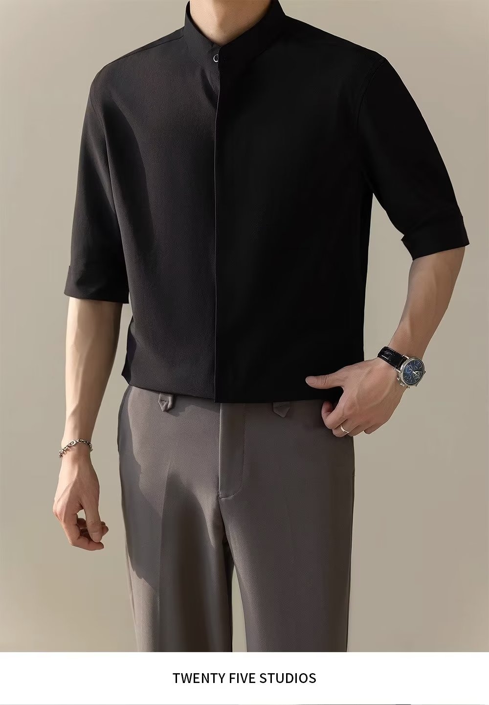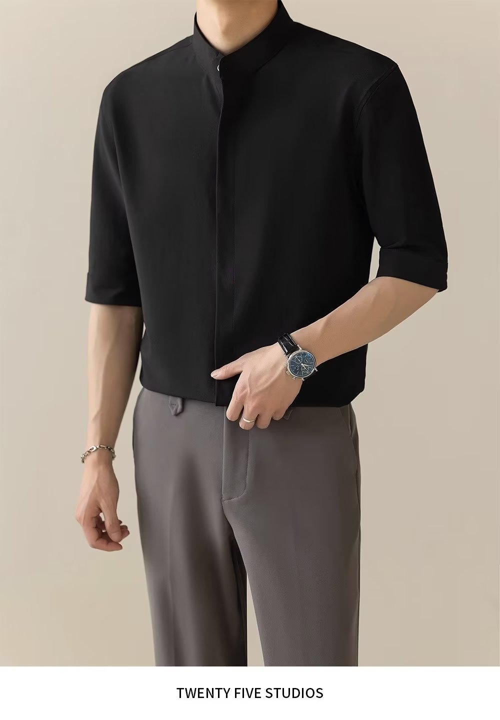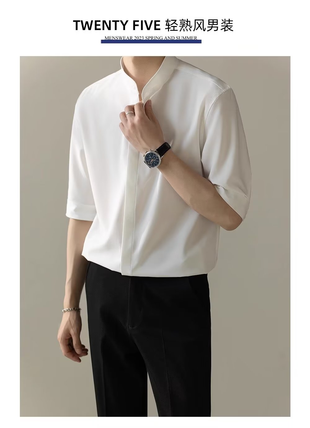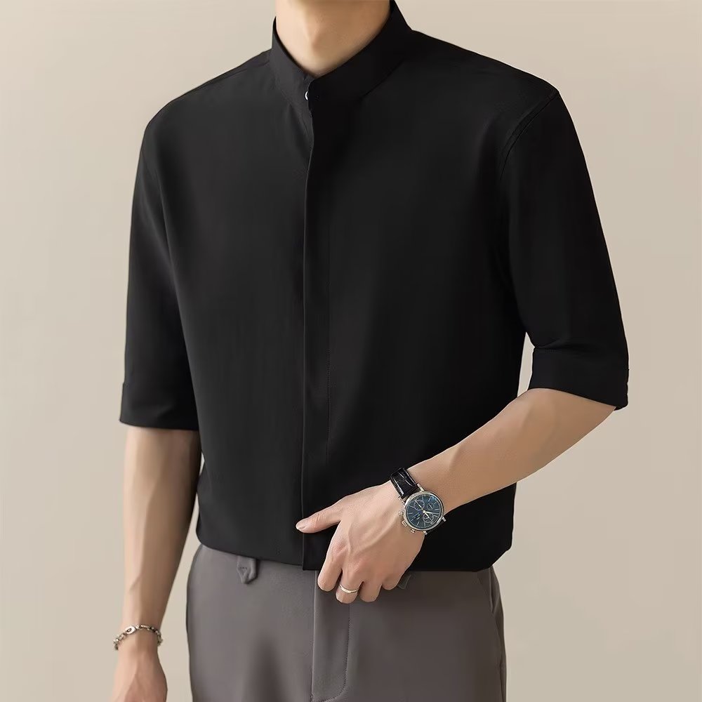2025 New Men's Chinese-Style Short-Sleeved Shirt with Stand Collar, High-Quality, Wrinkle-Free, Seamless, Drapey Five-Quarter Sleeve Shirt, Large Size