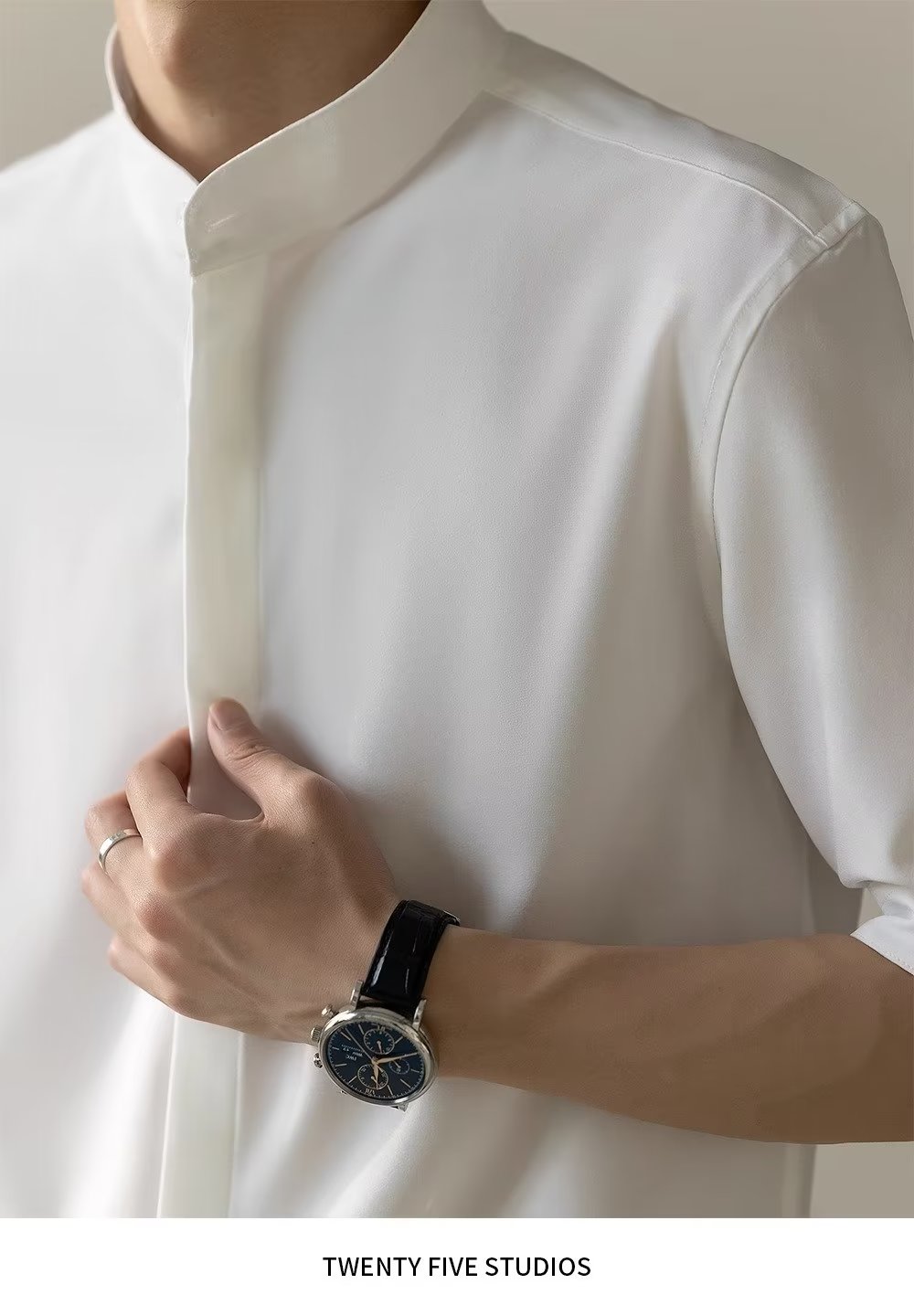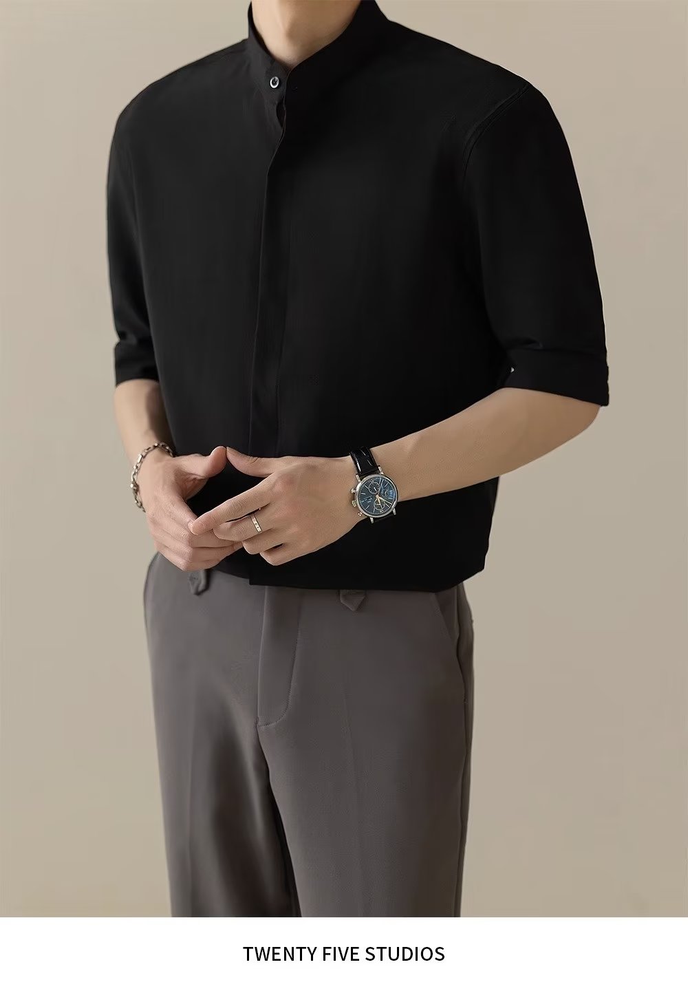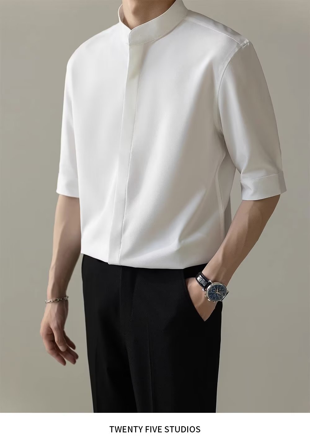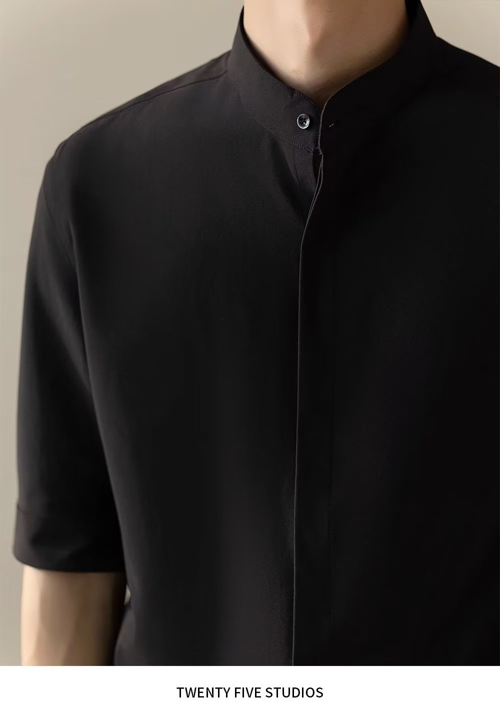 2025 New Men's Chinese-Style Short-Sleeved Shirt with Stand Collar, High-Quality, Wrinkle-Free, Seamless, Drapey Five-Quarter Sleeve Shirt, Large Size