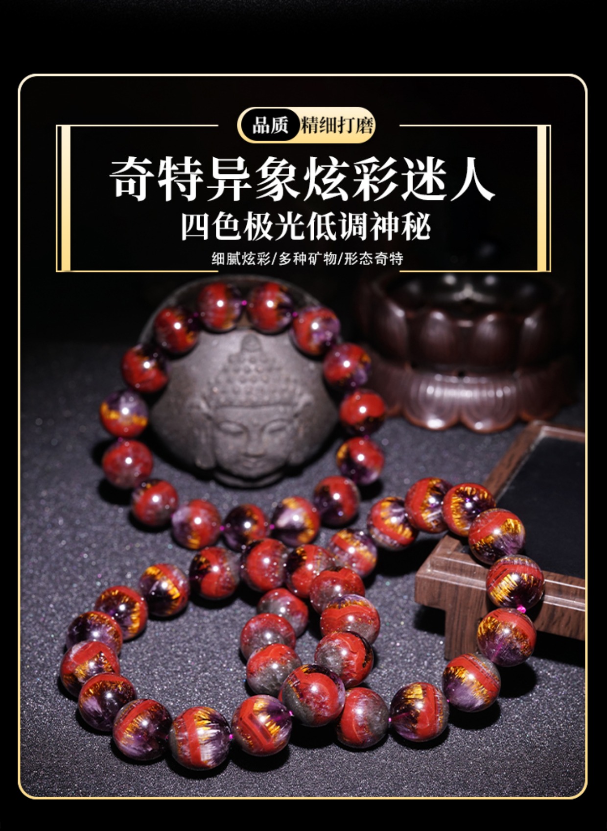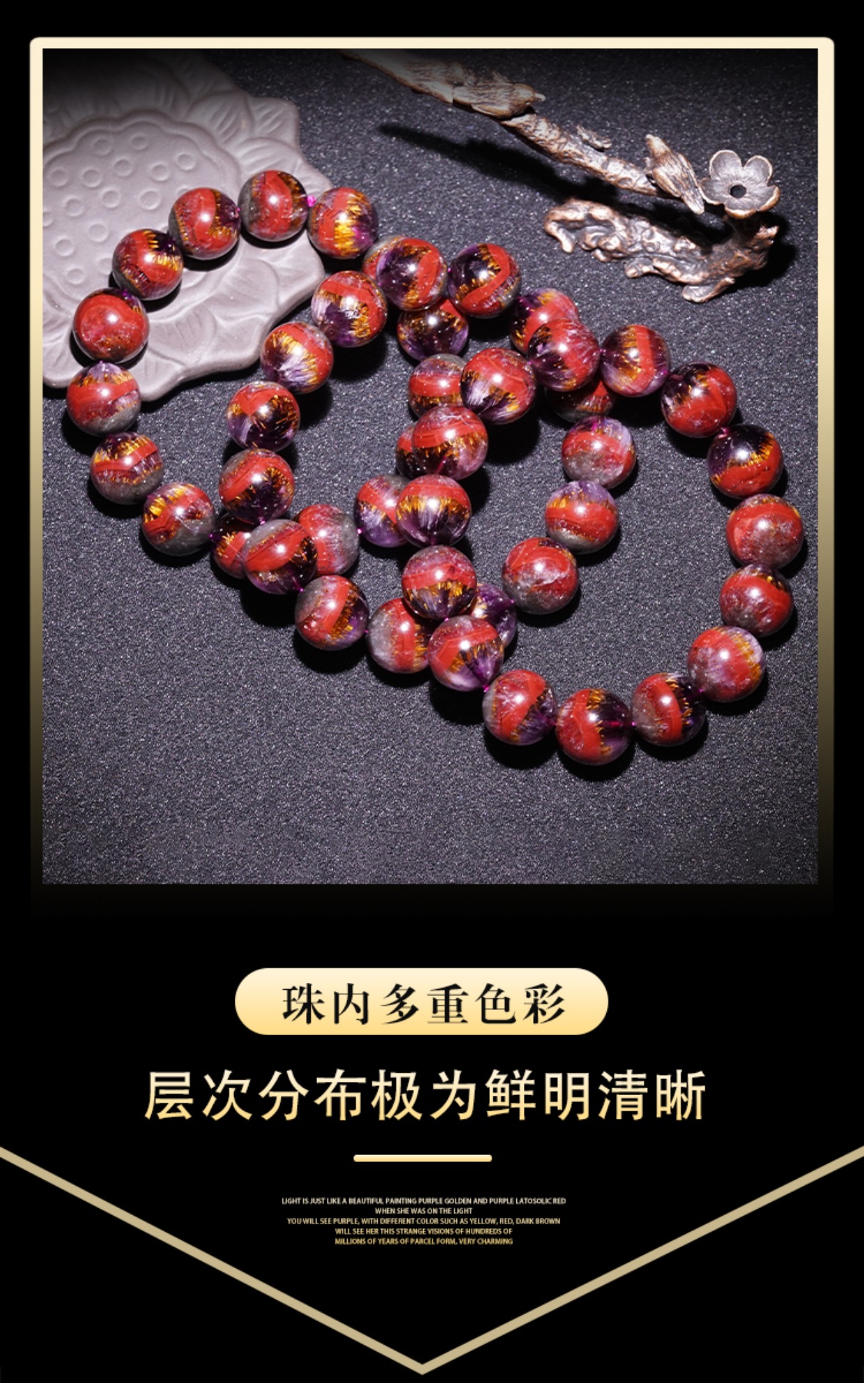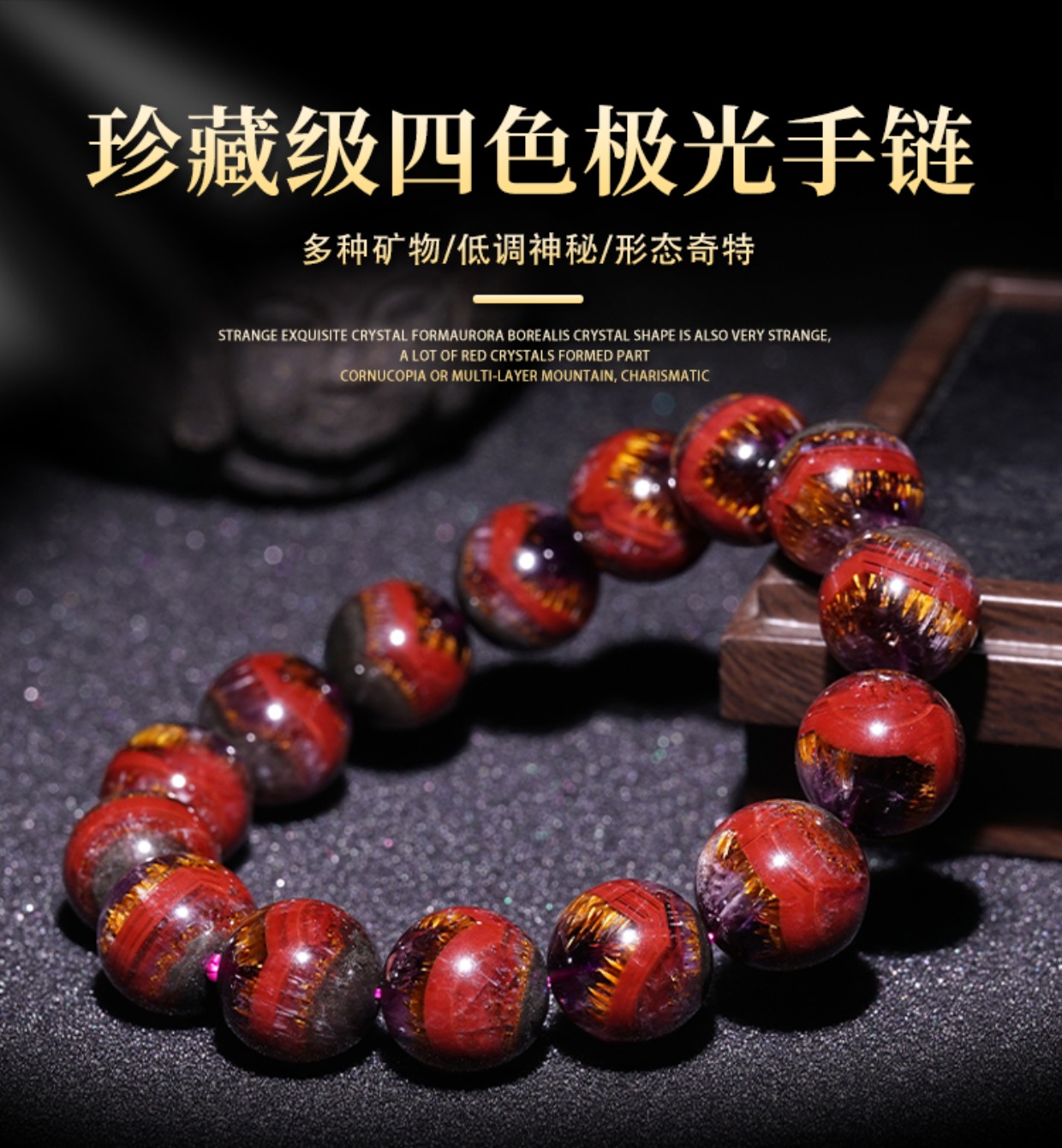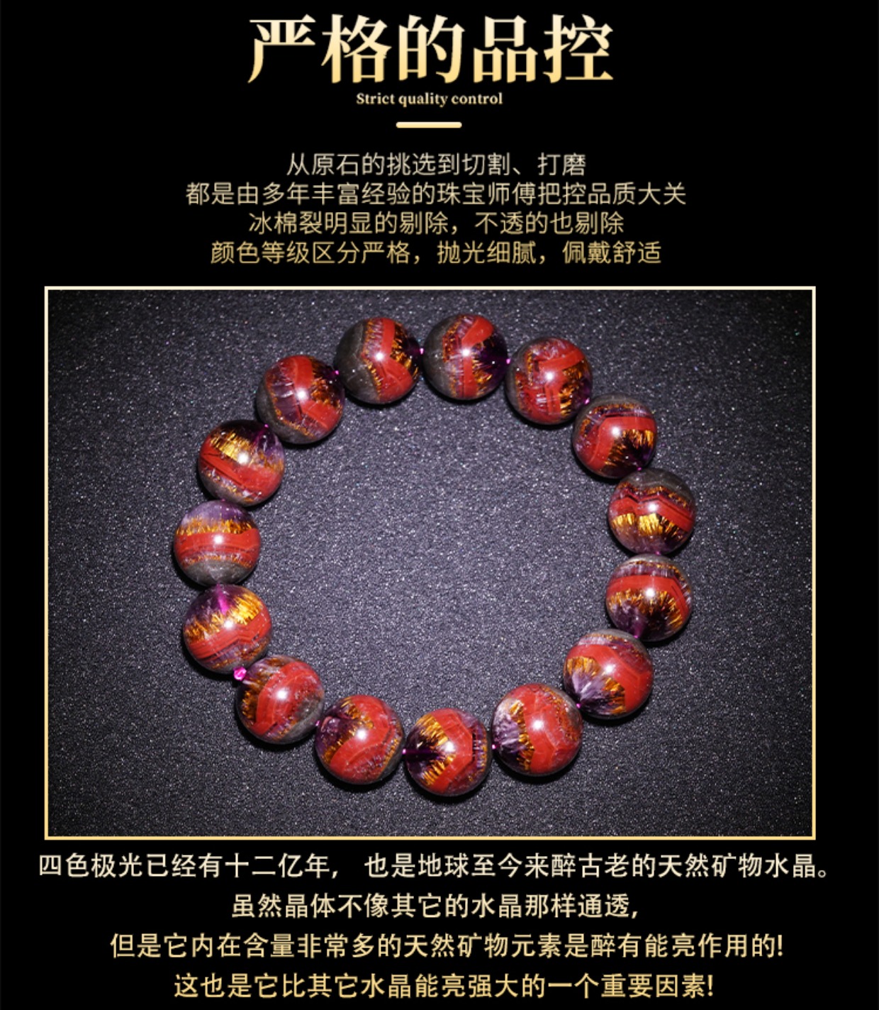 Natural Aurora Bracelet, Collectible Grade Single Circle Purple Titanium Four-Color Aurora 23 Mineral Crystal Full Titanium Gold Tooth Men's Bracelet