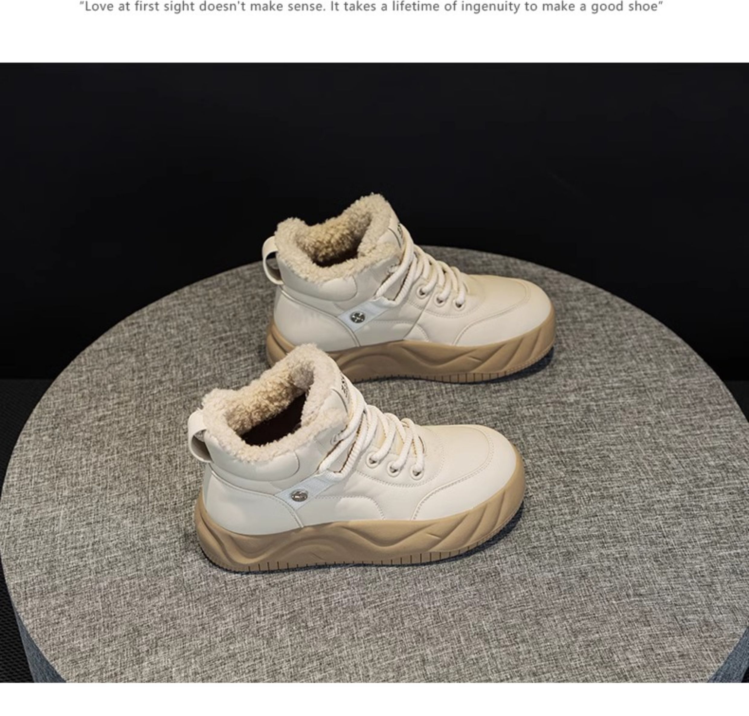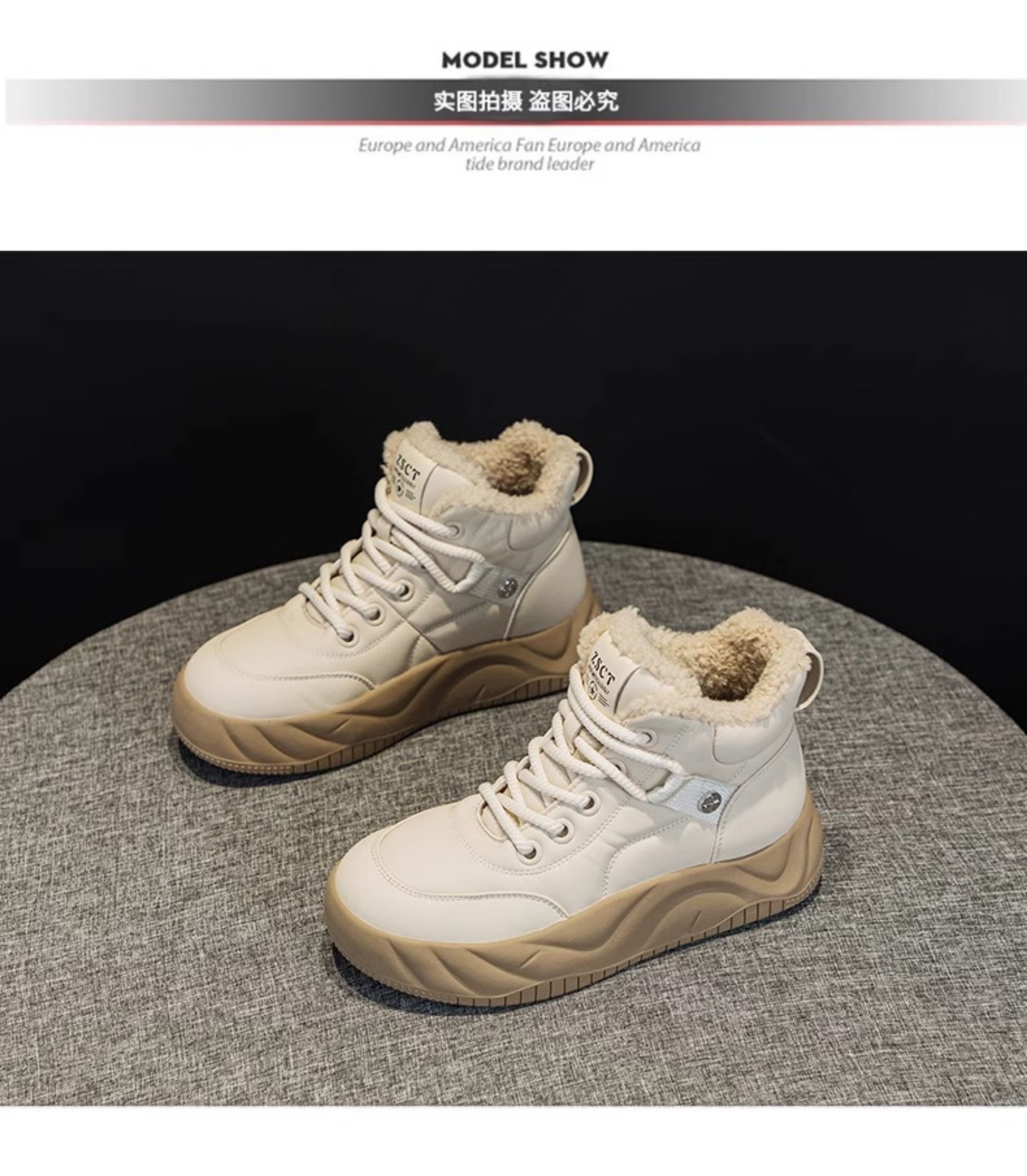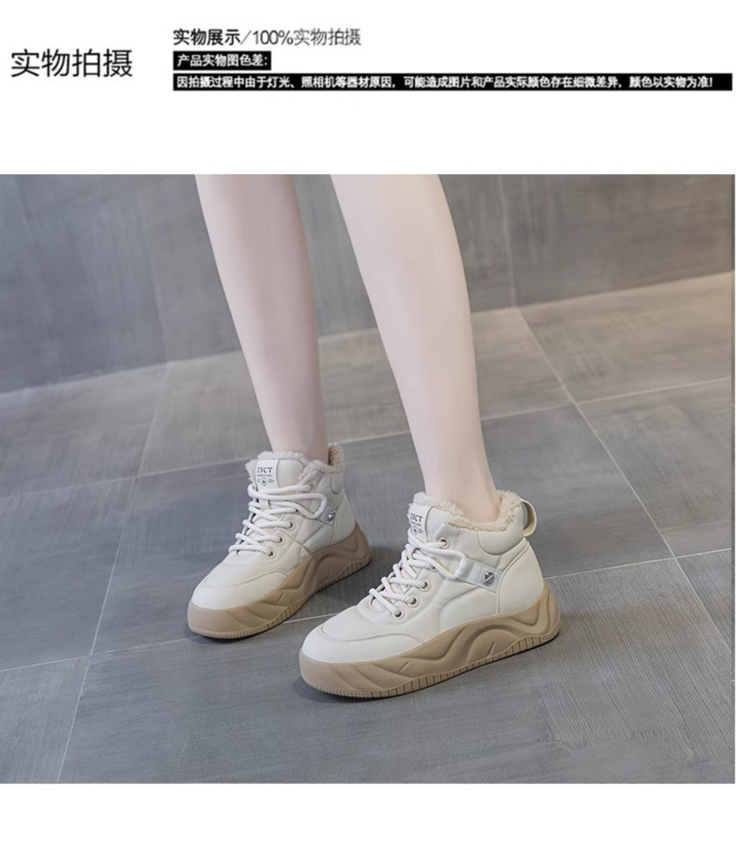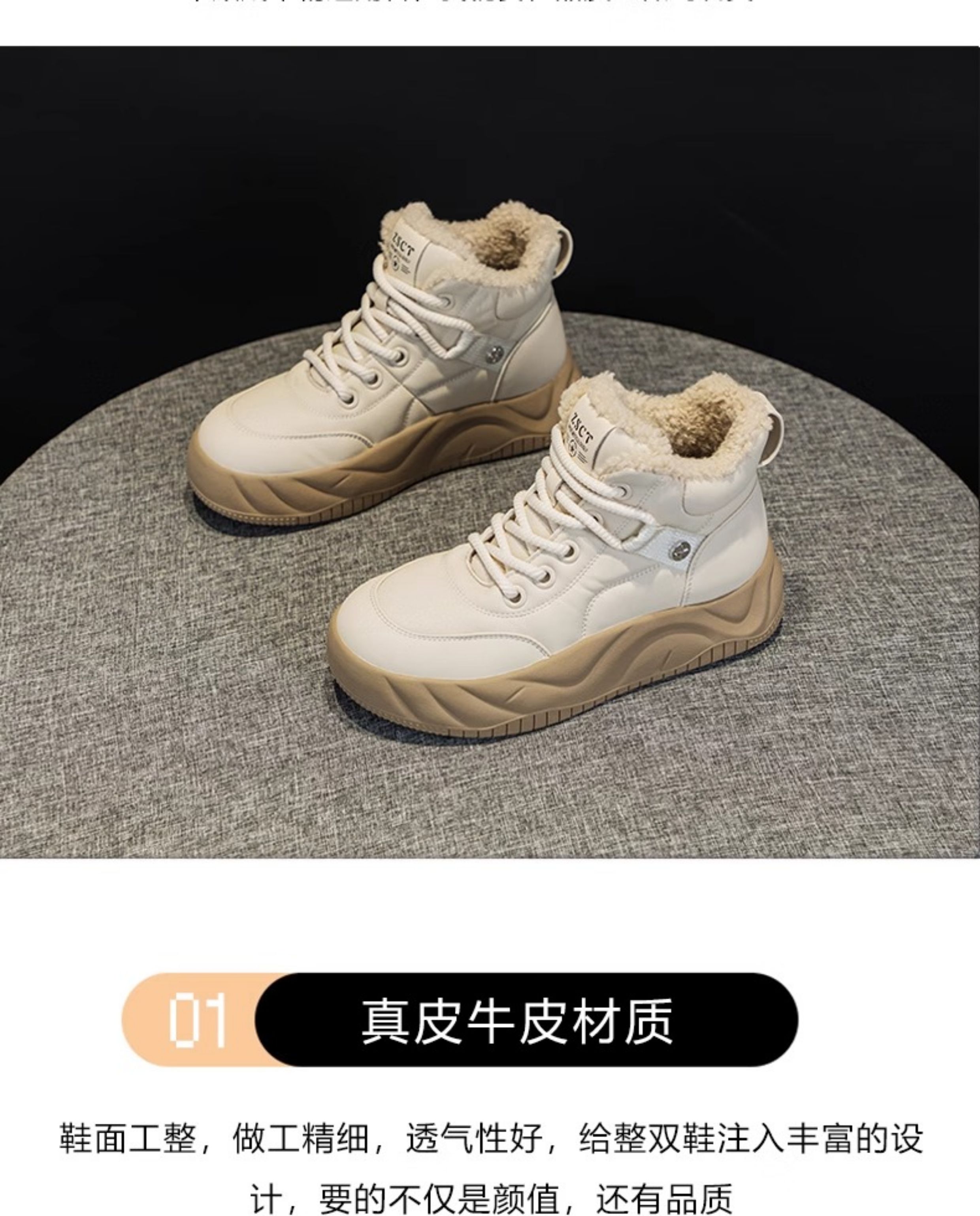 Hong Kong High-Top Cotton Shoes for Women, Winter Fleece-Lined 2025 New Thick-Soled Soft-Soled White Sneakers, Sporty Furry Snow Boots