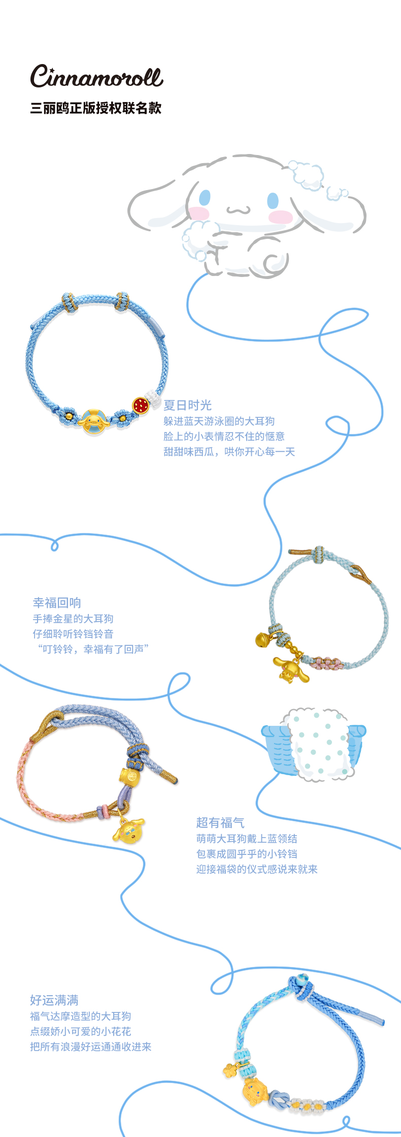 | 克重 【幸福回响】手绳金重约1.5g 【好运满满】手绳金重约1.1g 【超有福气】手绳金重约1.6g 【夏日时光】手绳金重约1.35g | |