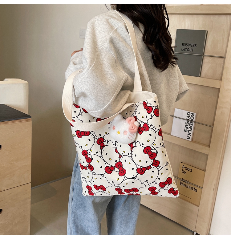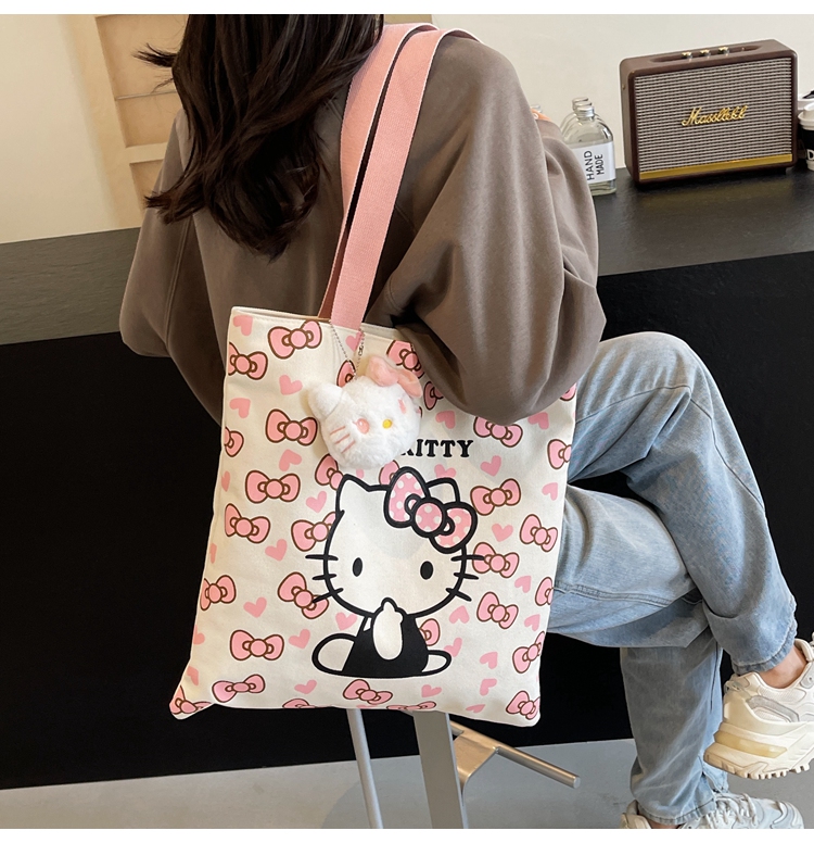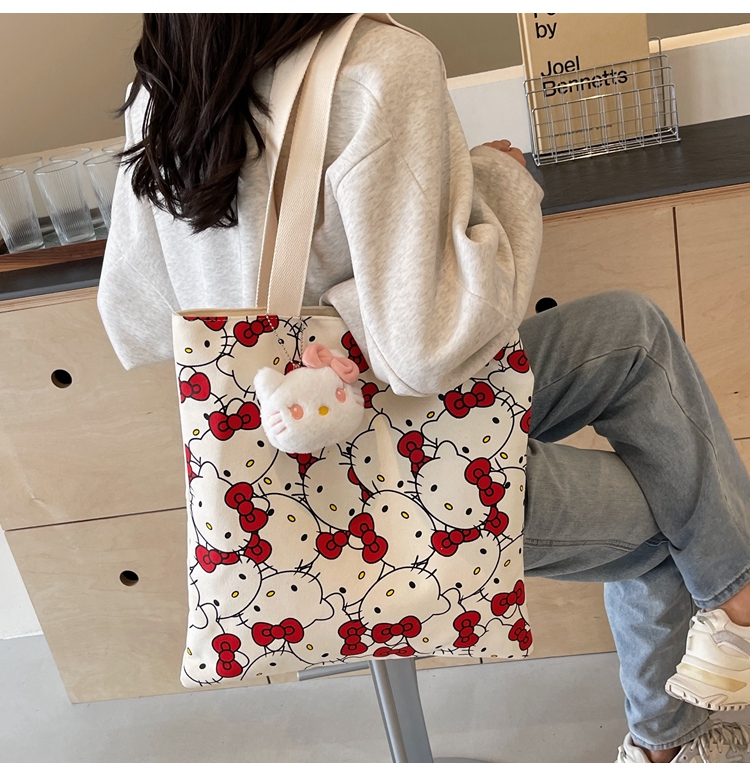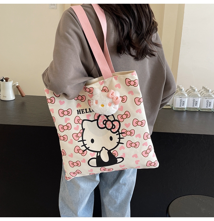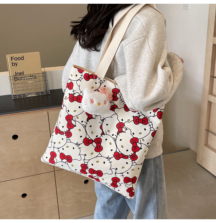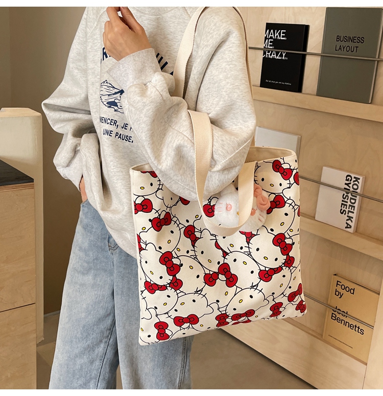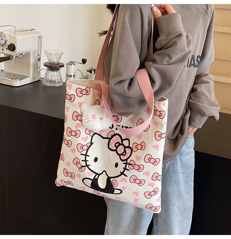 hellokitty Cat Cartoon Canvas Bag Schoolgirl Handbag Large Capacity Class Work Clothing Shoulder Tote Bag