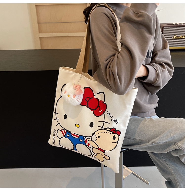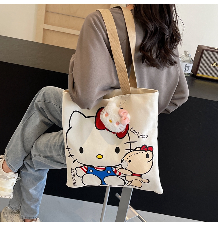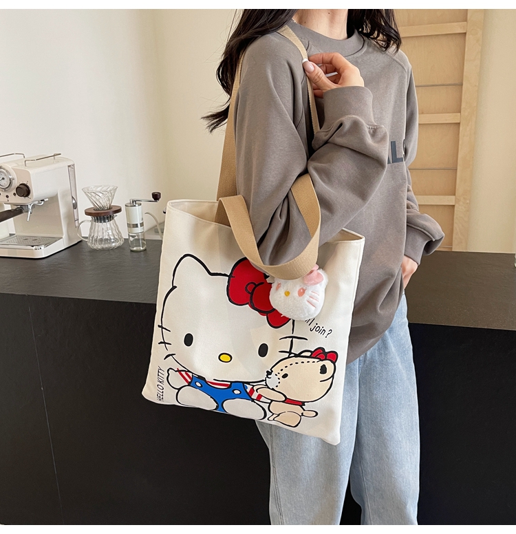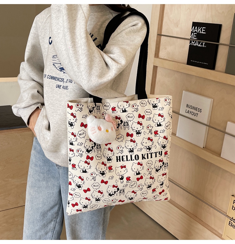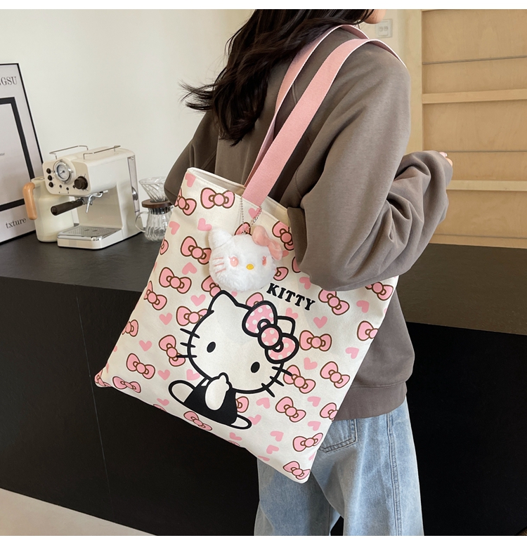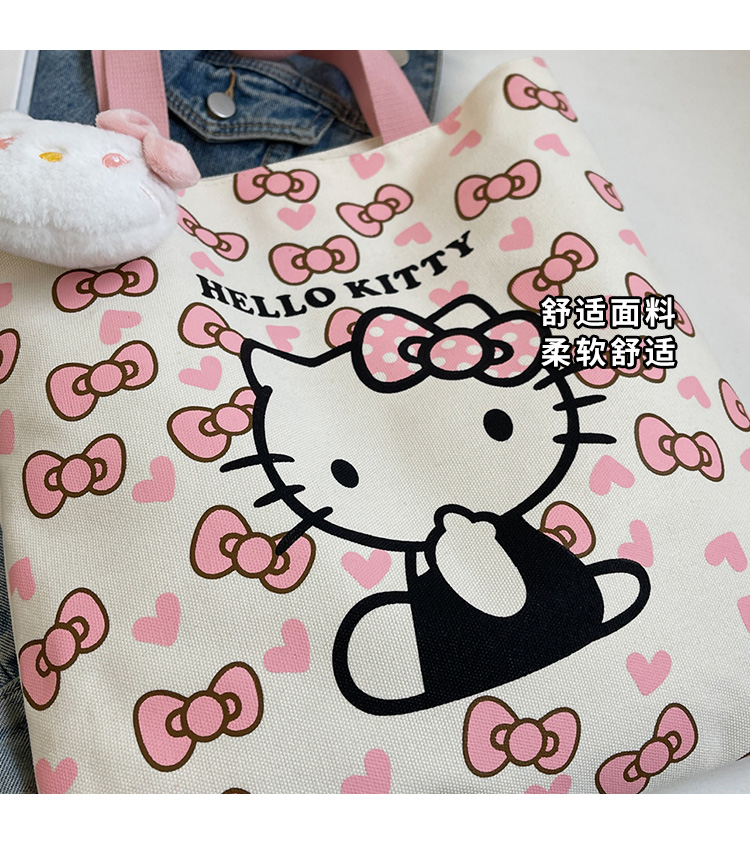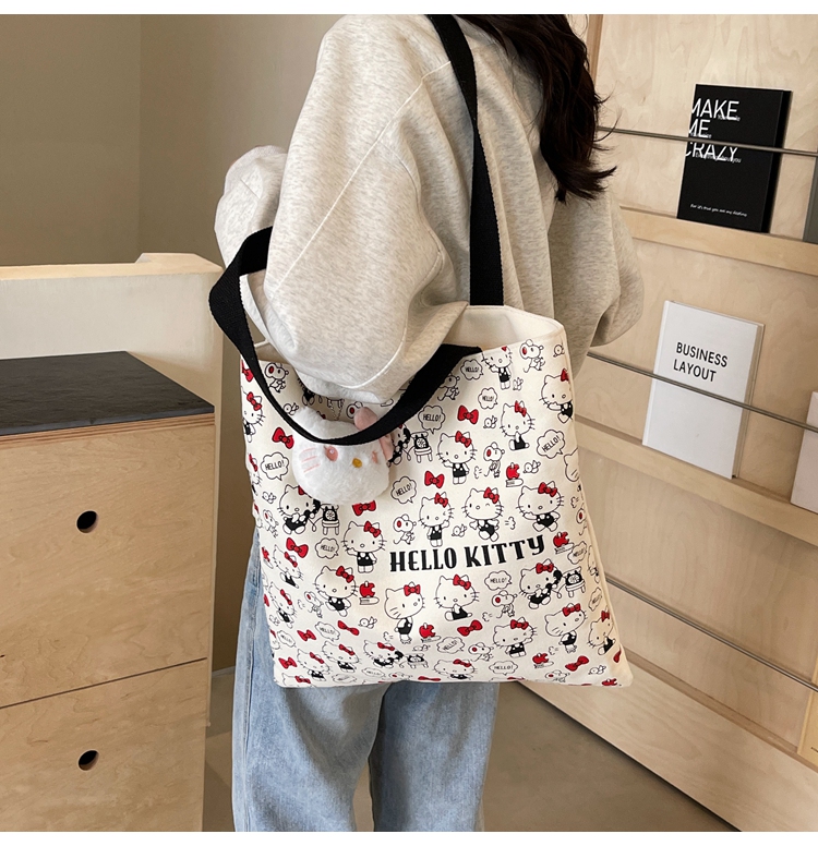 hellokitty Cat Cartoon Canvas Bag Schoolgirl Handbag Large Capacity Class Work Clothing Shoulder Tote Bag