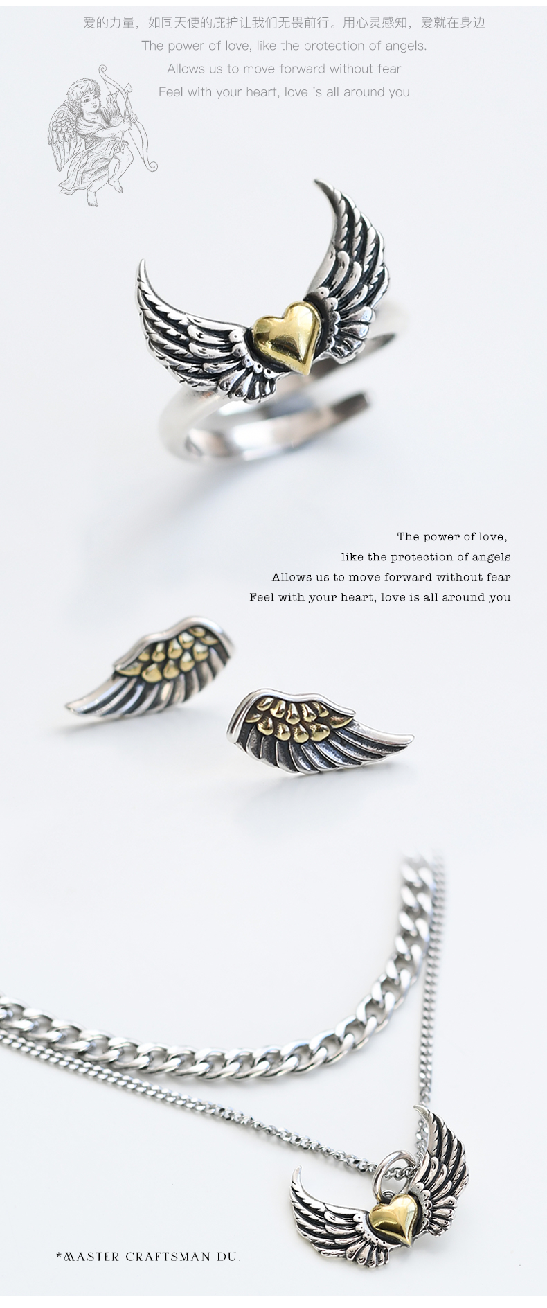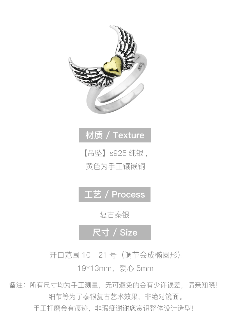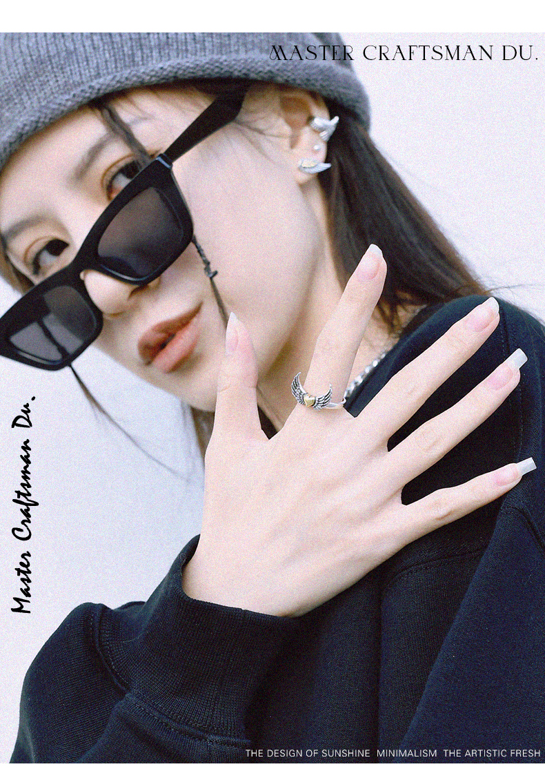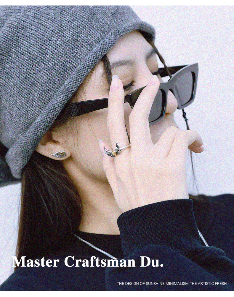 Dushi Ancient Craft Angel Wings Heart Sterling Silver Ring for Women, Niche Design Original Personality Wing Index Finger Ring for Men