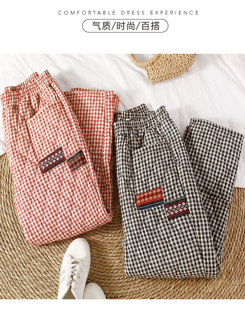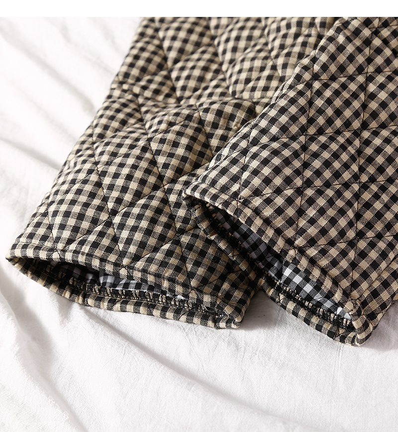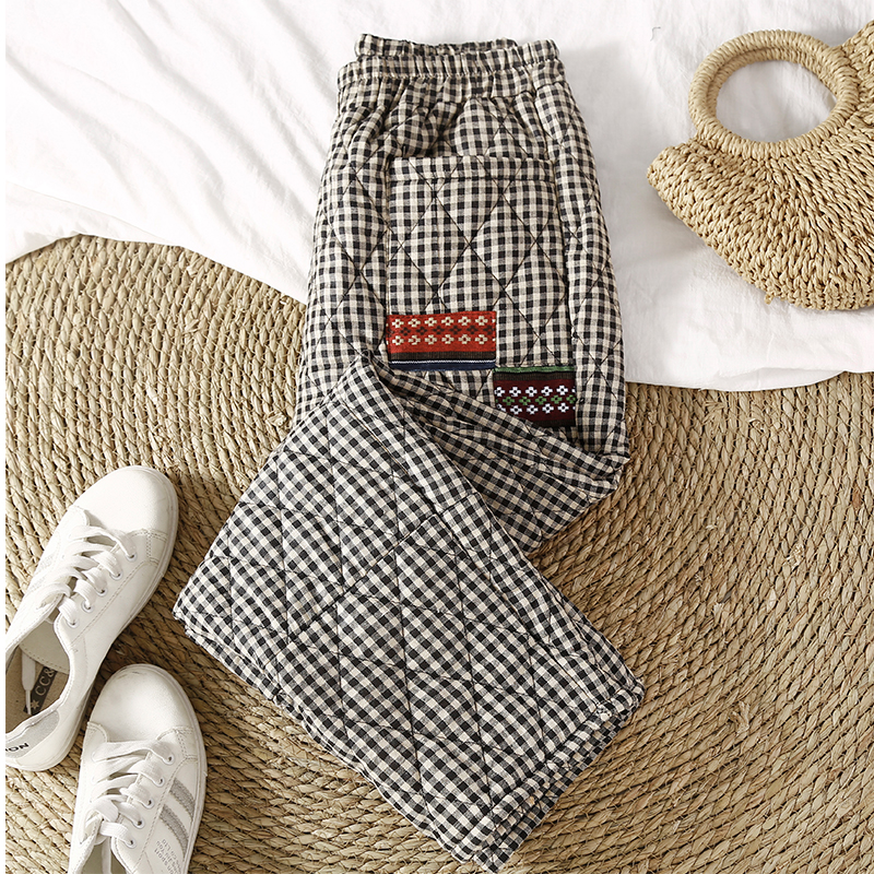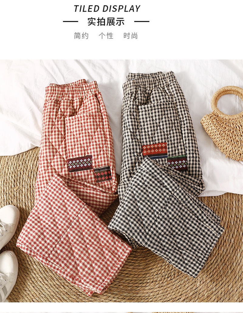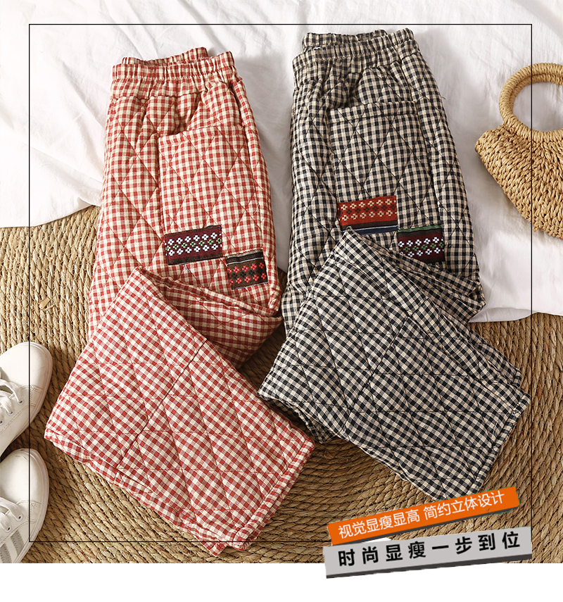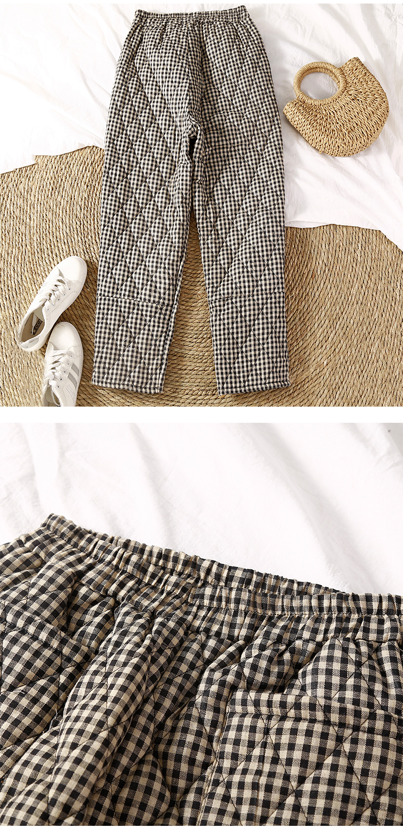 Japanese Original Brand Women's Outerwear Warm Cotton-Linen Padded Harem Pants High-Waisted Plaid Lightweight down Cotton Pants