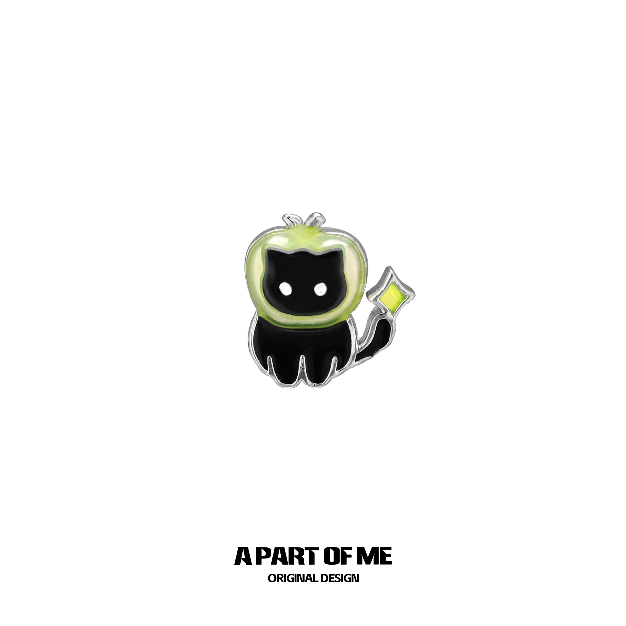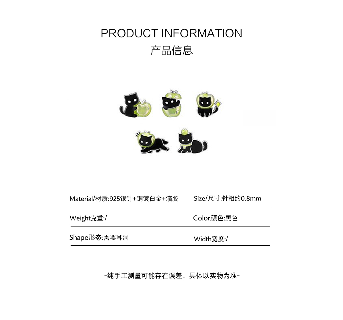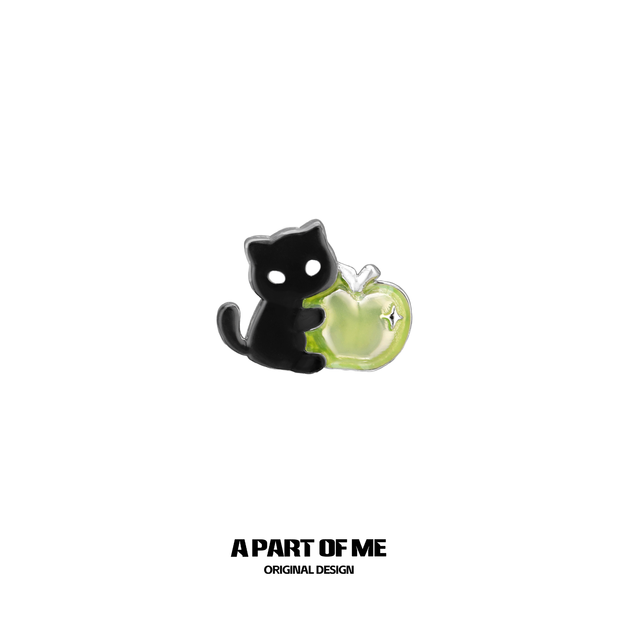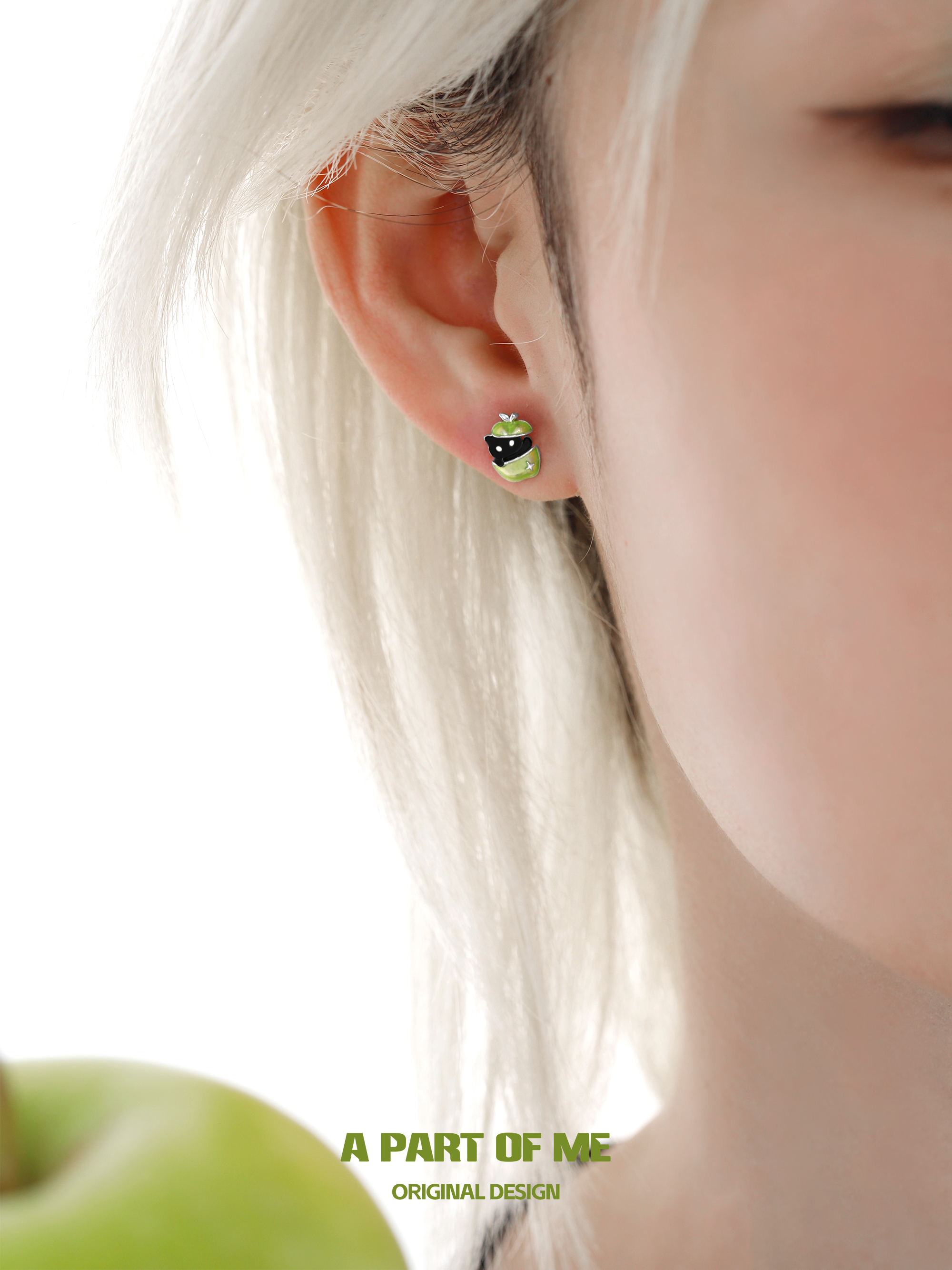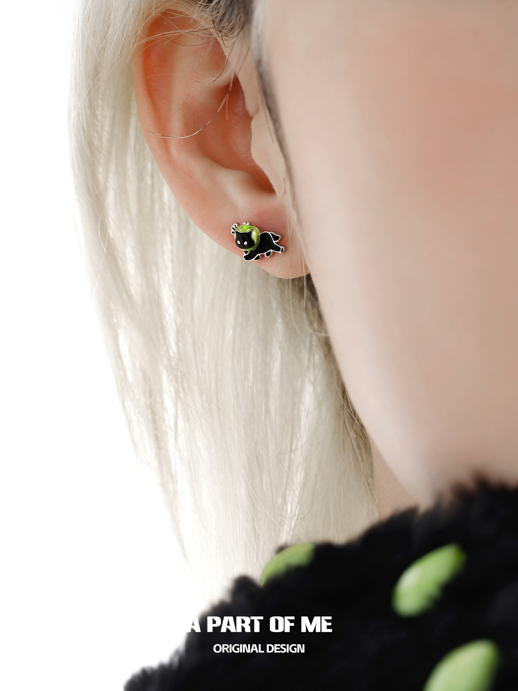 So Cute! Black Cat Green Apple Earrings, Original Niche Sweet and Cool High-End Earrings, 925 Silver Needle Ear Accessories