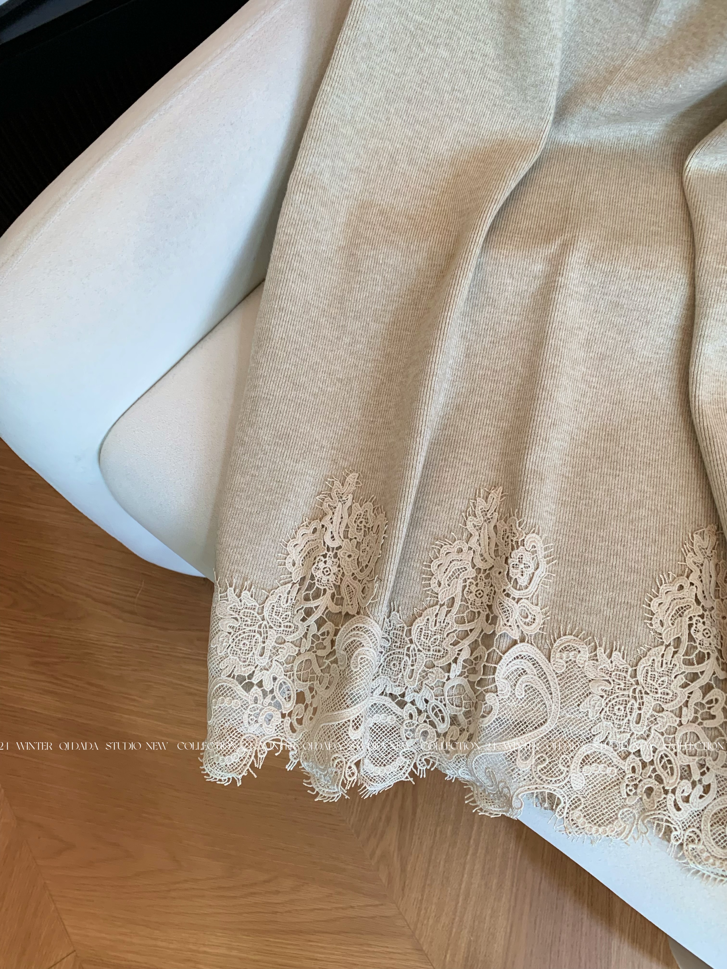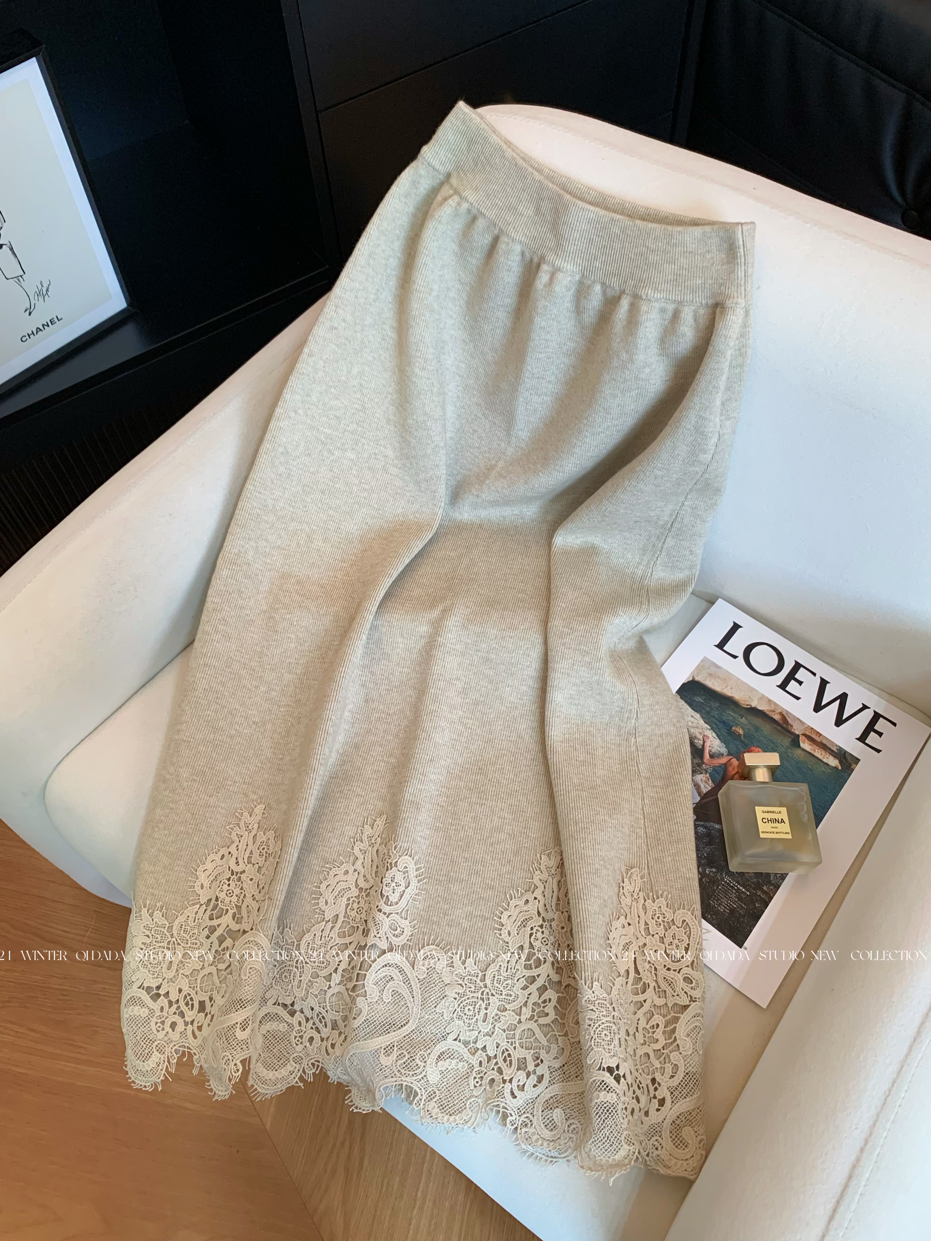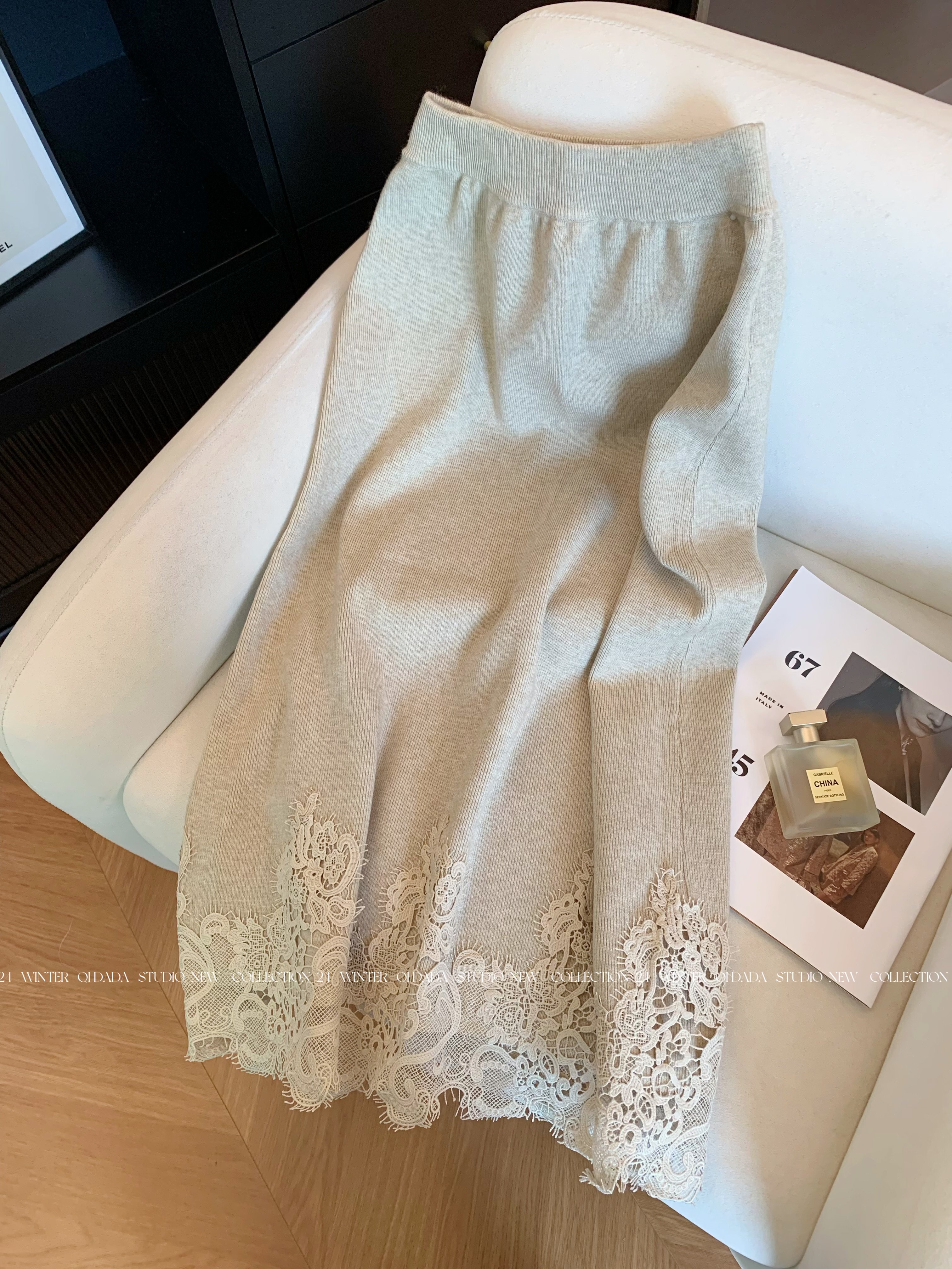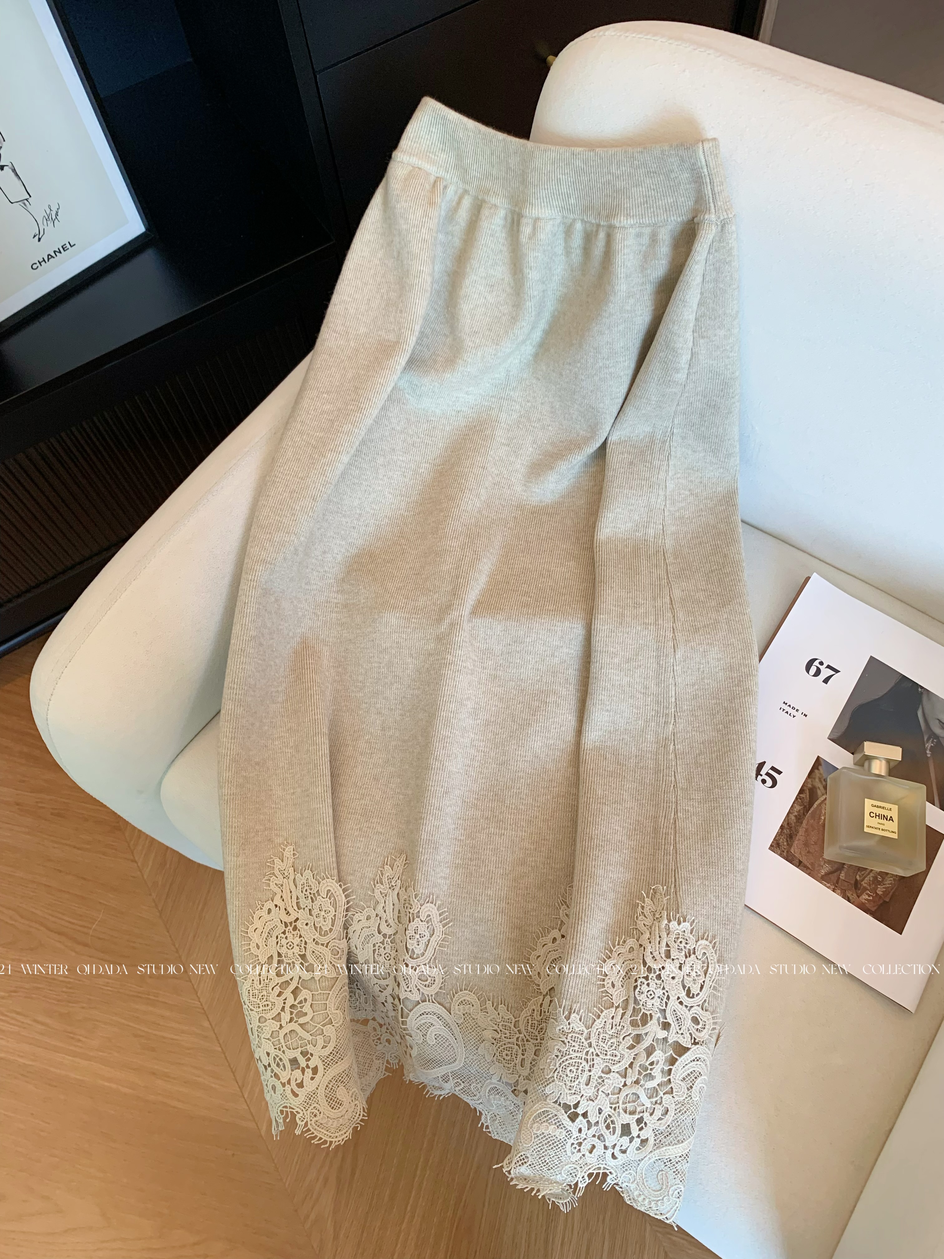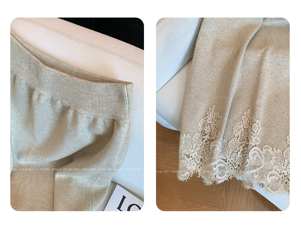 Oatmeal-Colored Lace Spliced A-Line Knitted Skirt for Women 2025 New Autumn Fashion Stylish High-End Long Skirt