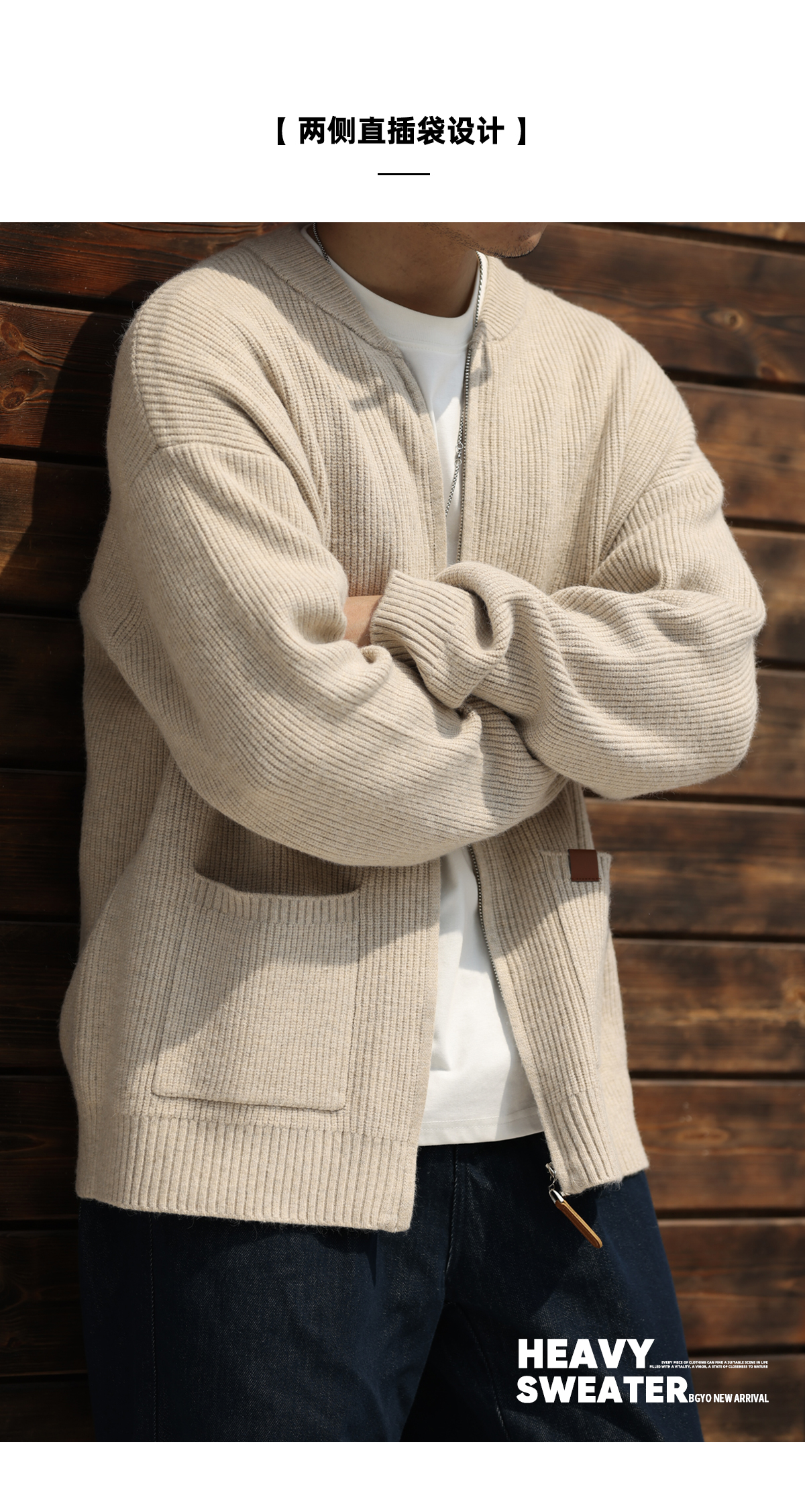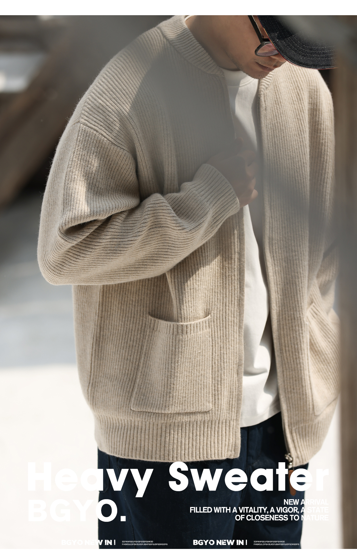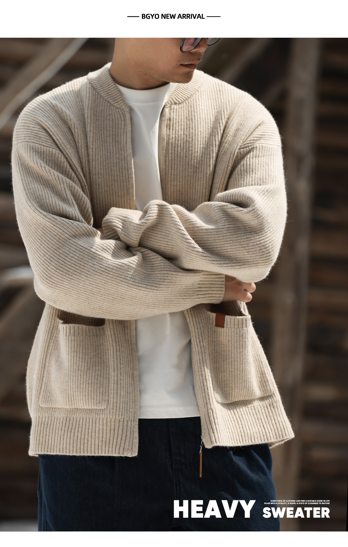 Bgyo Luqi American Casual 680g Heavyweight Zip-Up Cardigan Sweater for Men, 7-Gauge Thick Yarn Vintage Knit Jacket for Autumn