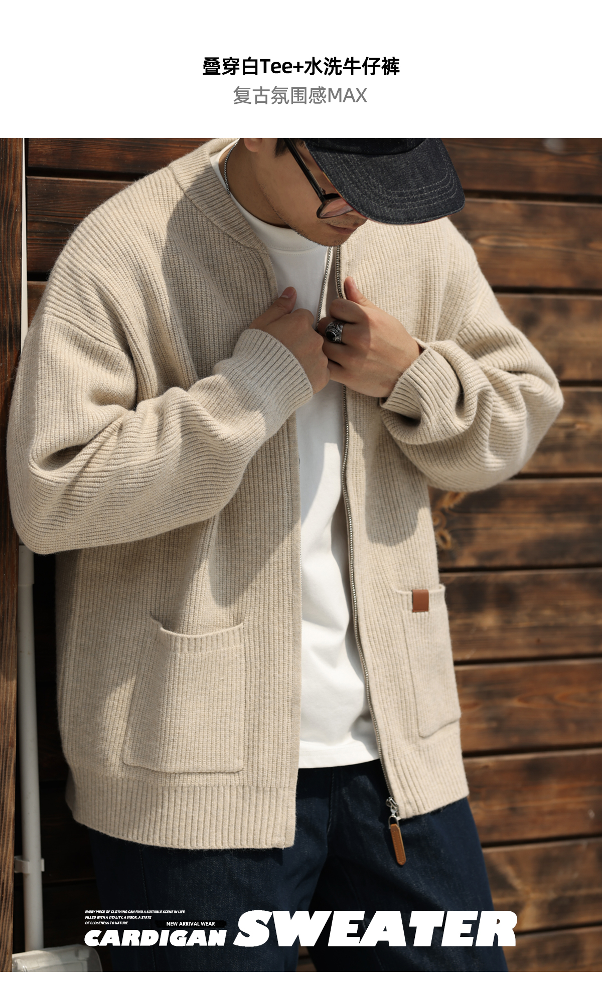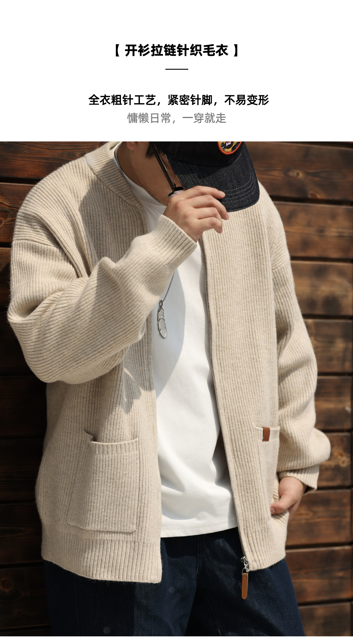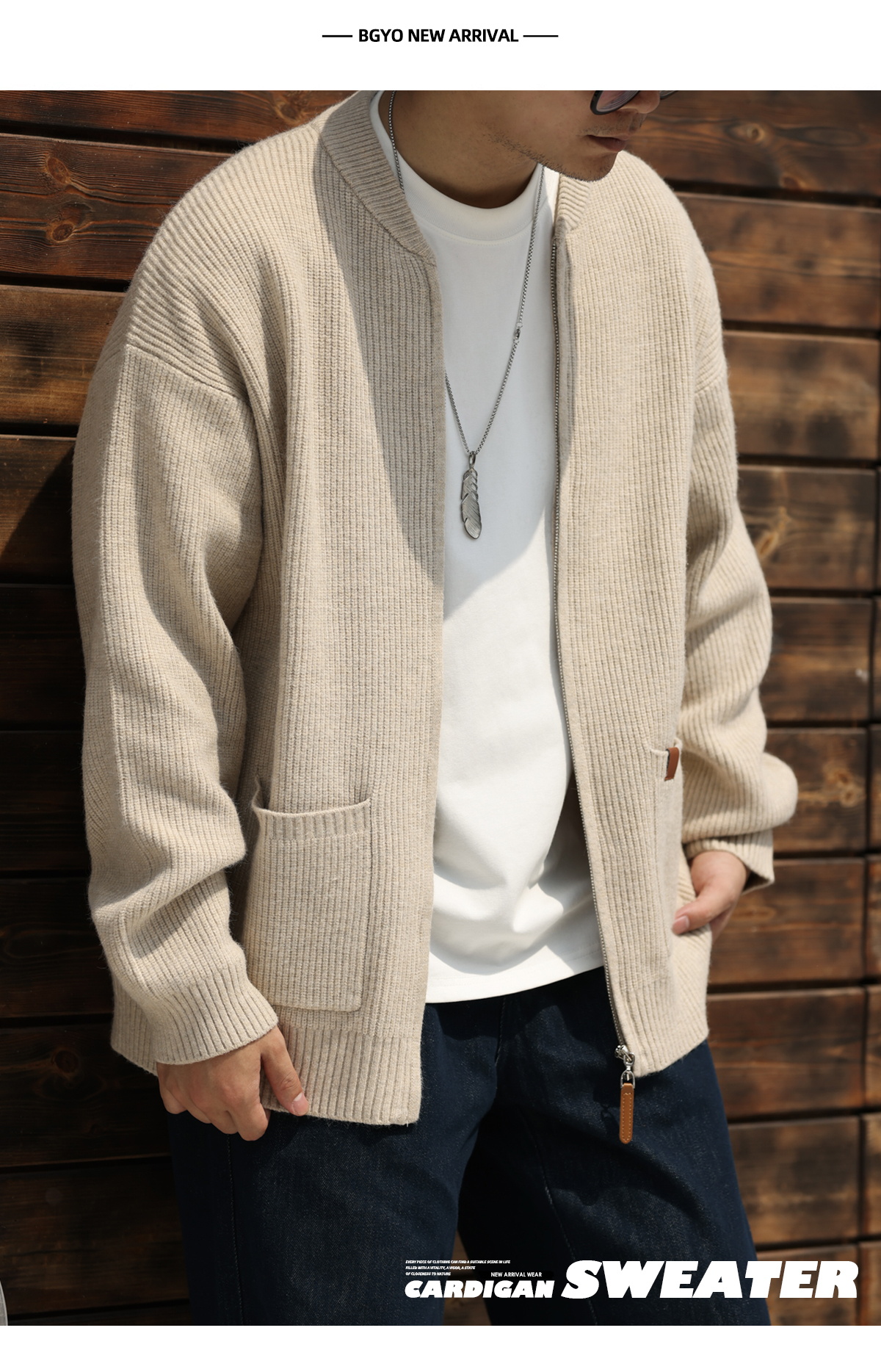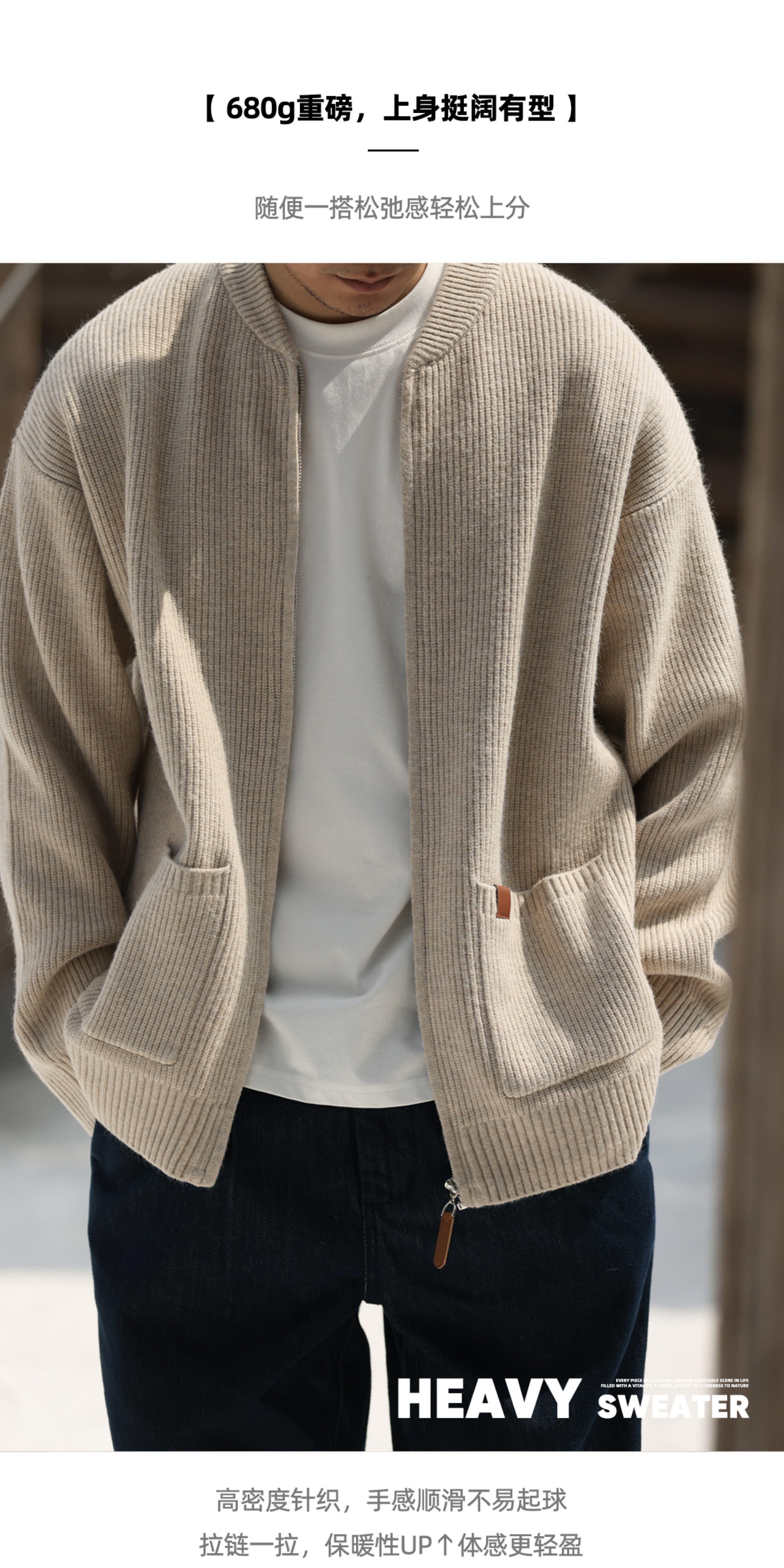 Bgyo Luqi American Casual 680g Heavyweight Zip-Up Cardigan Sweater for Men, 7-Gauge Thick Yarn Vintage Knit Jacket for Autumn