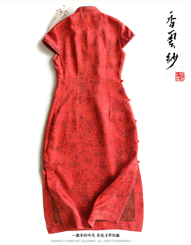 Yunshu Original Floral Fragrant Cloud Silk Short-Sleeved Stand-Up Collar Mother-Of-The-Bride Improved Cheongsam Dress Summer Red Wedding Banquet Dress