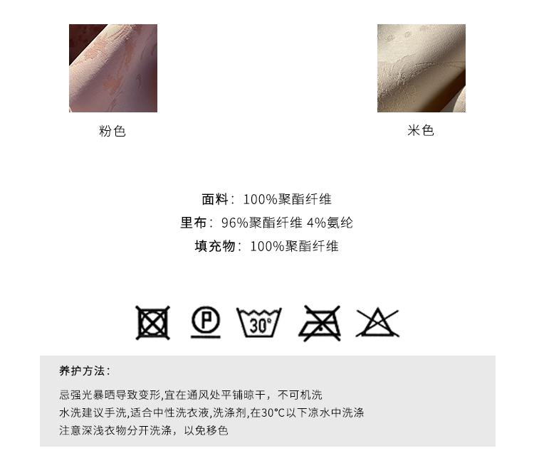 建议常温单独洗涤,手洗,悬挂晾晒,阴凉通风处晾晒请勿暴晒