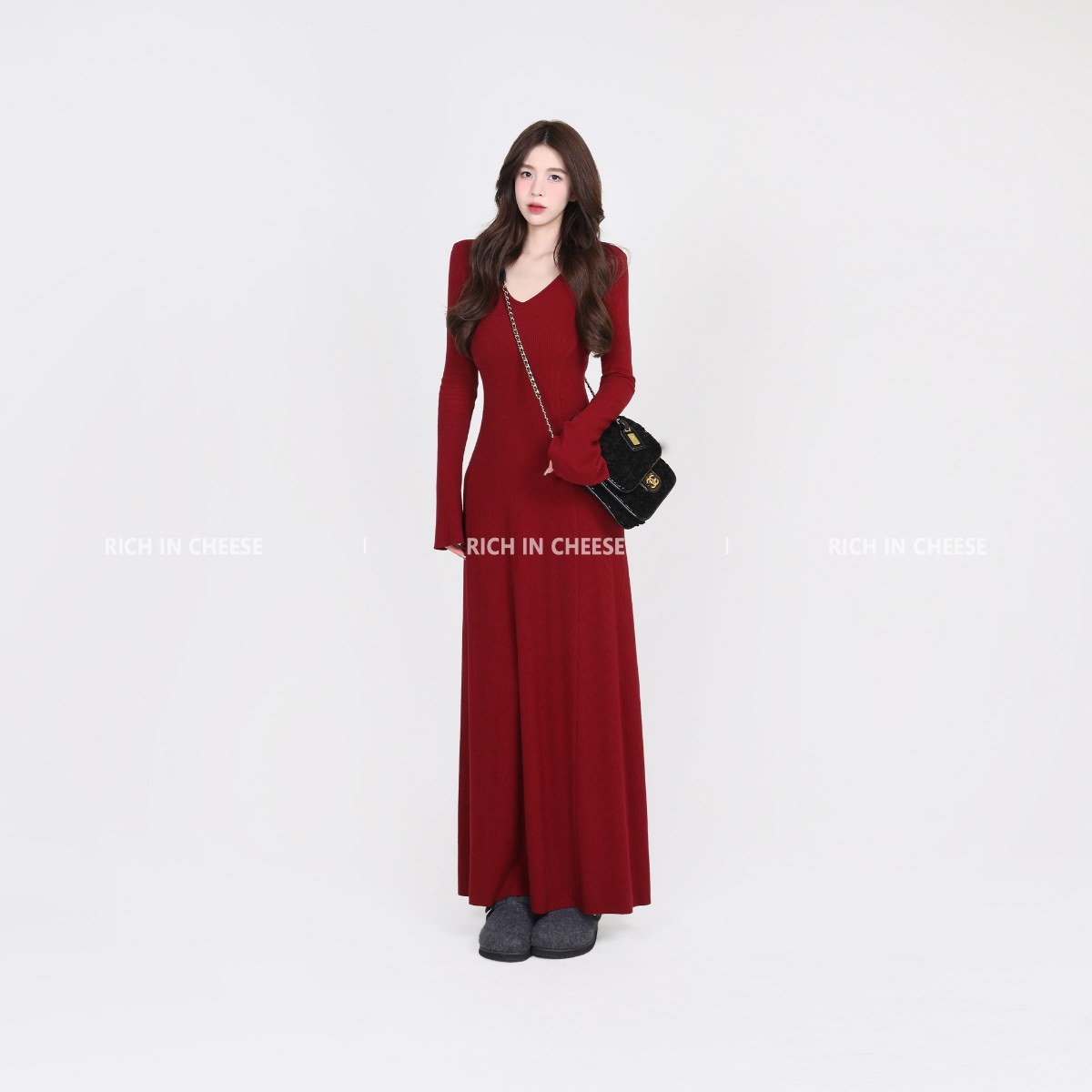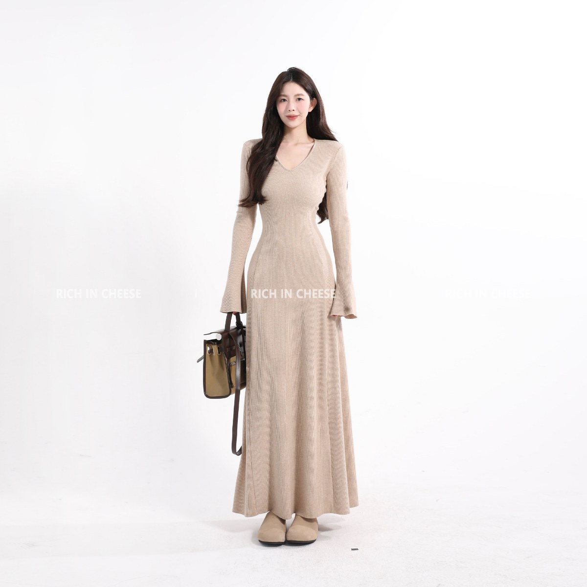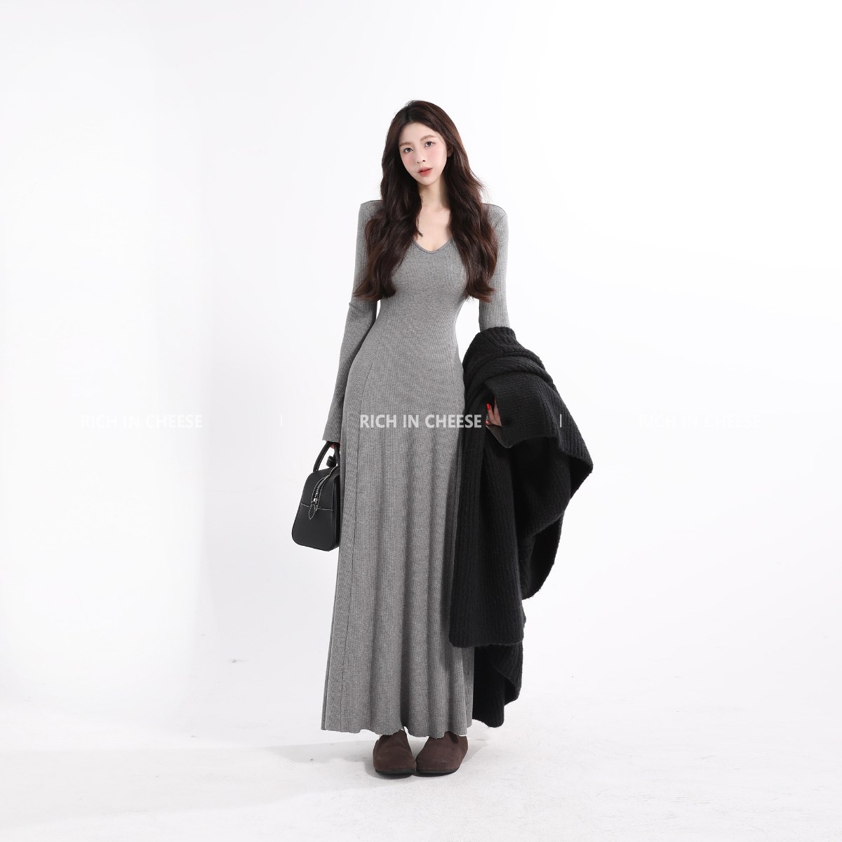 Shuhule Tea-Scented Croissant [V-Neck Long Dress] Elegant Knitted Dress for Women with a High-End Feel and Waist-Cinching Design