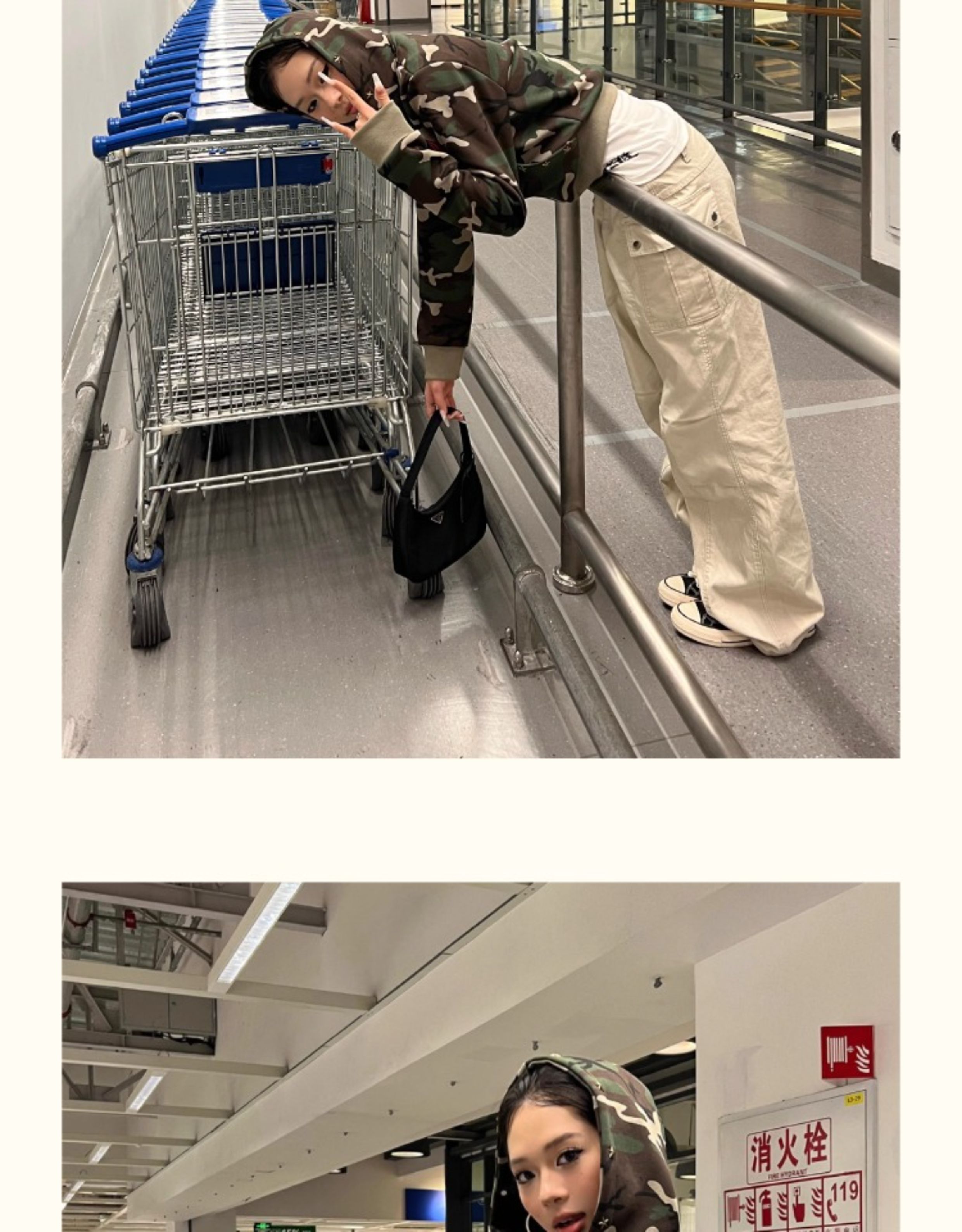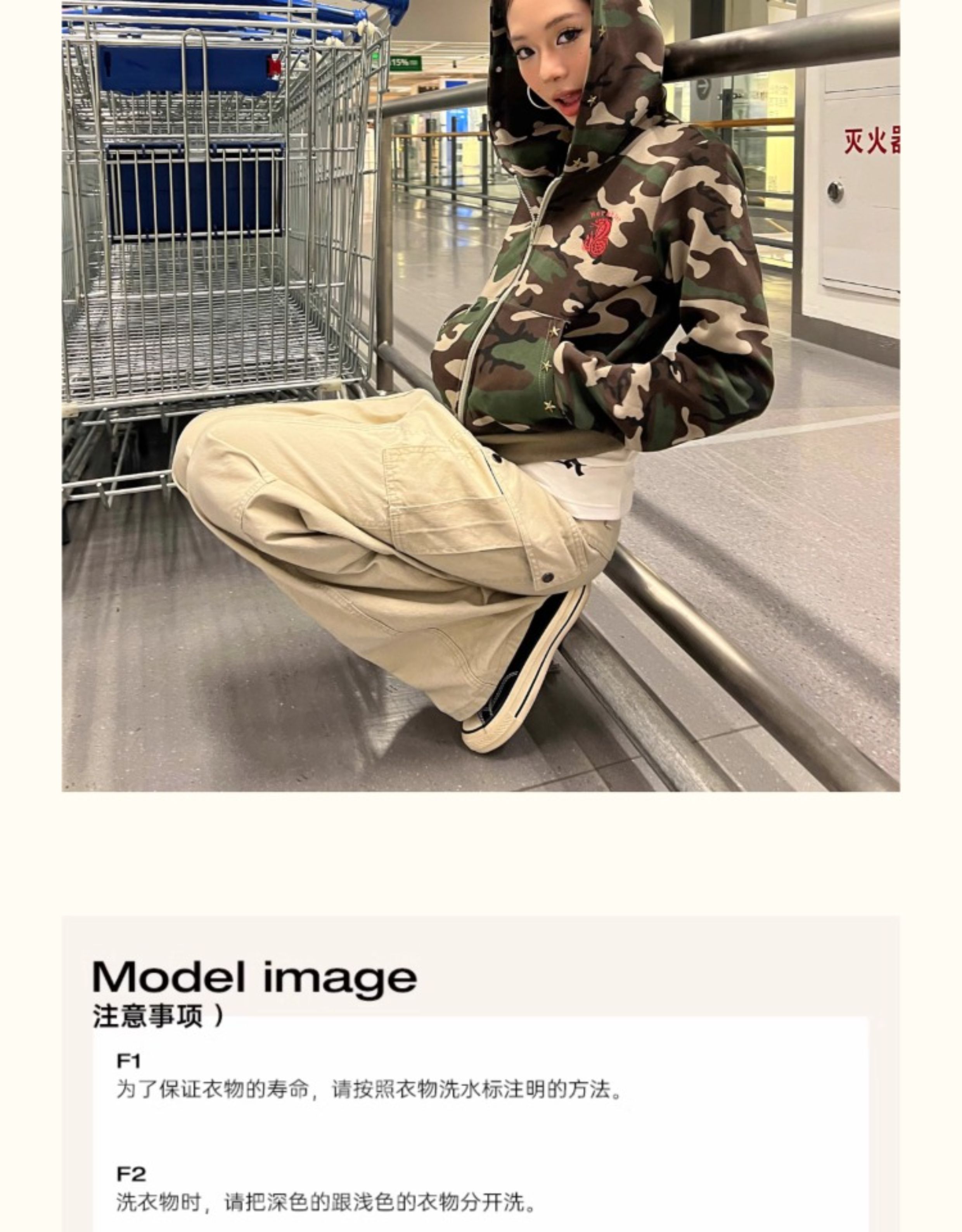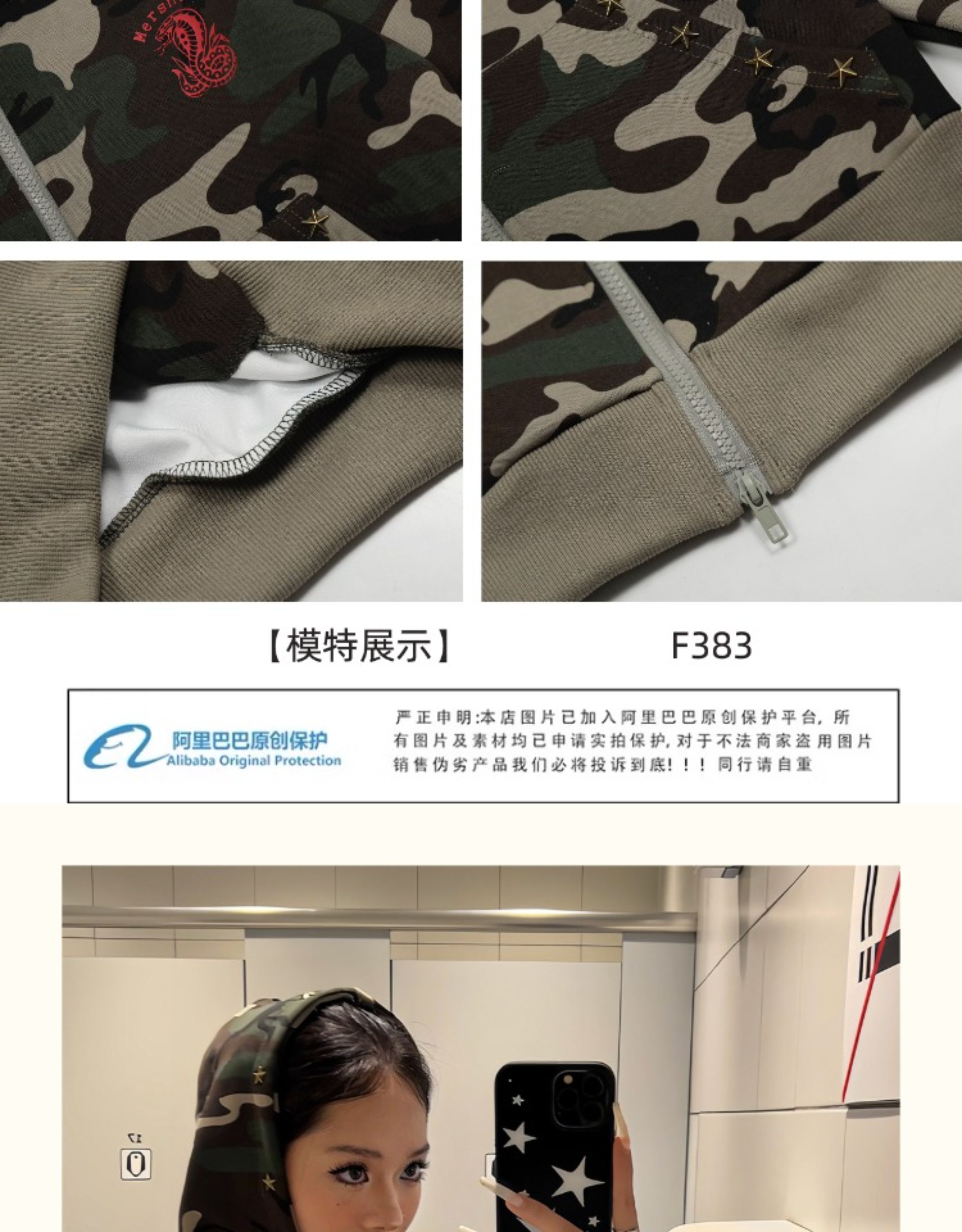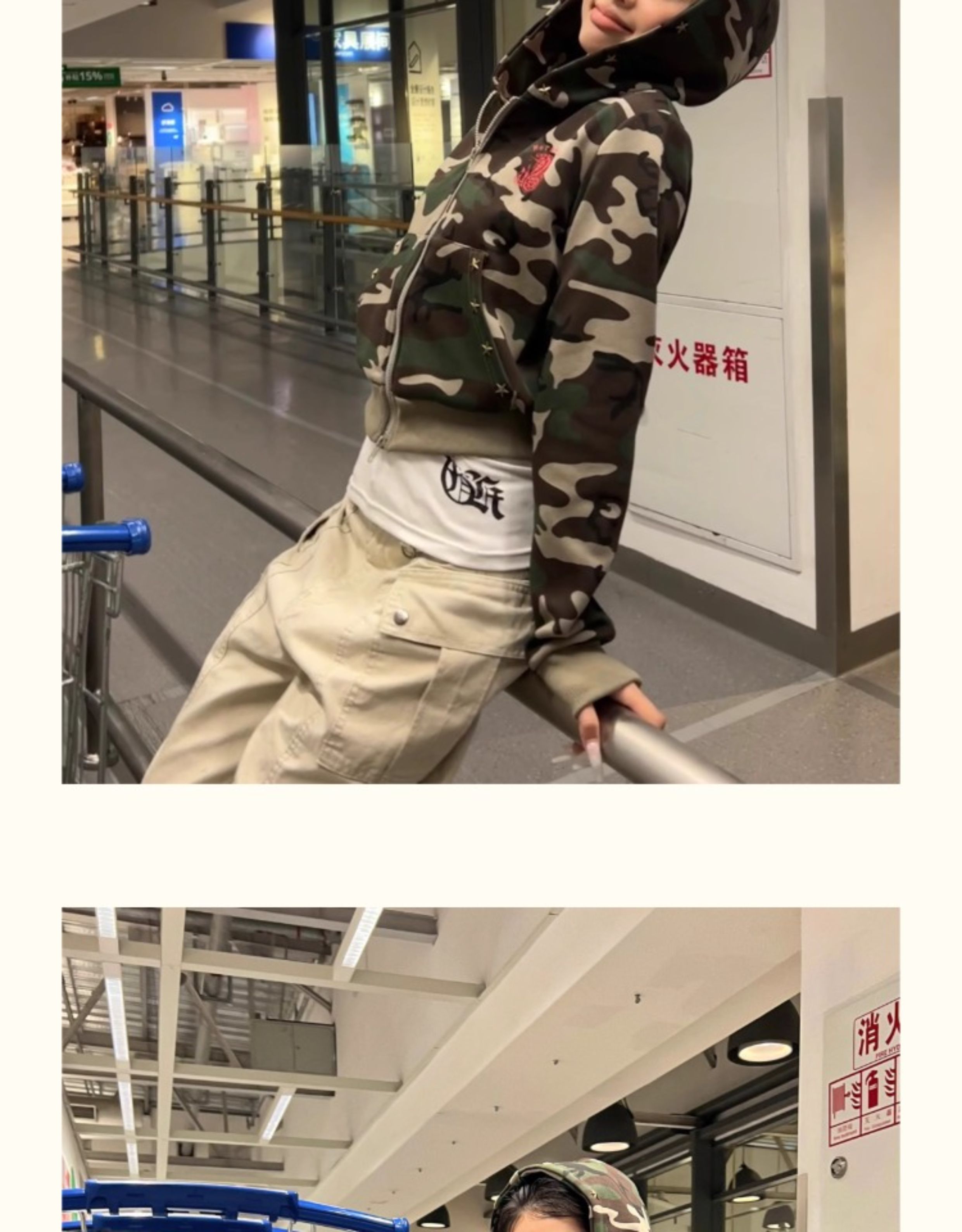 F383 2025 American Retro Lazy Style Color-Block Camouflage Cardigan Hooded Sweatshirt Loose Slimming Short Jacket for Women