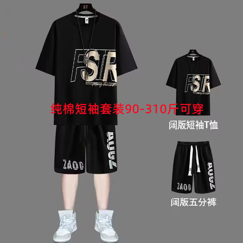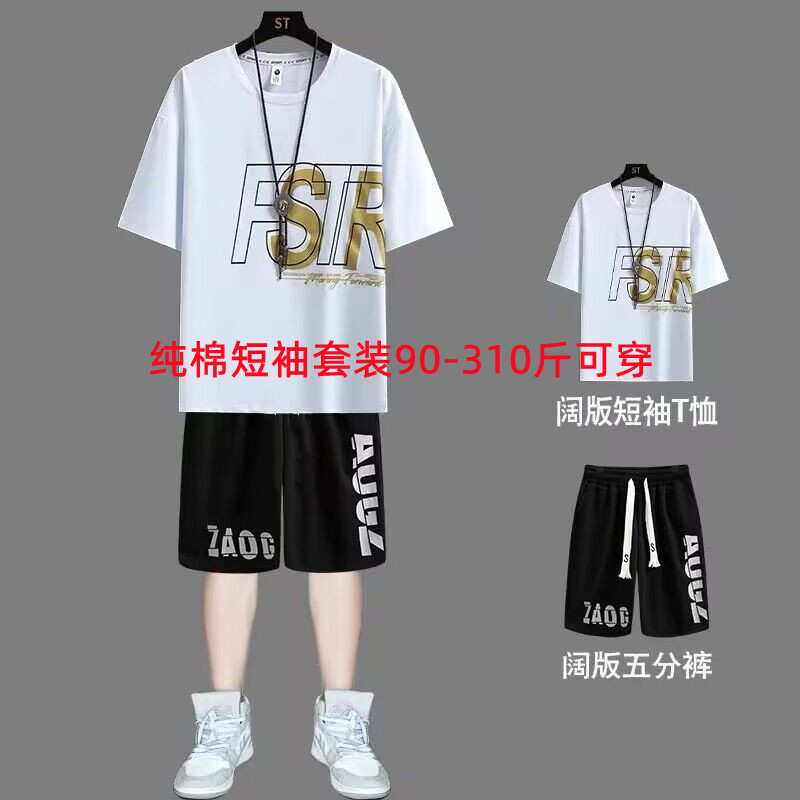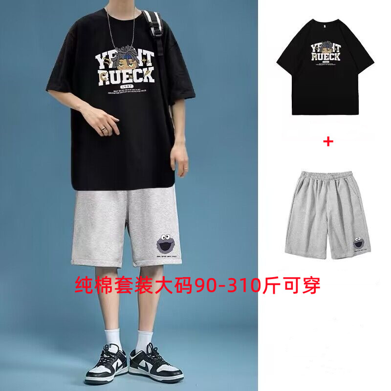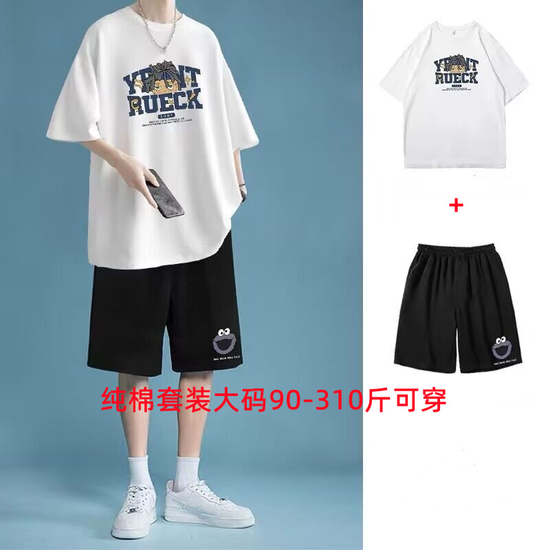 Summer Pure Cotton Short-Sleeved Suit for Men, Trendy Plus Size Casual Set with Shorts, Loose Two-Piece Set