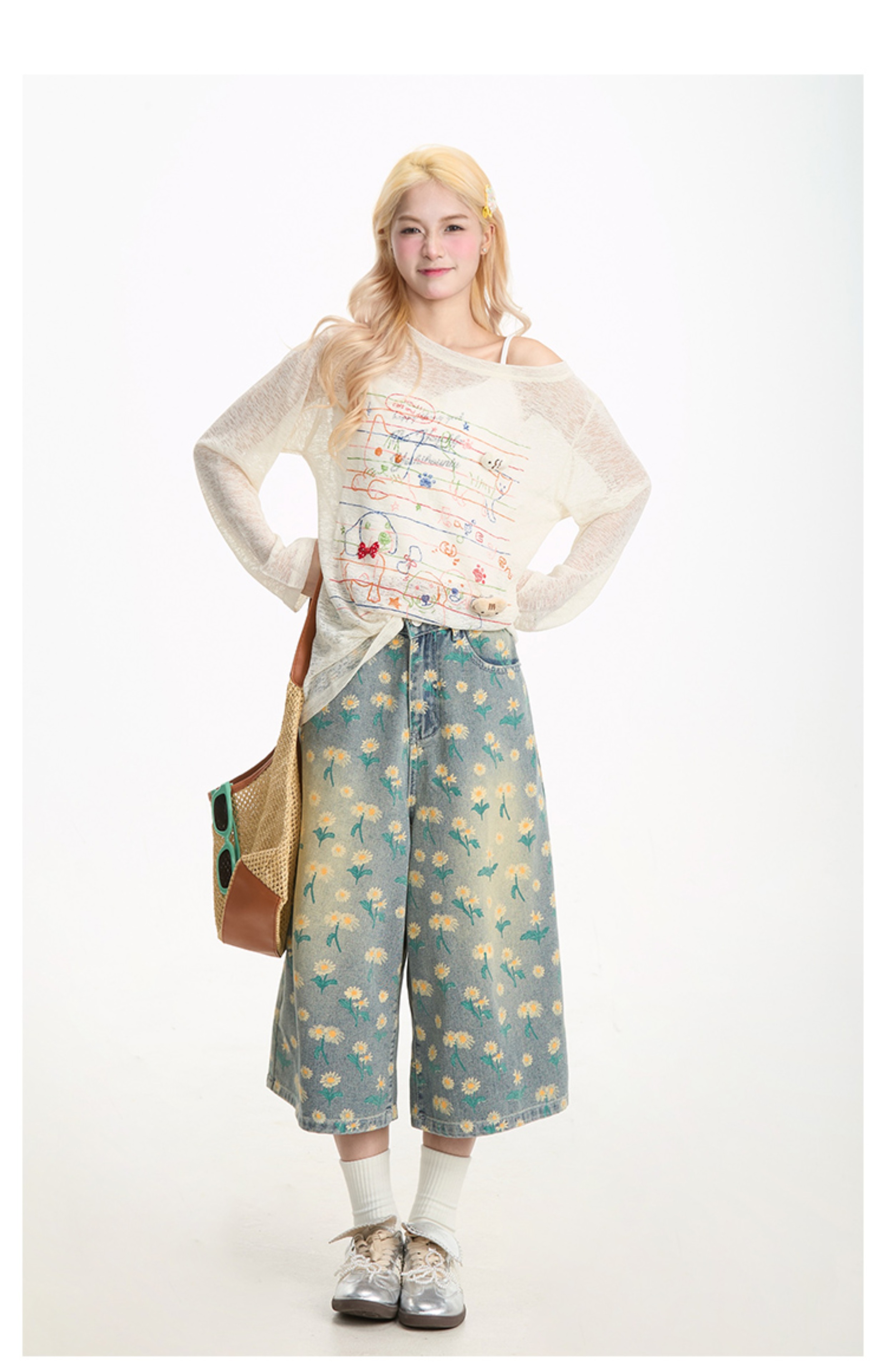 Neresum Cat and Dog Print Long-Sleeved T-Shirt for Women, New Sweet and Spicy Loose, Light and Slightly See-Through Spring and Summer Casual Blouse