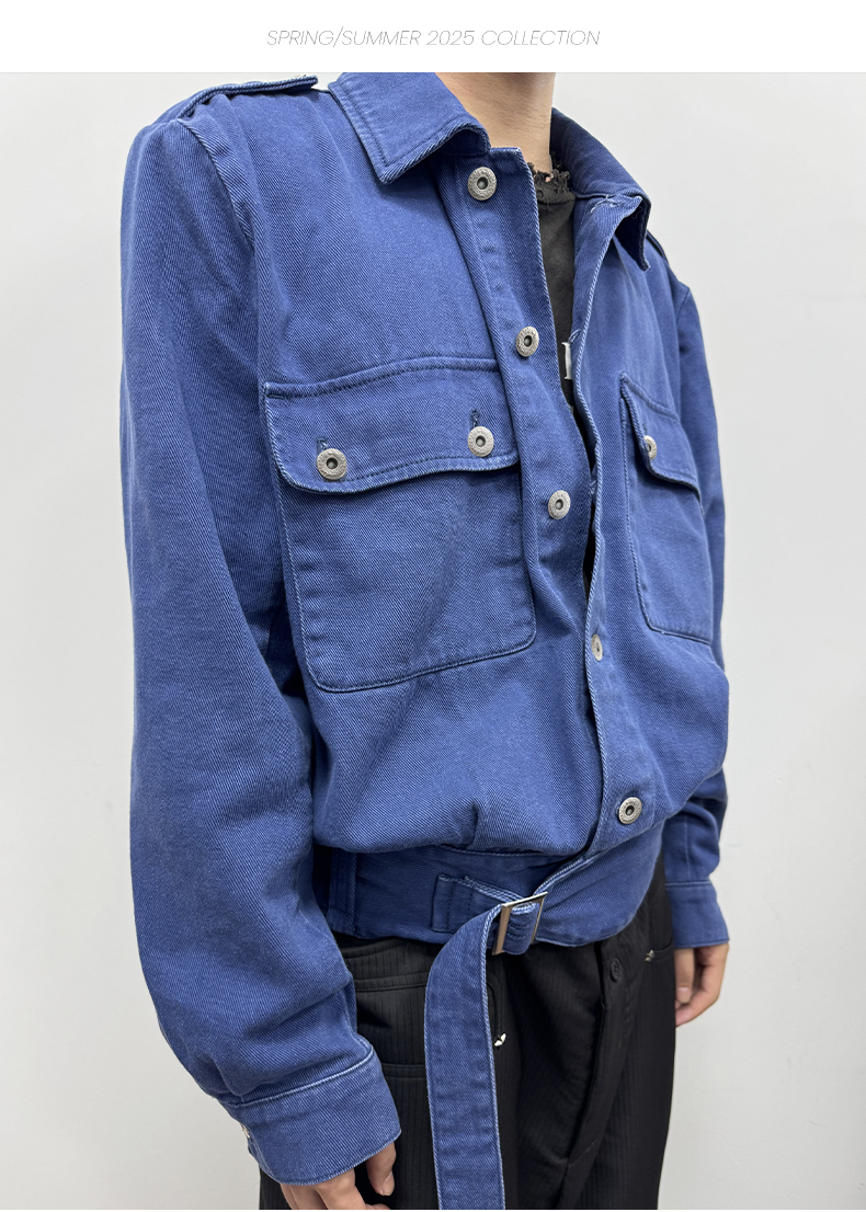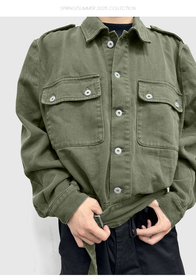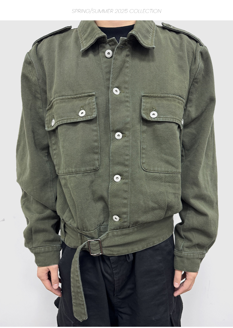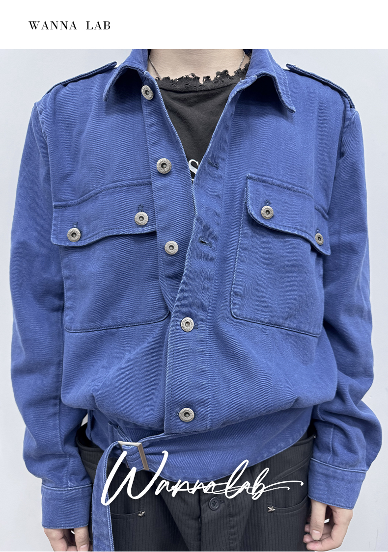 Wanna Lab 25Ss Military Denim Jacket with Adjustable Belt, Dutch Royal Army Jacket with Ykk Wheat Spike Buckle
