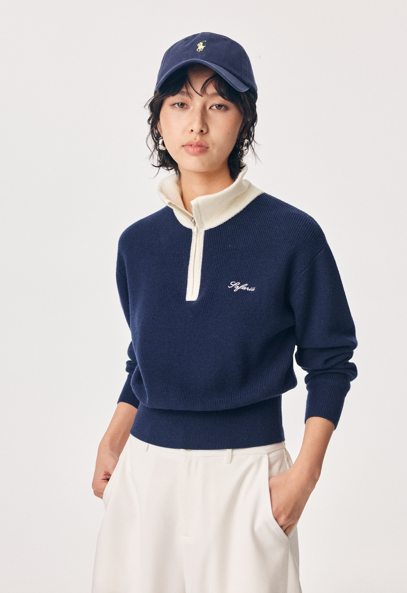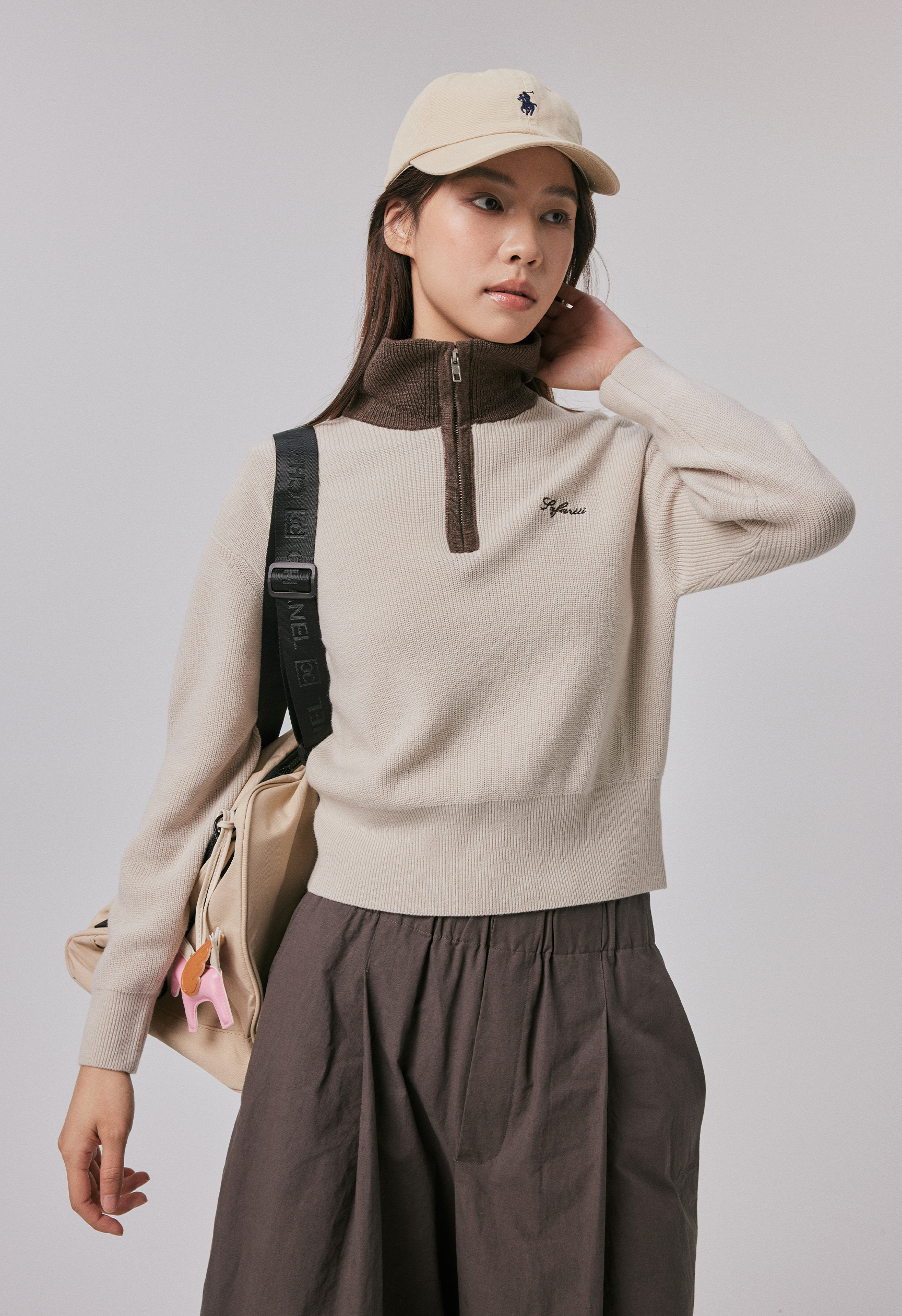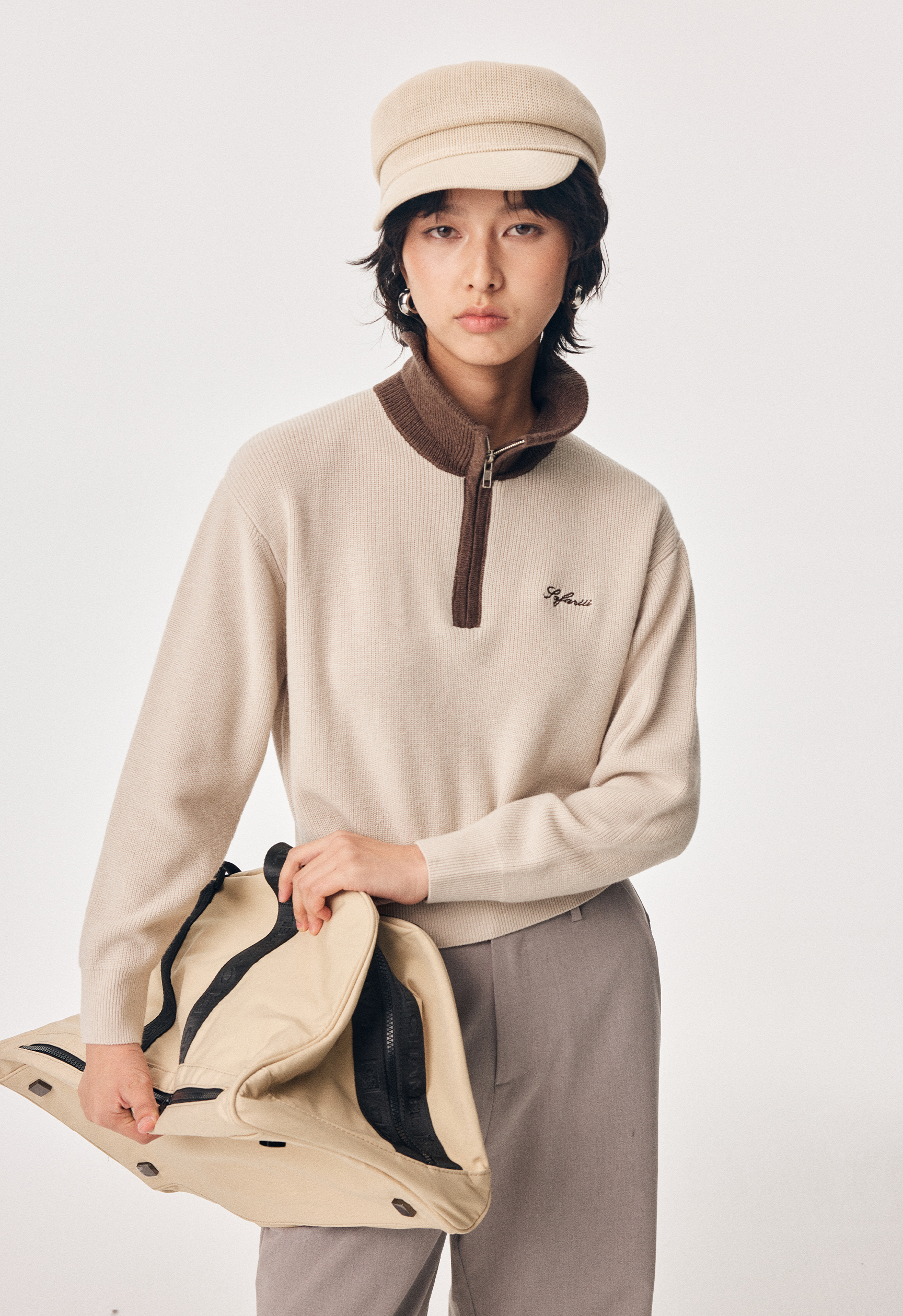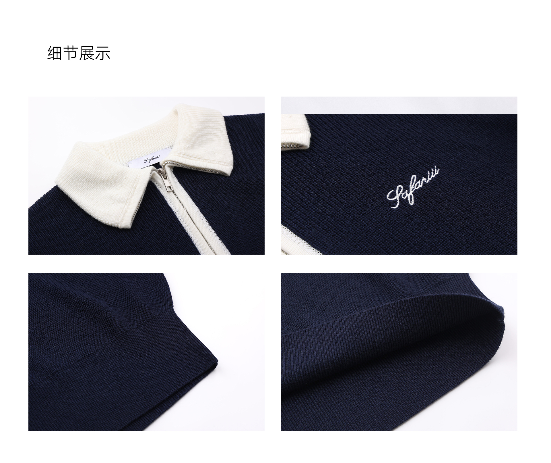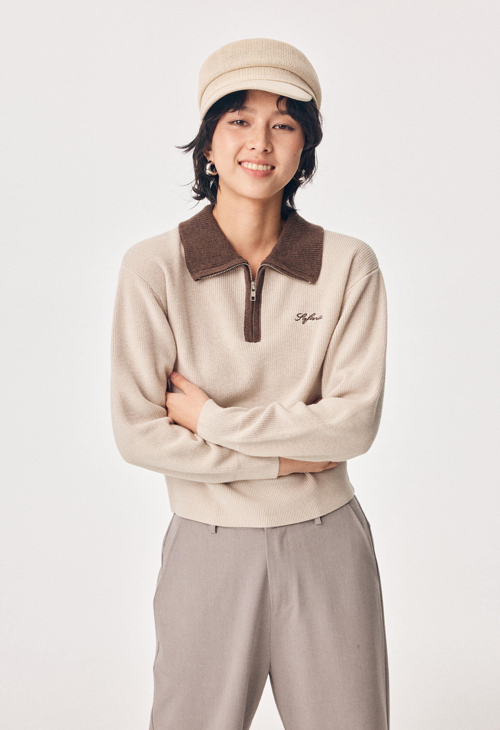Safariii2025 Autumn New Old Money Style Retro Color-Block Sweater with Turn-Down Collar and Zipper Knitted Long-Sleeve Sweater for Women