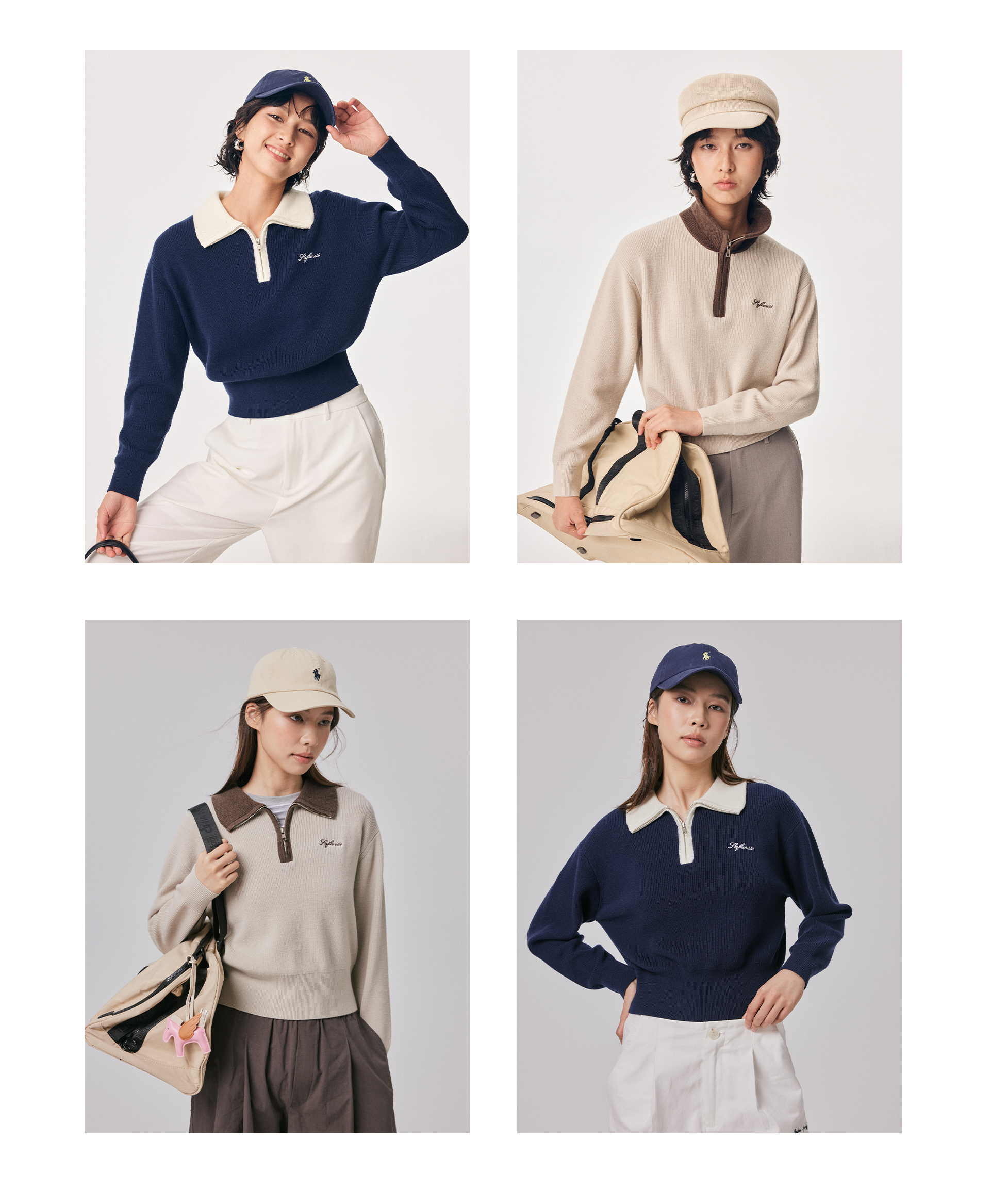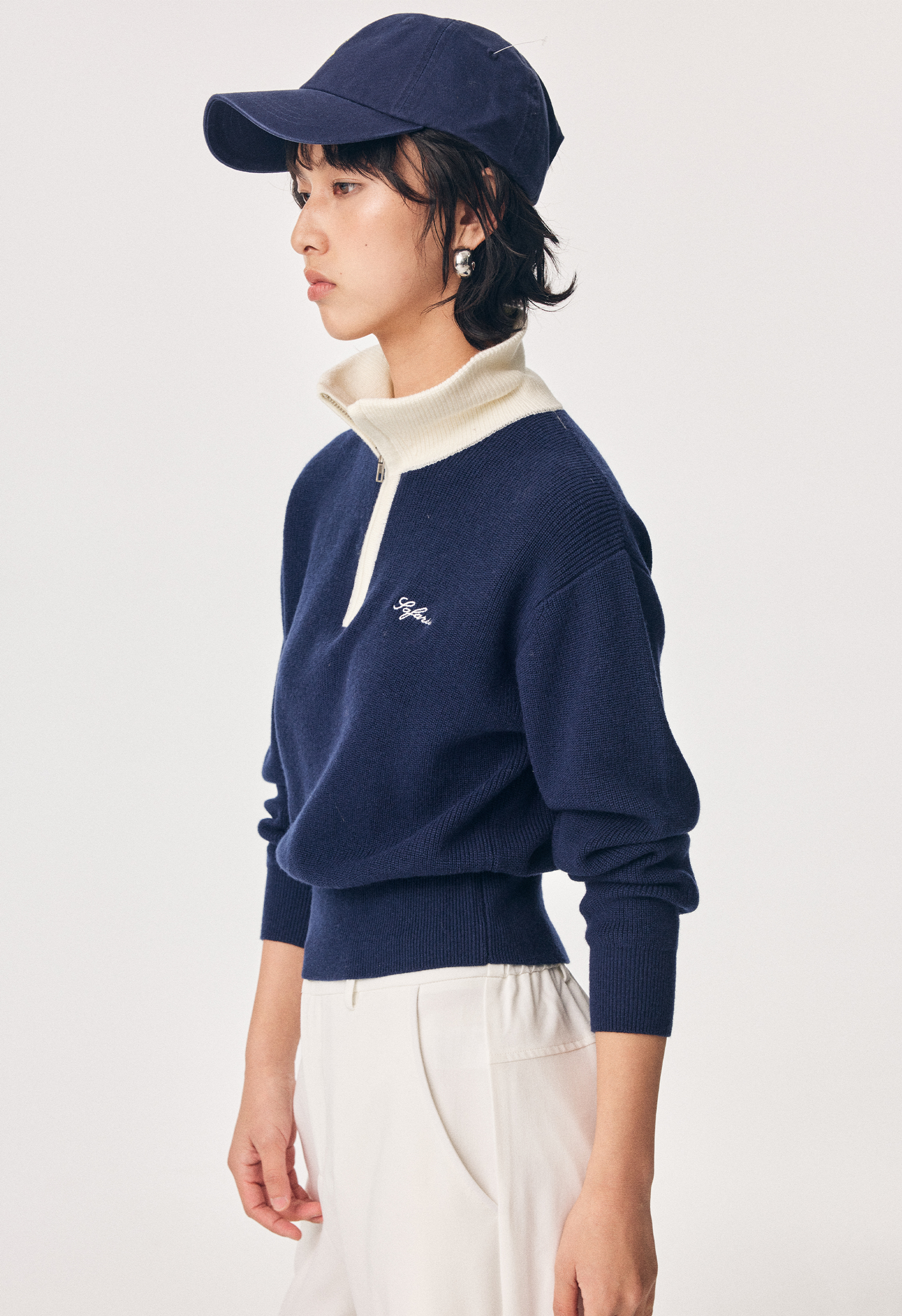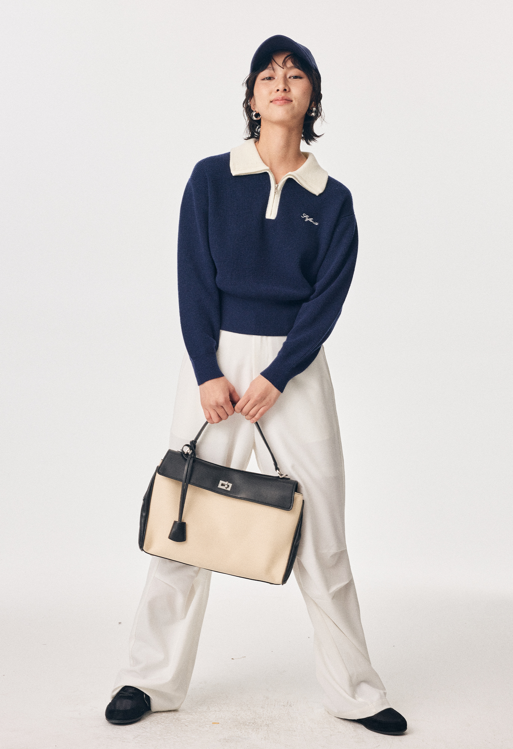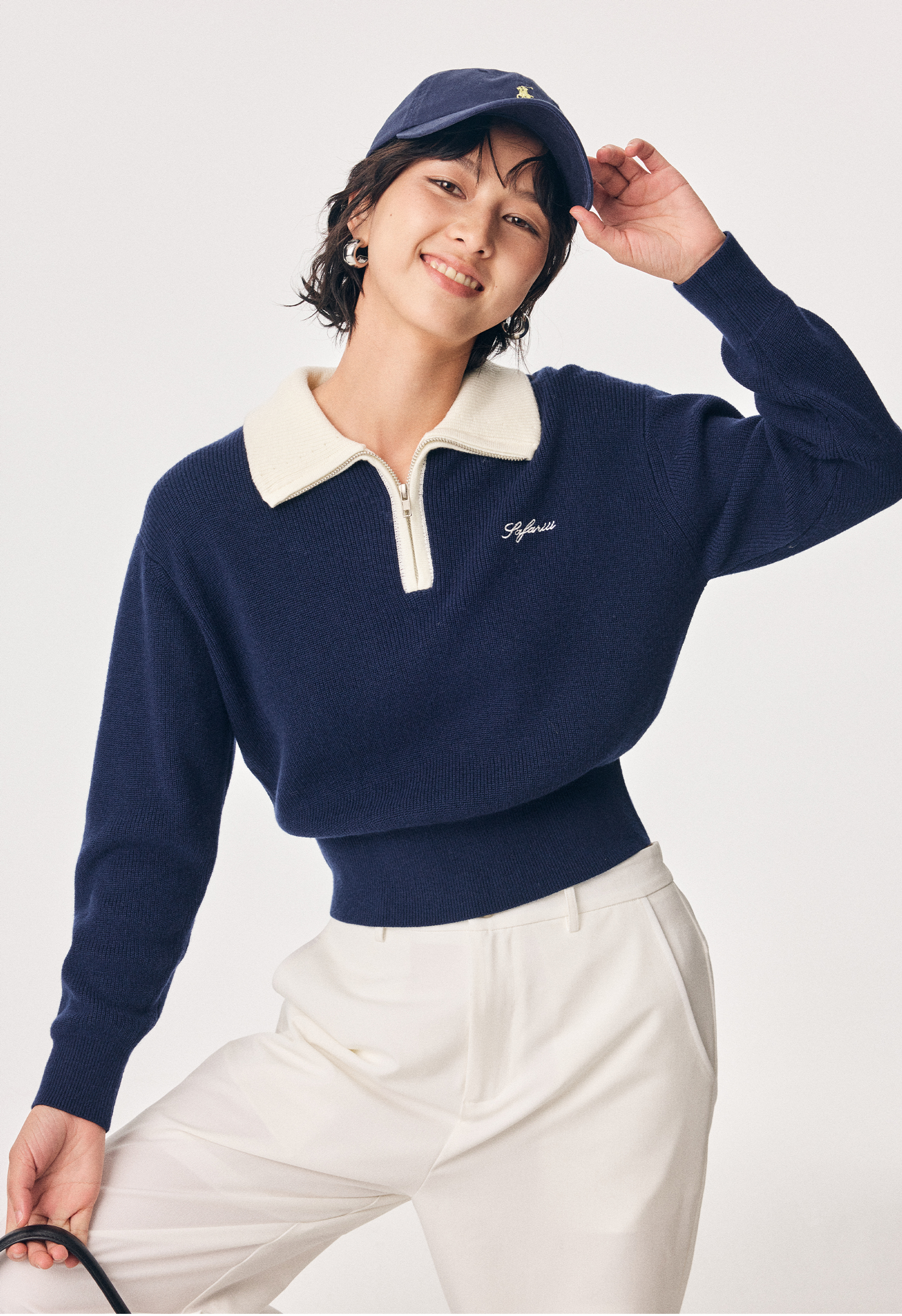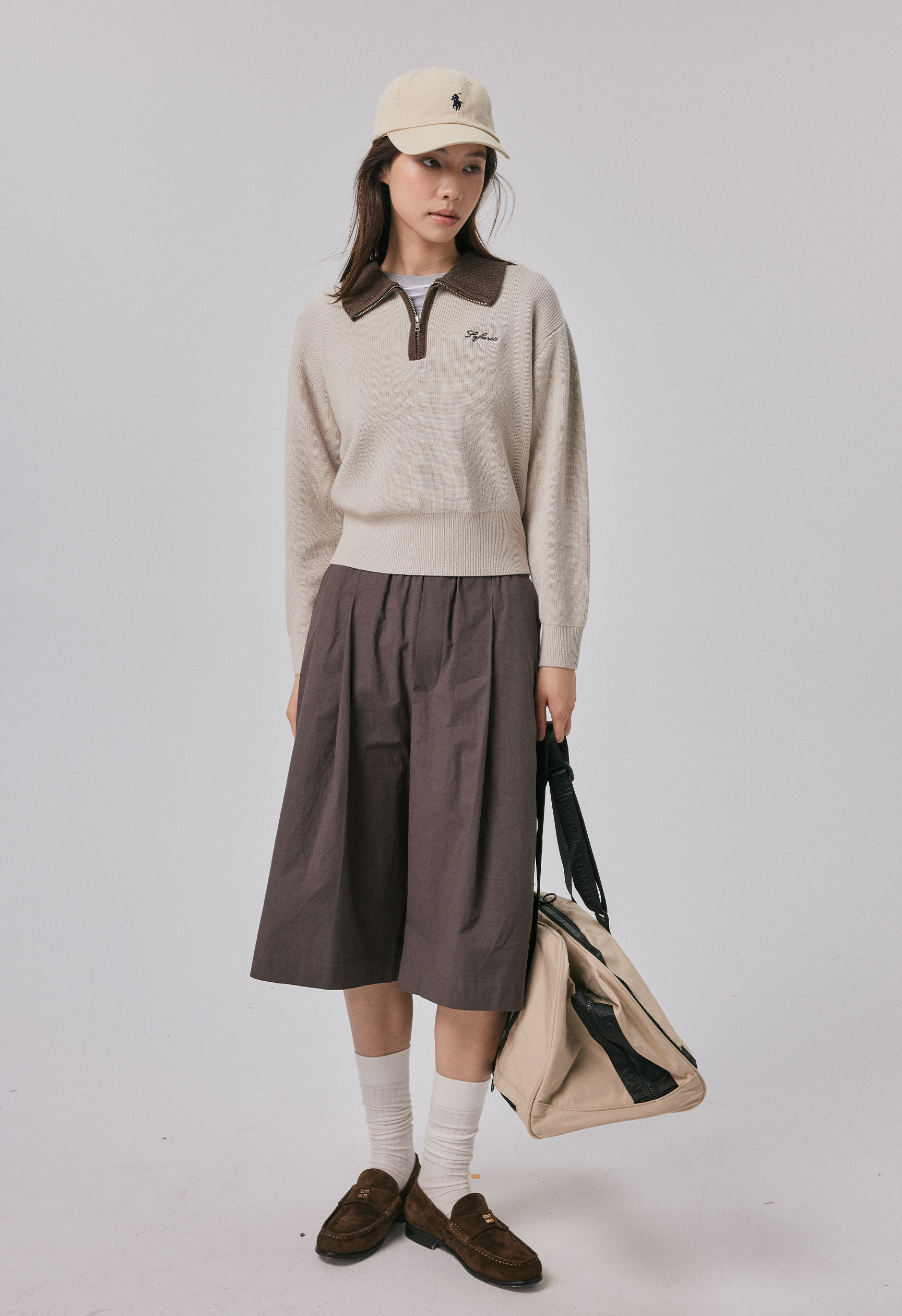 Safariii2025 Autumn New Old Money Style Retro Color-Block Sweater with Turn-Down Collar and Zipper Knitted Long-Sleeve Sweater for Women