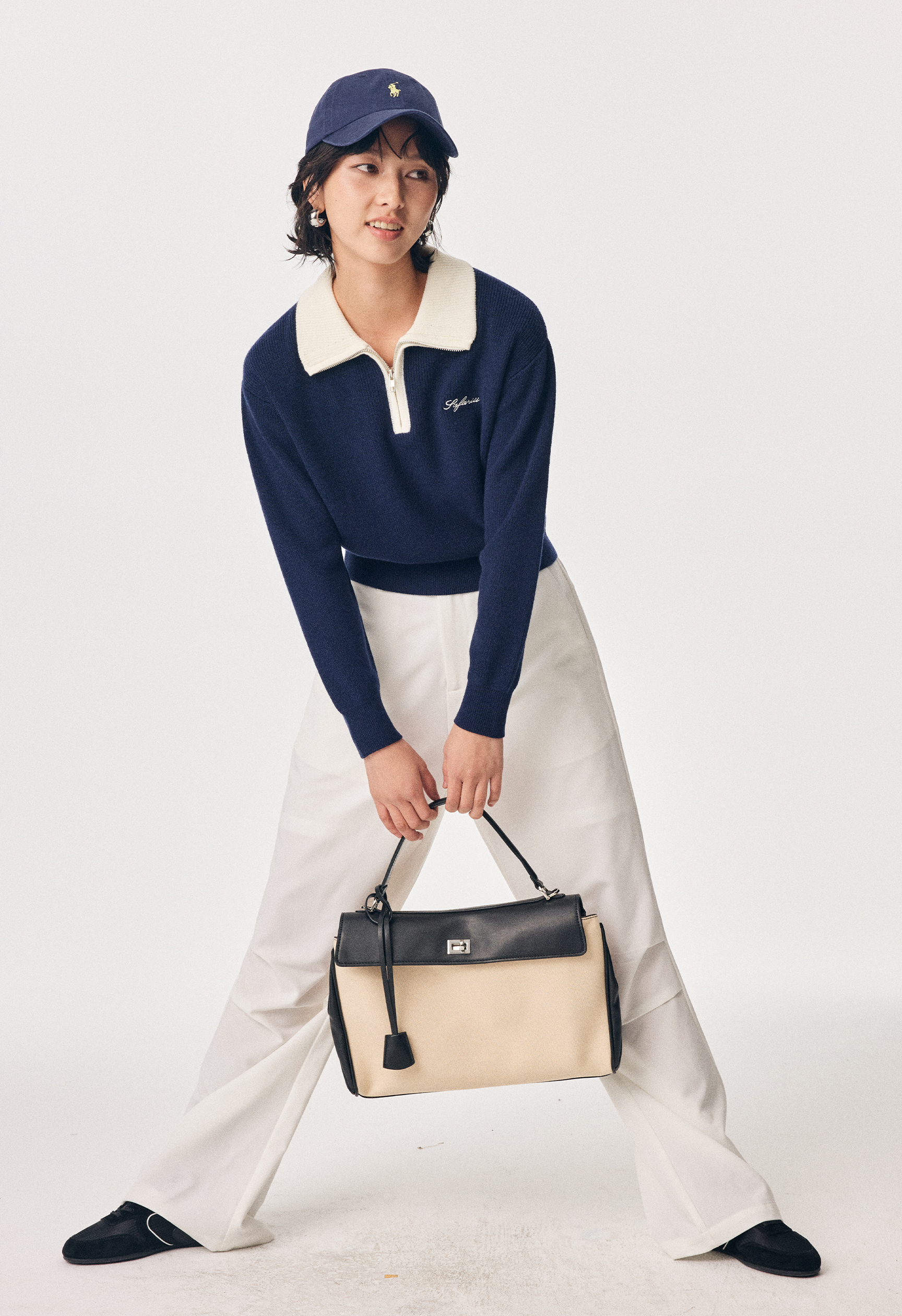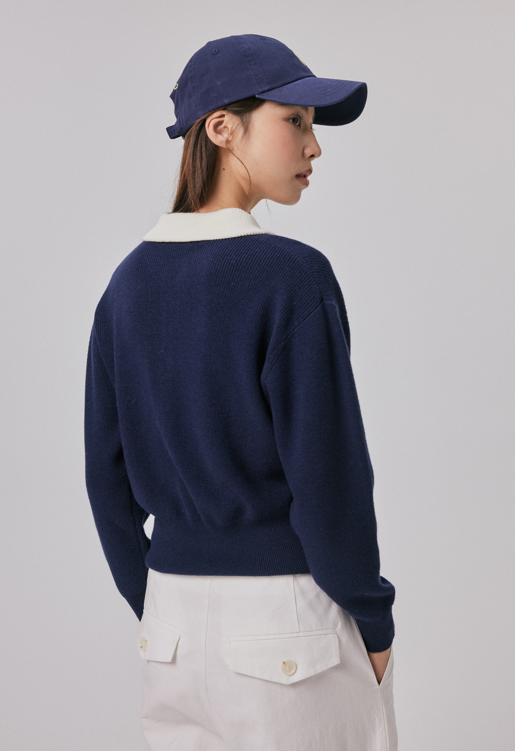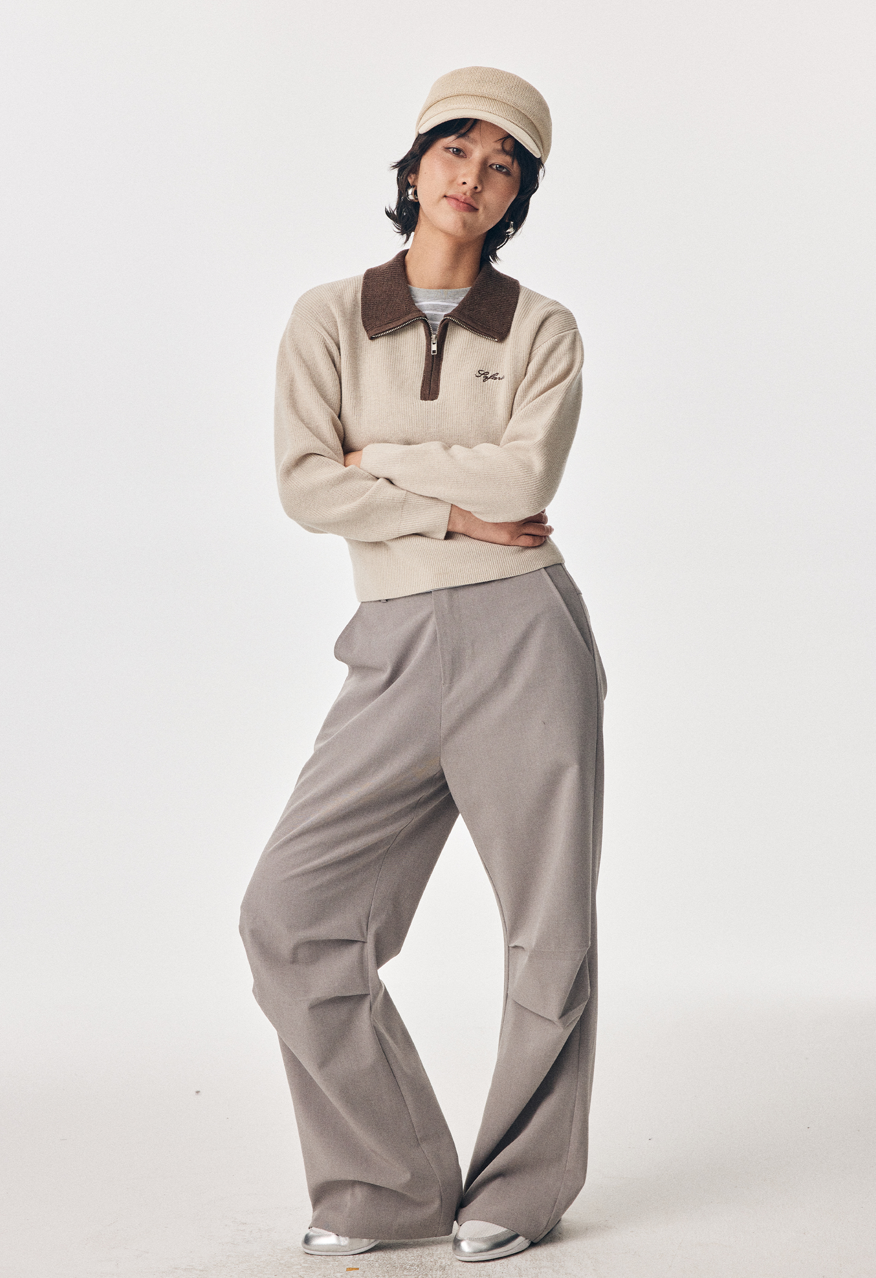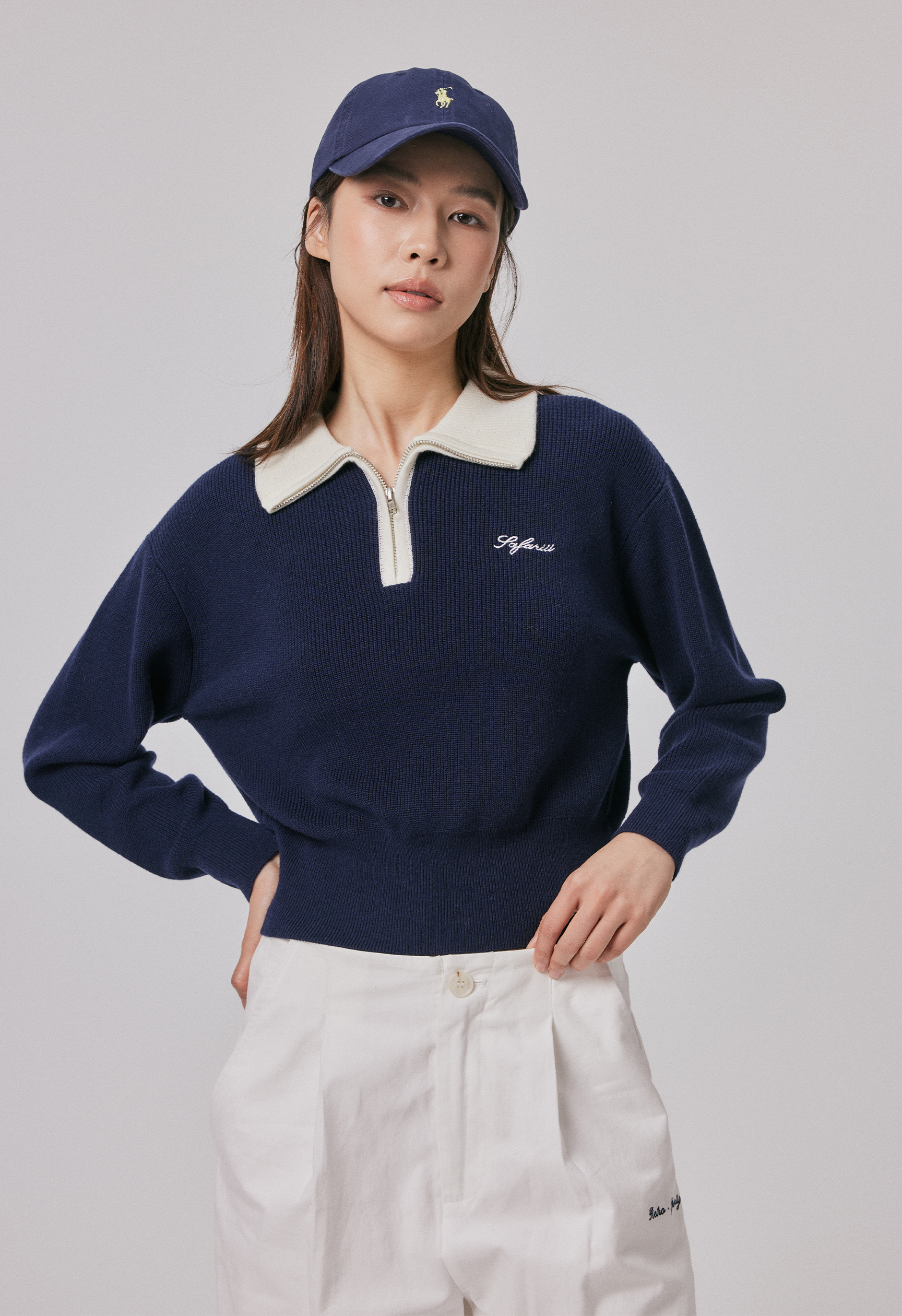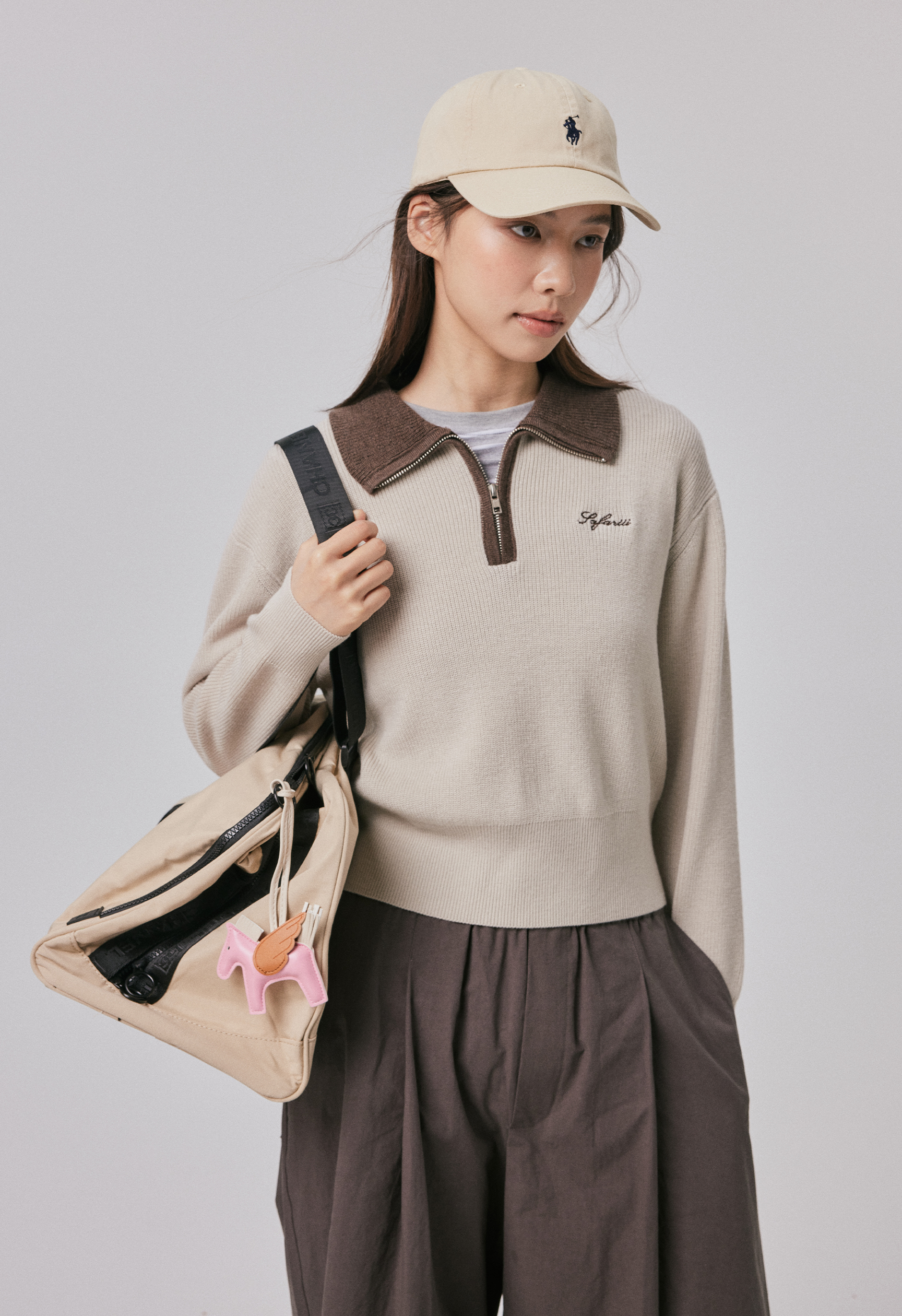 Safariii2025 Autumn New Old Money Style Retro Color-Block Sweater with Turn-Down Collar and Zipper Knitted Long-Sleeve Sweater for Women
