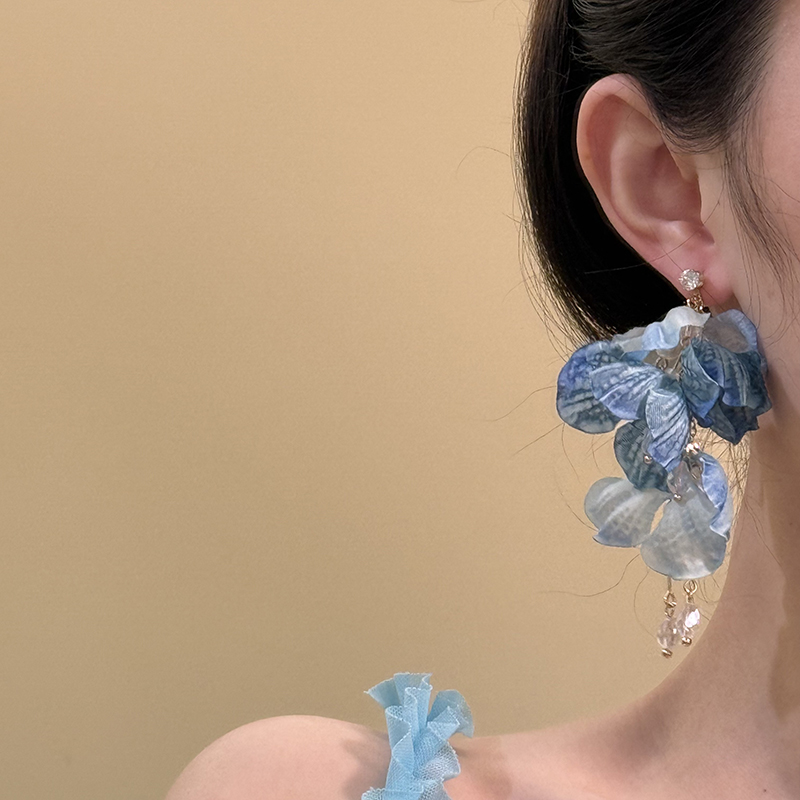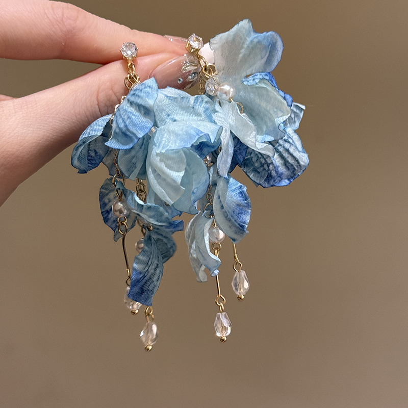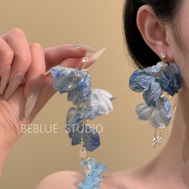 Dew-Dyed Rouge~ Summer Super Fairy-Like Unique Vacation Niche Blue Flower Earrings for Women, Exaggerated Long Earrings/Ear Clips