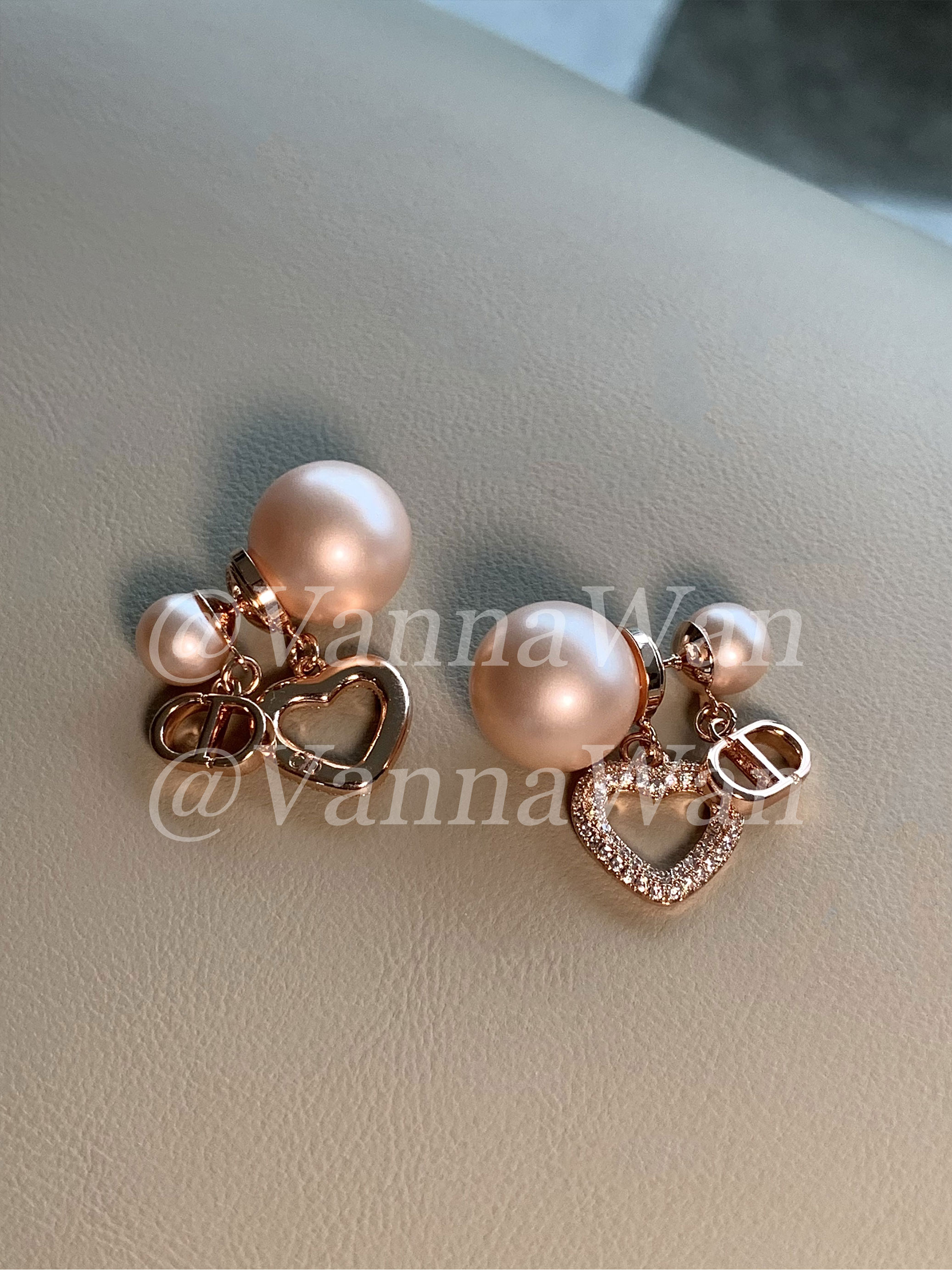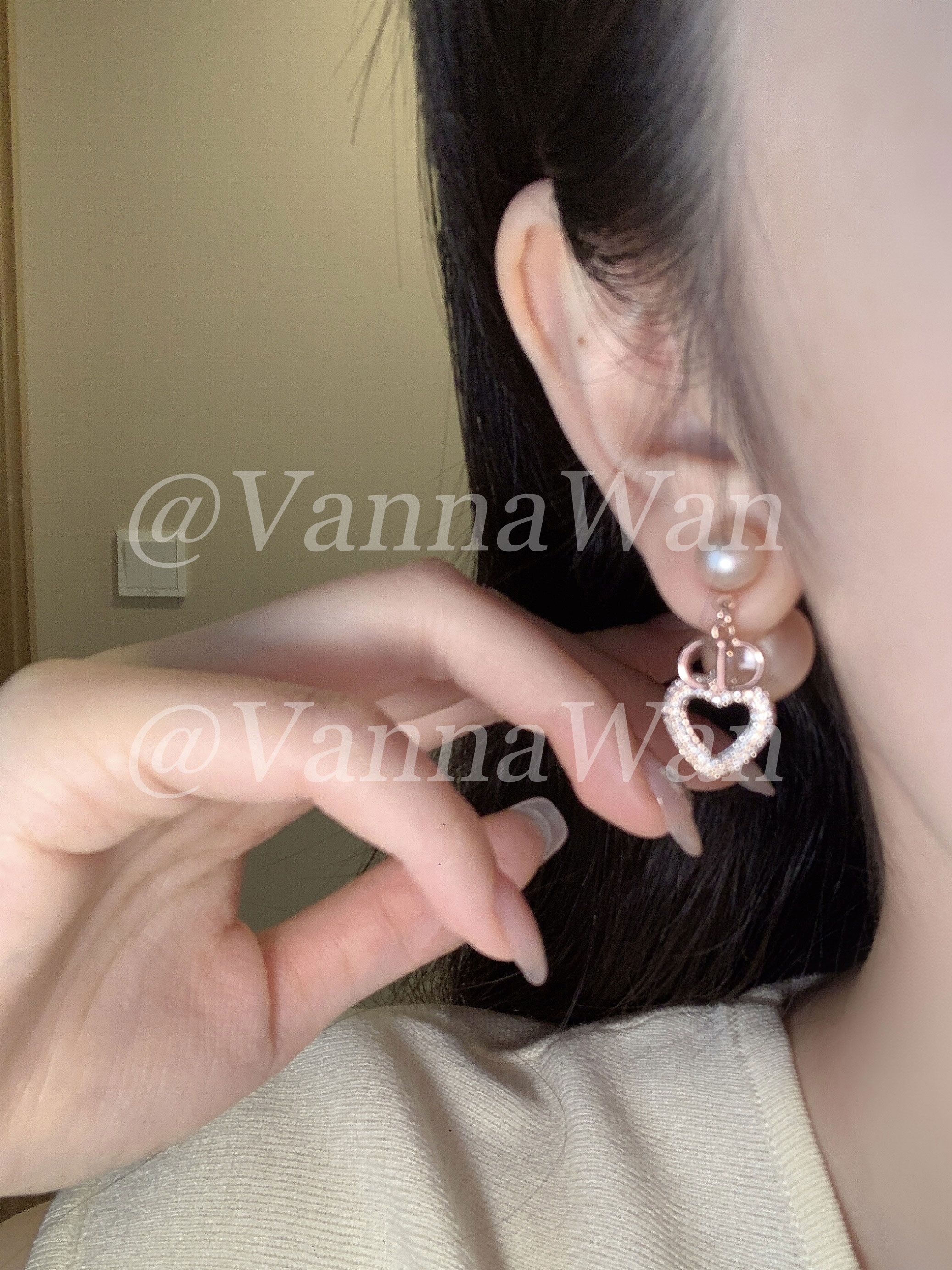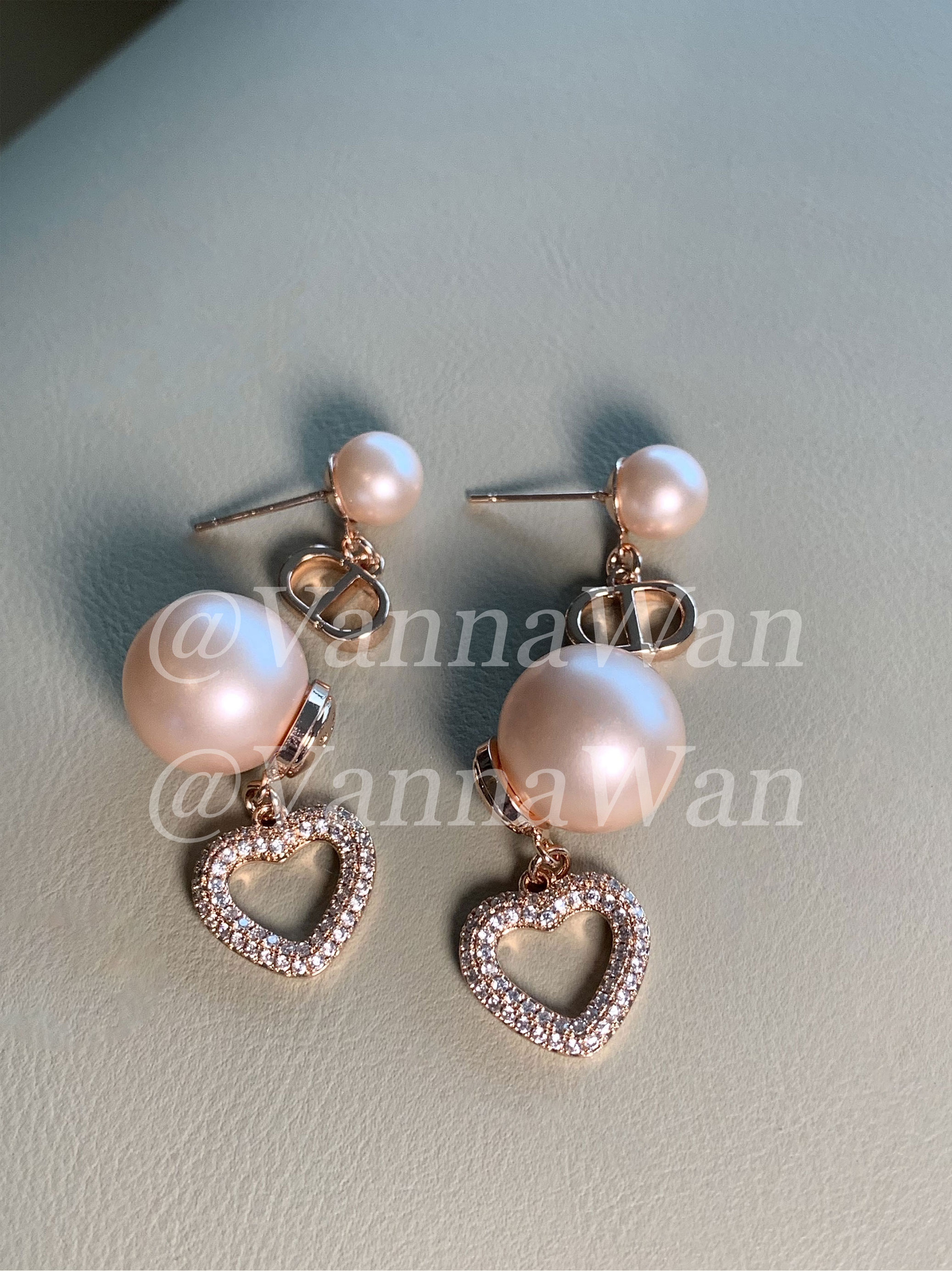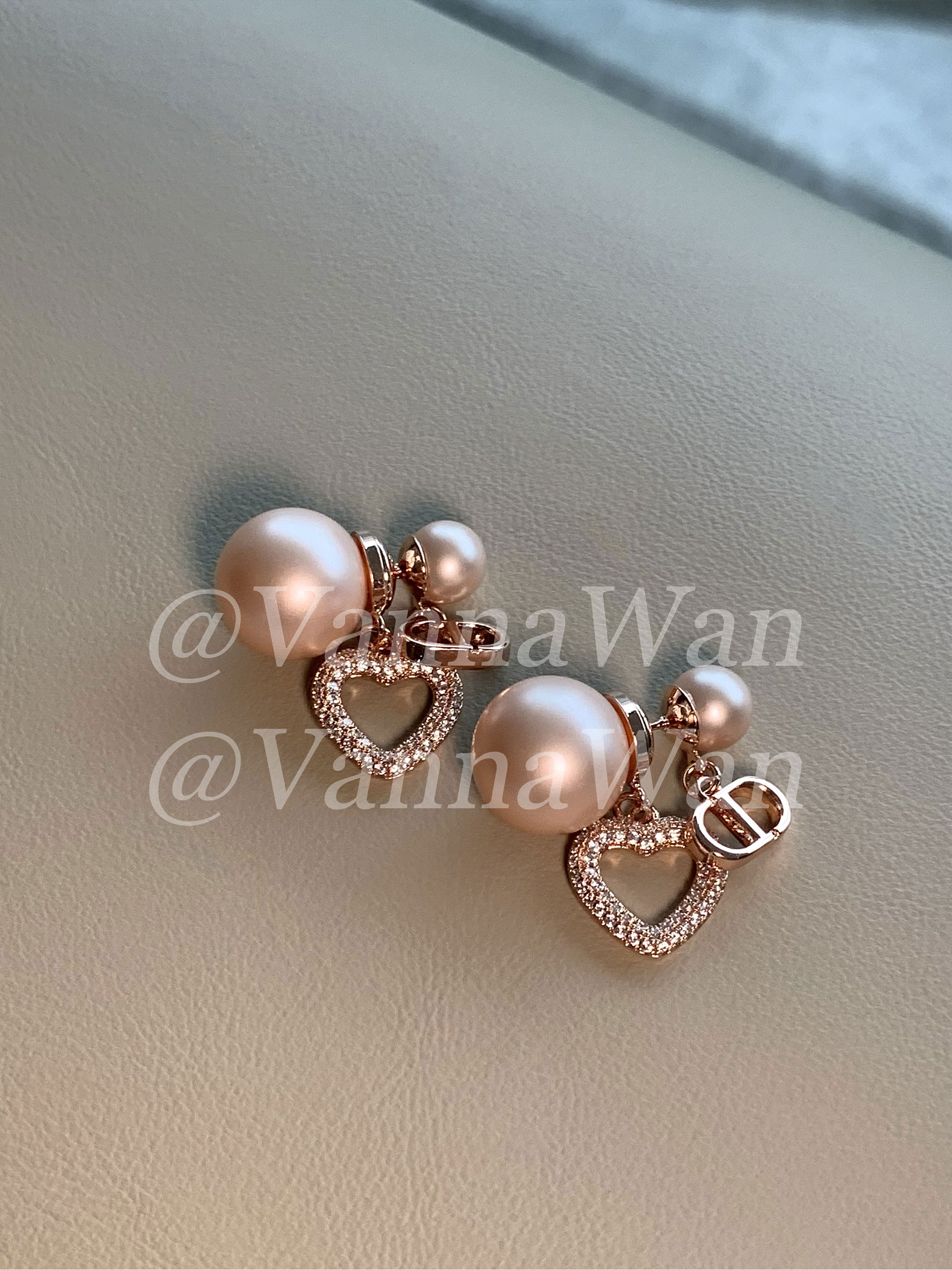 Vanwan Buyer Edition! D! Front and Back Pink Bead Earrings with Pig Nose Rhinestone Heart Pendant, High-End Cd Earrings