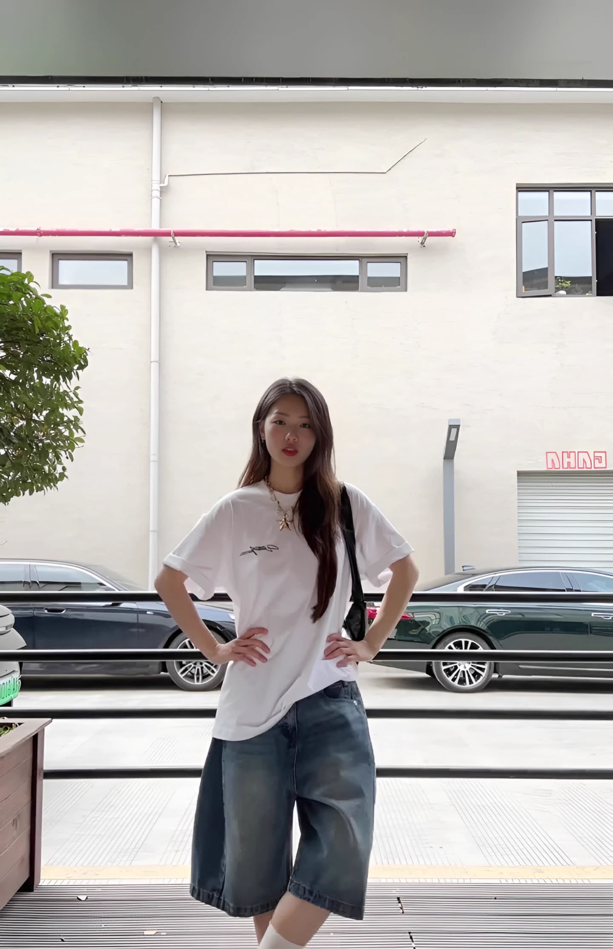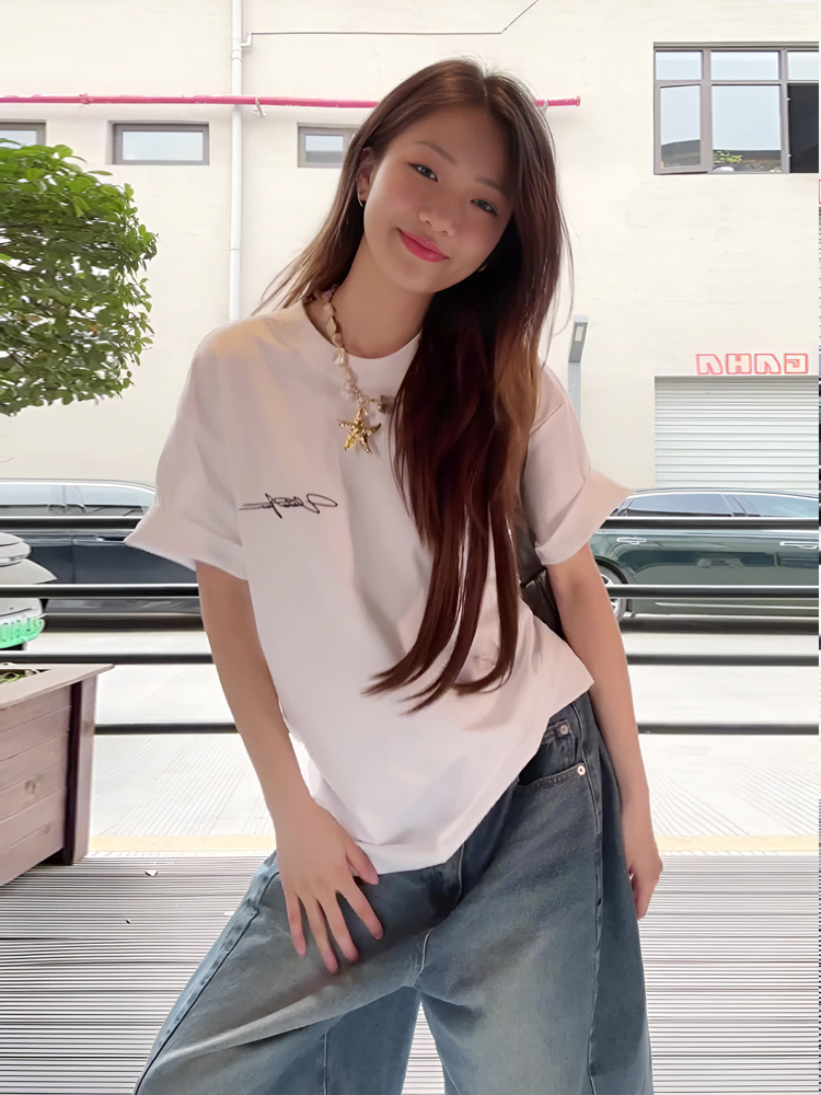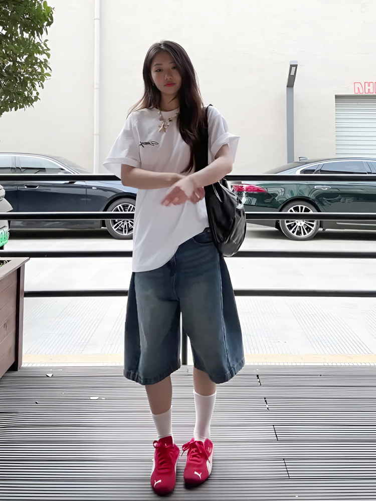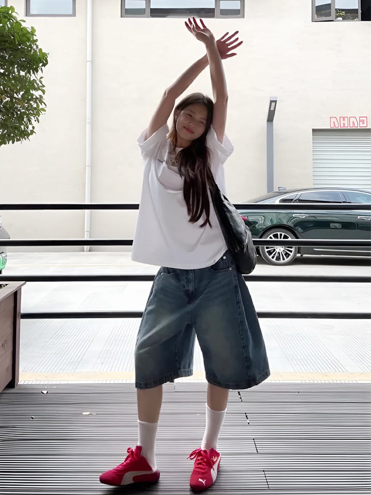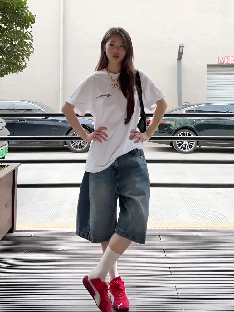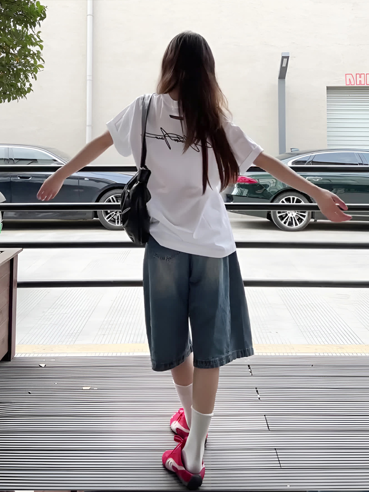 American Retro Casual Washed Blue Mid-Length Pants Distressed Wide-Leg Cropped Pants Jeans Straight-Leg Shorts for Women Summer
