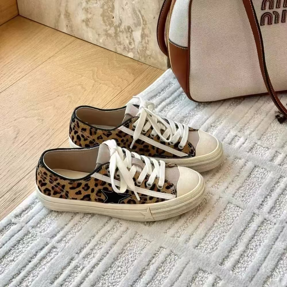 Hong Kong Flat Canvas Shoes for Women 2025 Spring and Autumn New Genuine Leather Versatile Casual Shoes Korean Style Leopard Print Sneakers Trendy