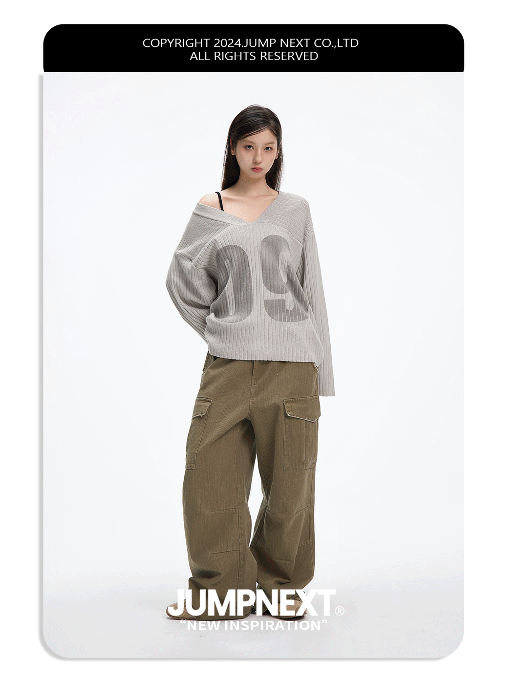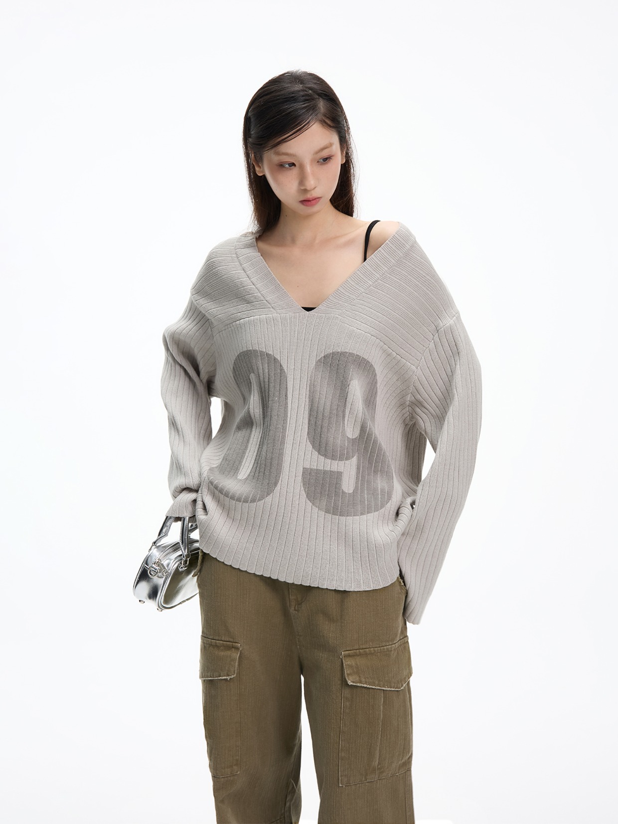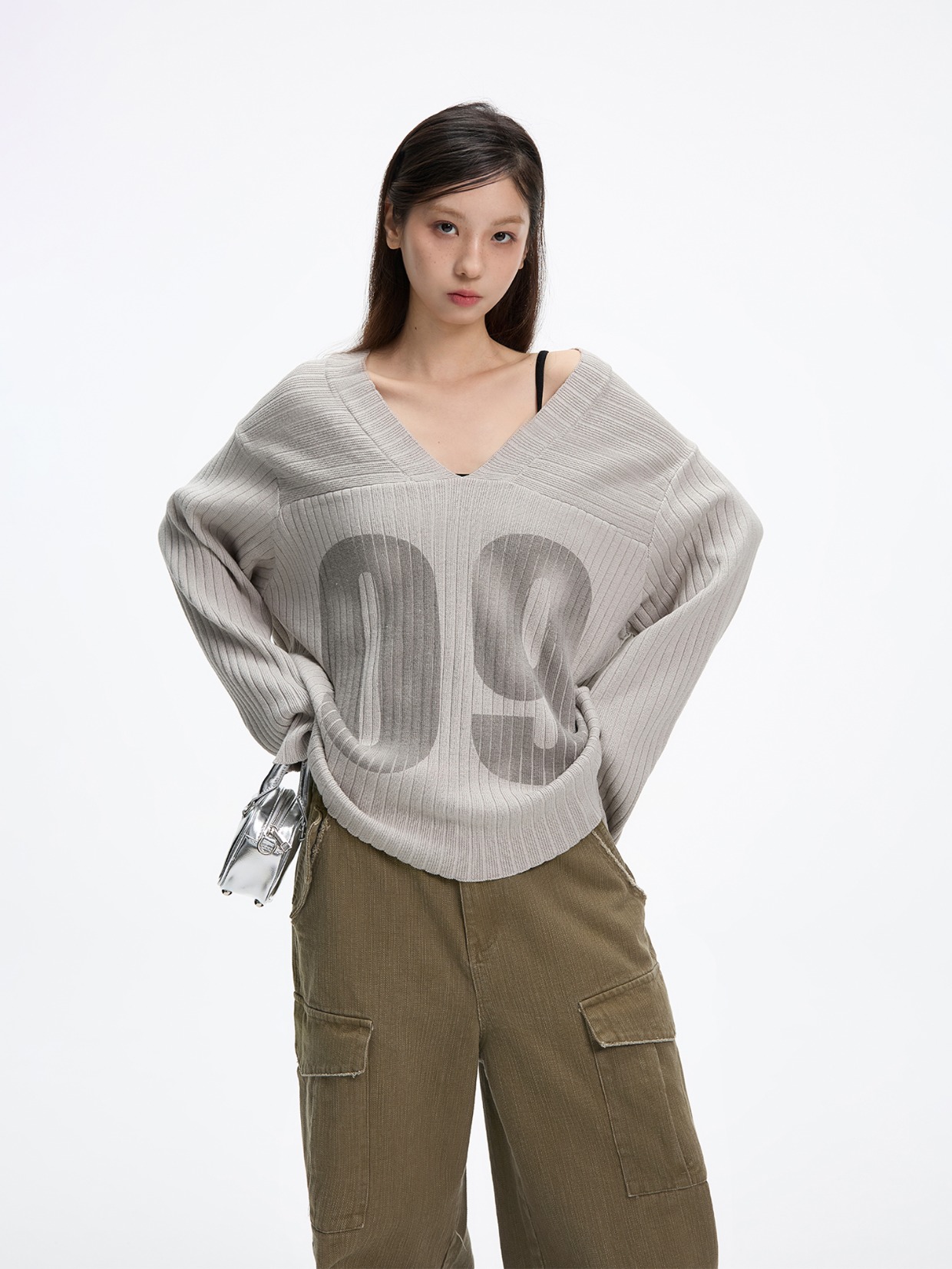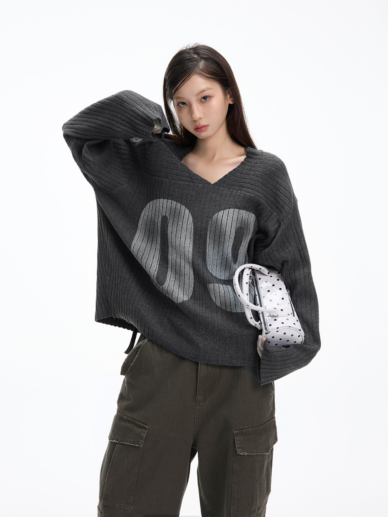 Jumpnext Retro Loose Design Digital Print V-Neck Sweater Knitted Long-Sleeved Jersey Off-Shoulder Top