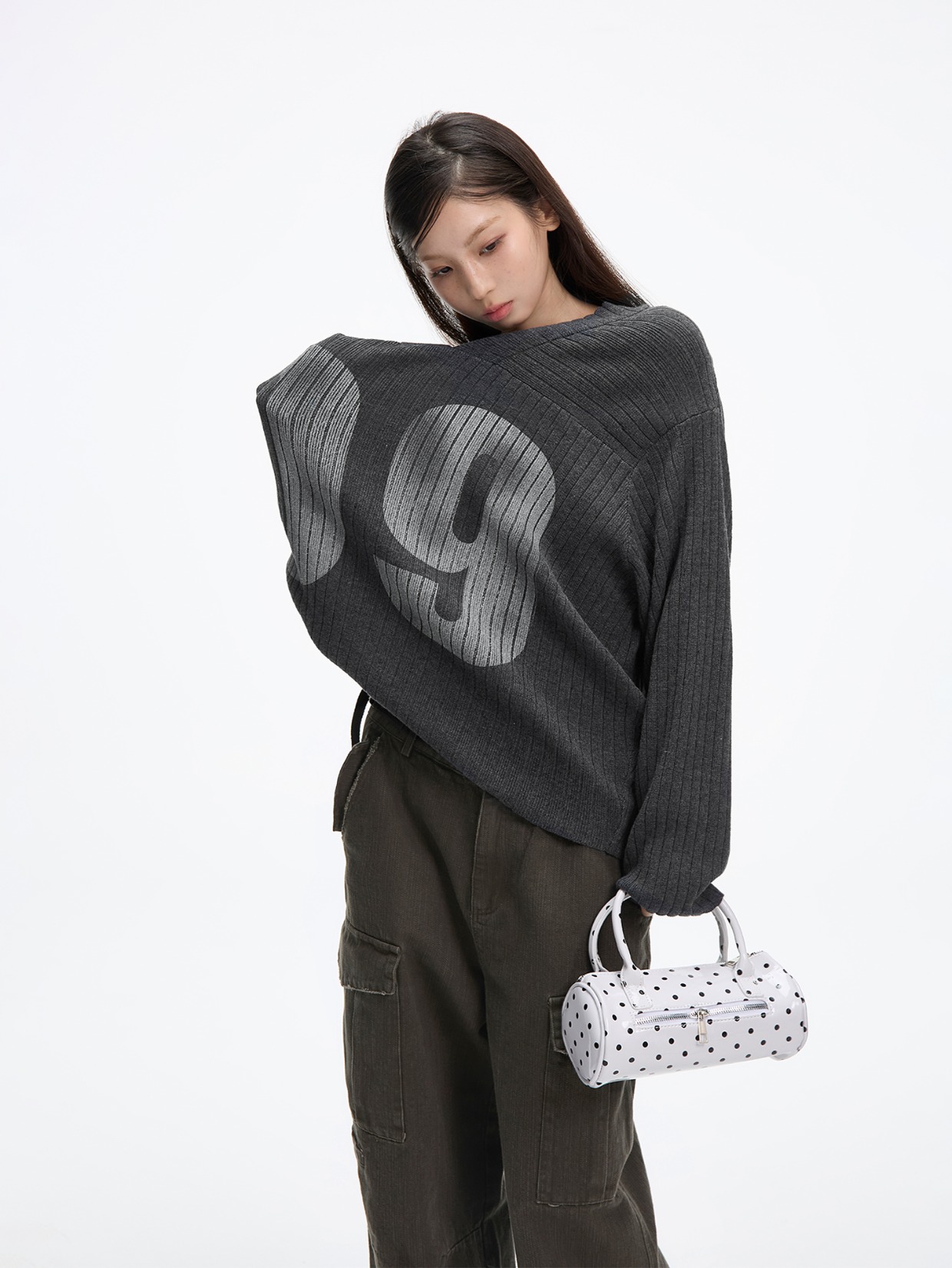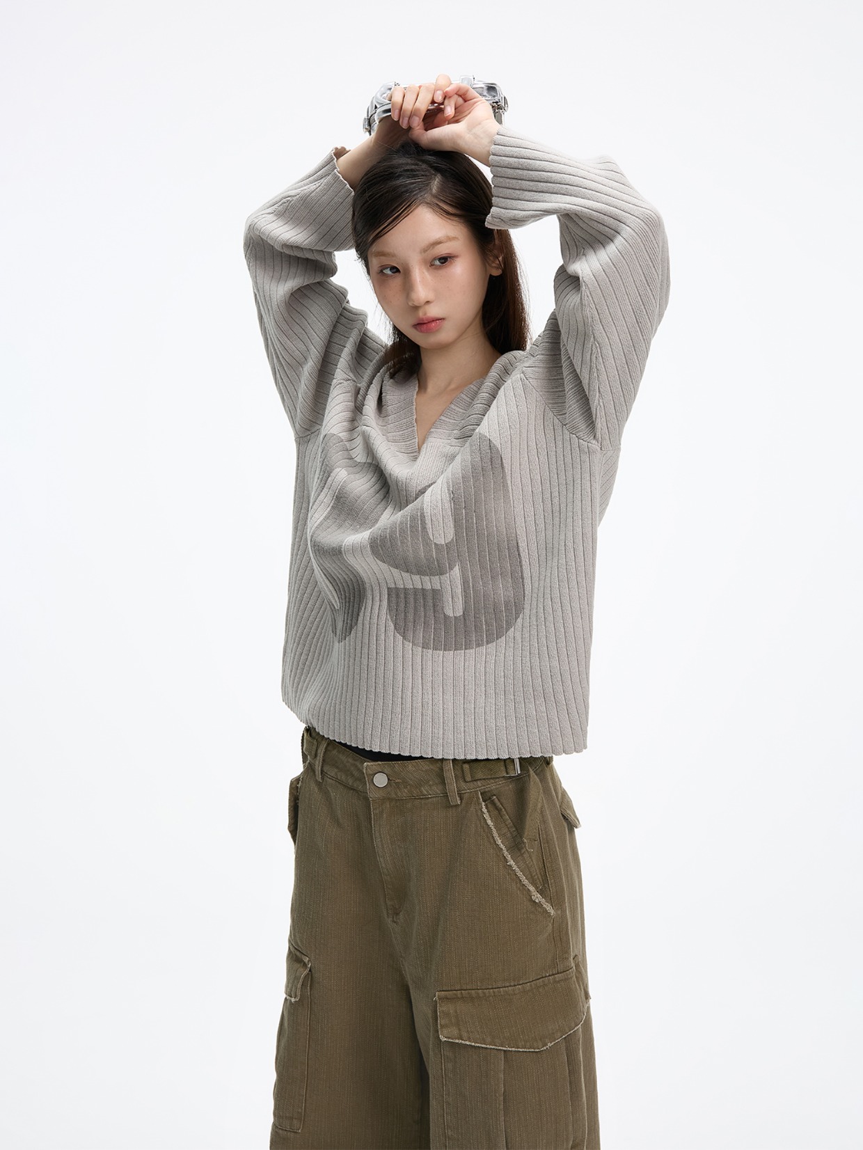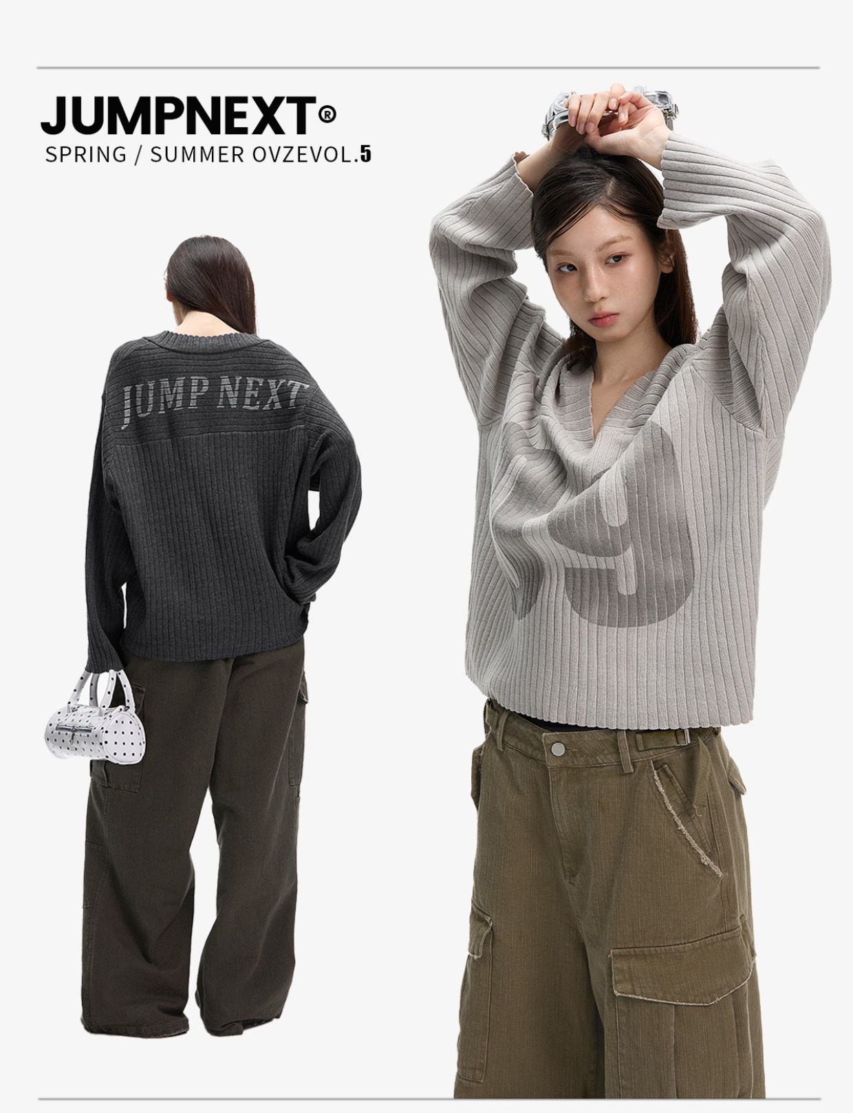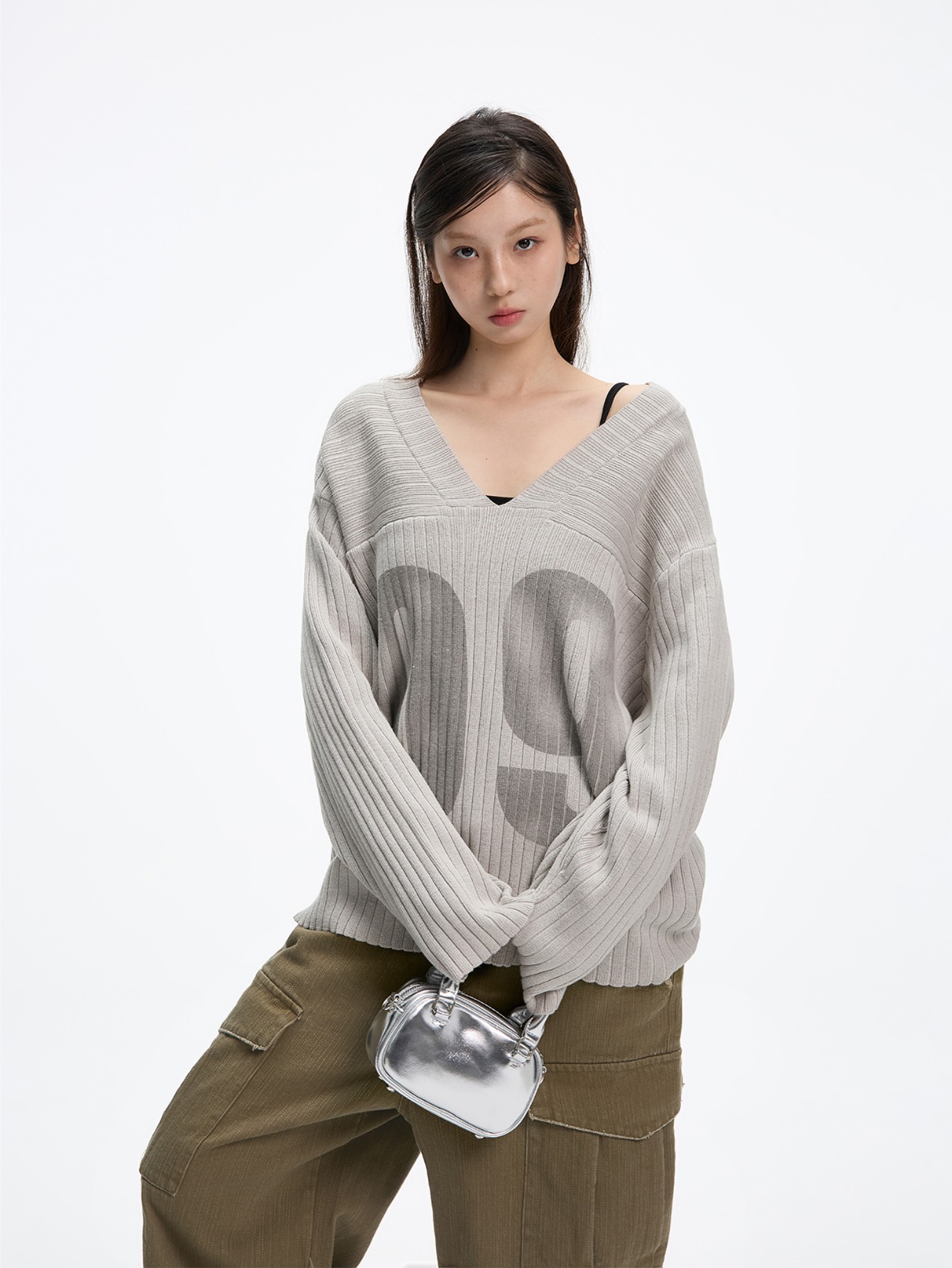Jumpnext Retro Loose Design Digital Print V-Neck Sweater Knitted Long-Sleeved Jersey Off-Shoulder Top