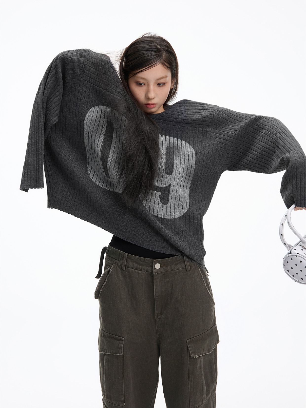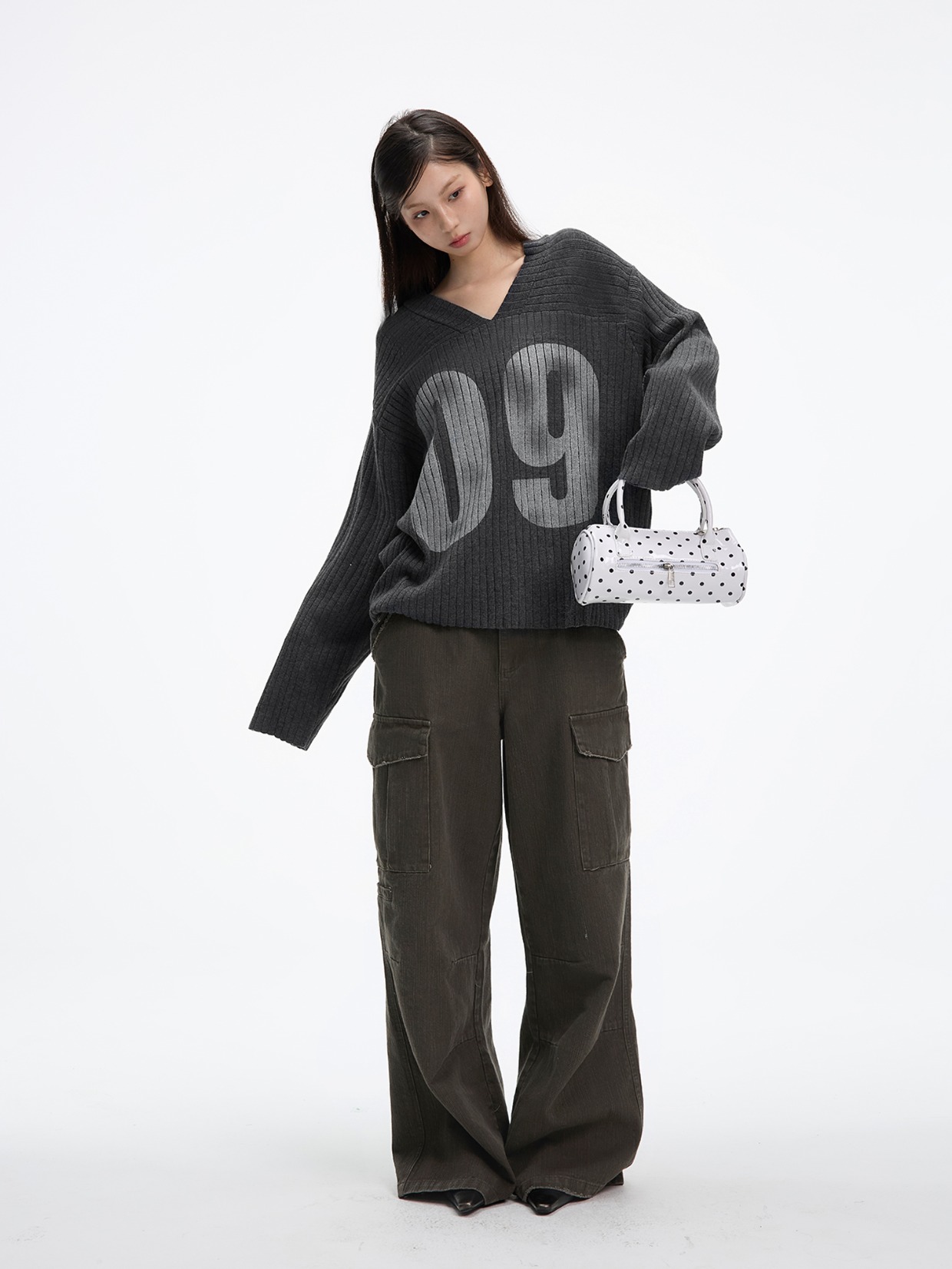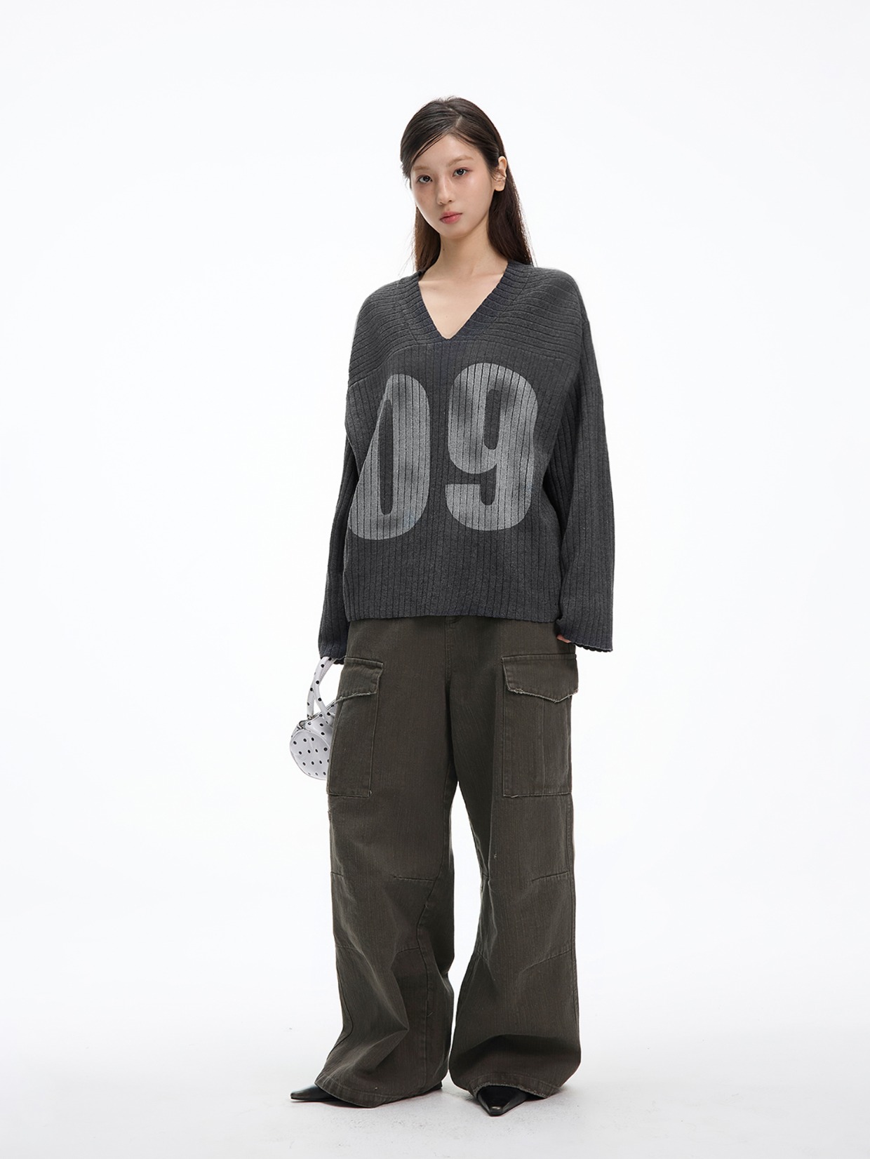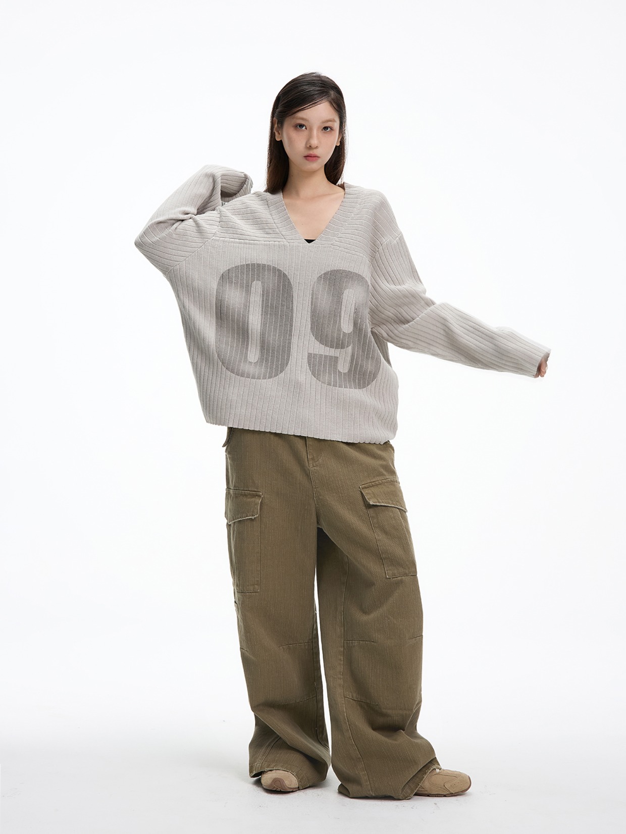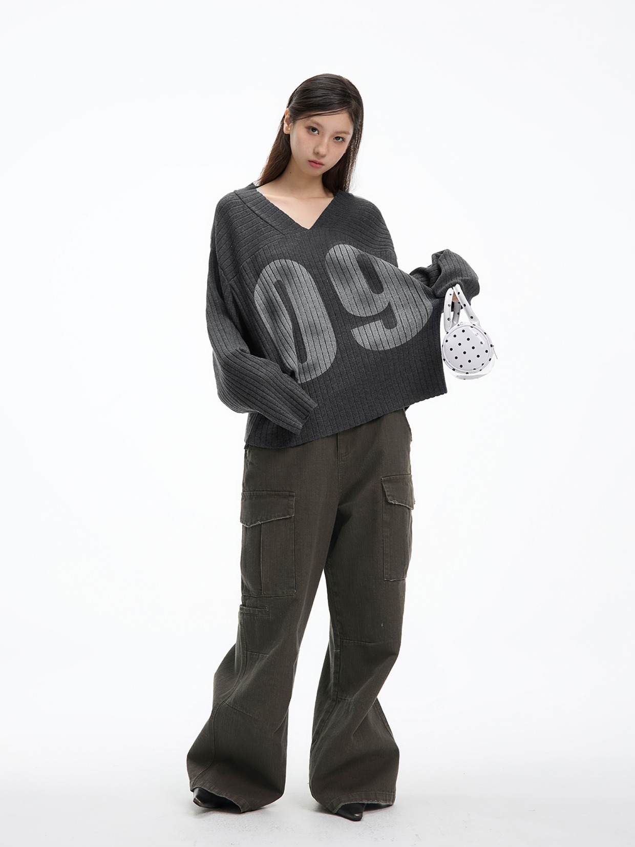 Jumpnext Retro Loose Design Digital Print V-Neck Sweater Knitted Long-Sleeved Jersey Off-Shoulder Top