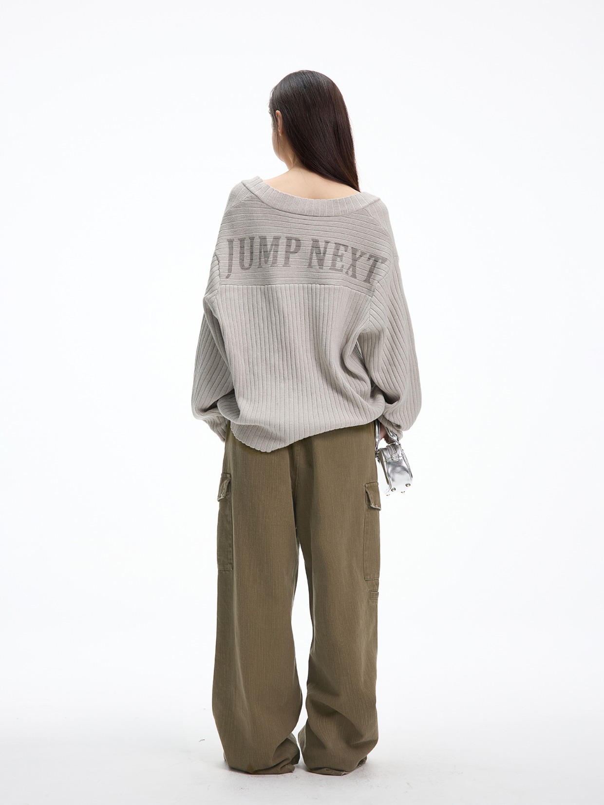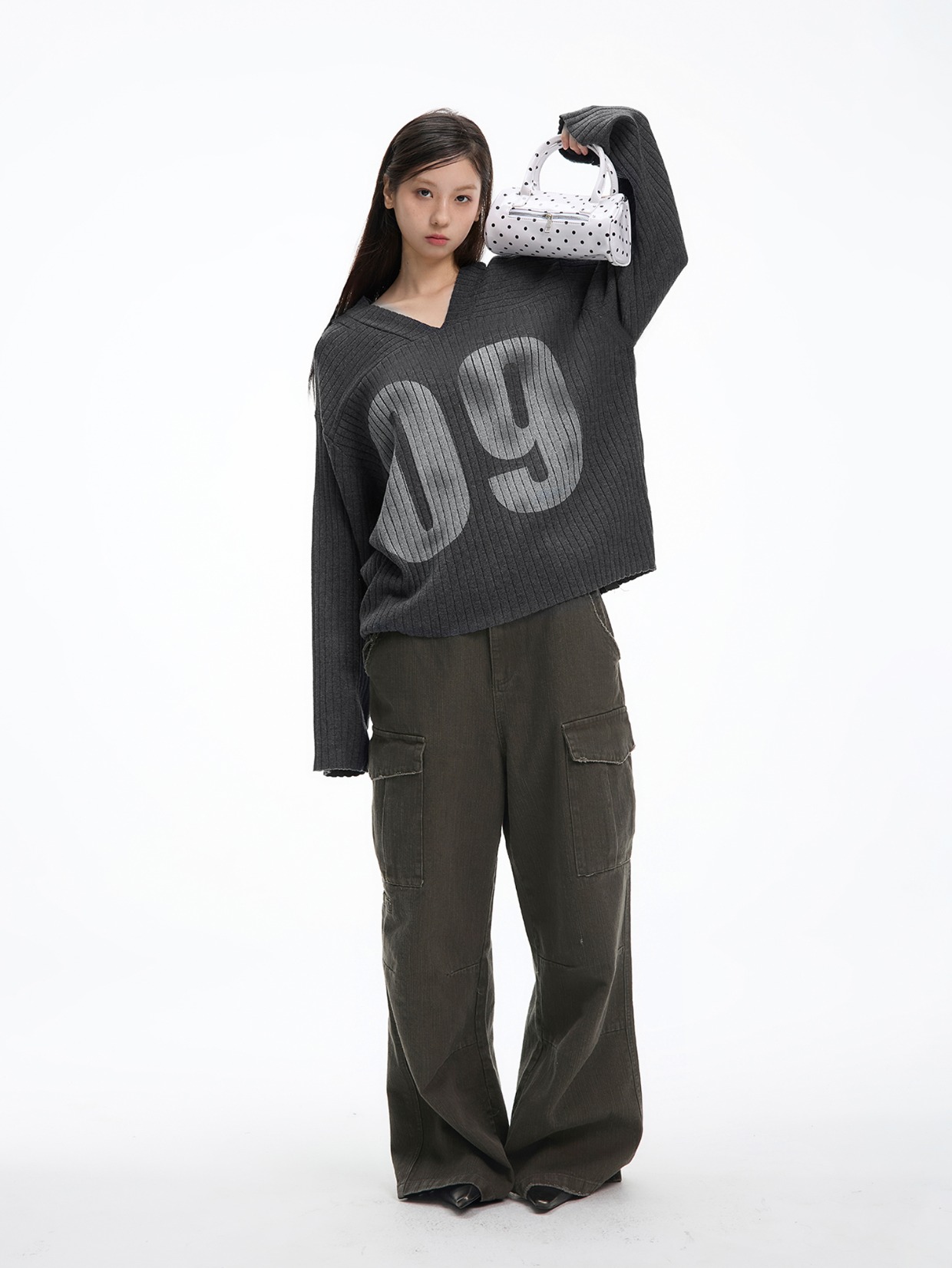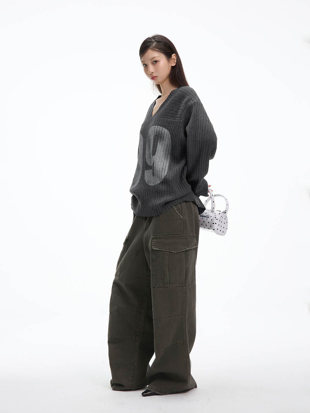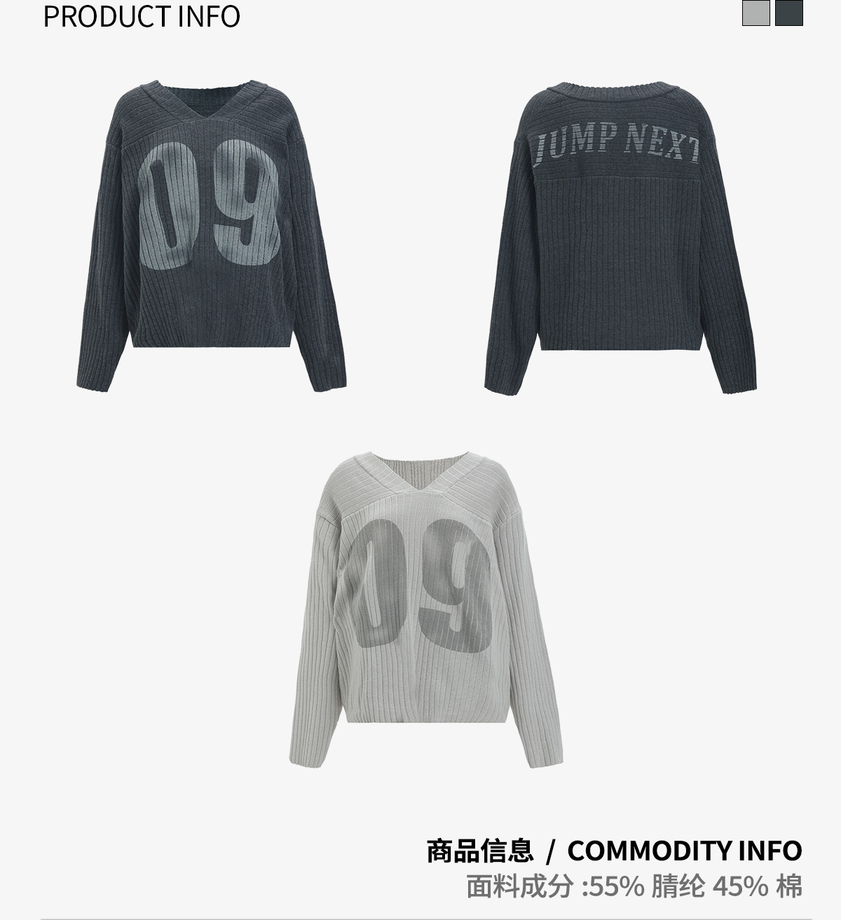 Jumpnext Retro Loose Design Digital Print V-Neck Sweater Knitted Long-Sleeved Jersey Off-Shoulder Top